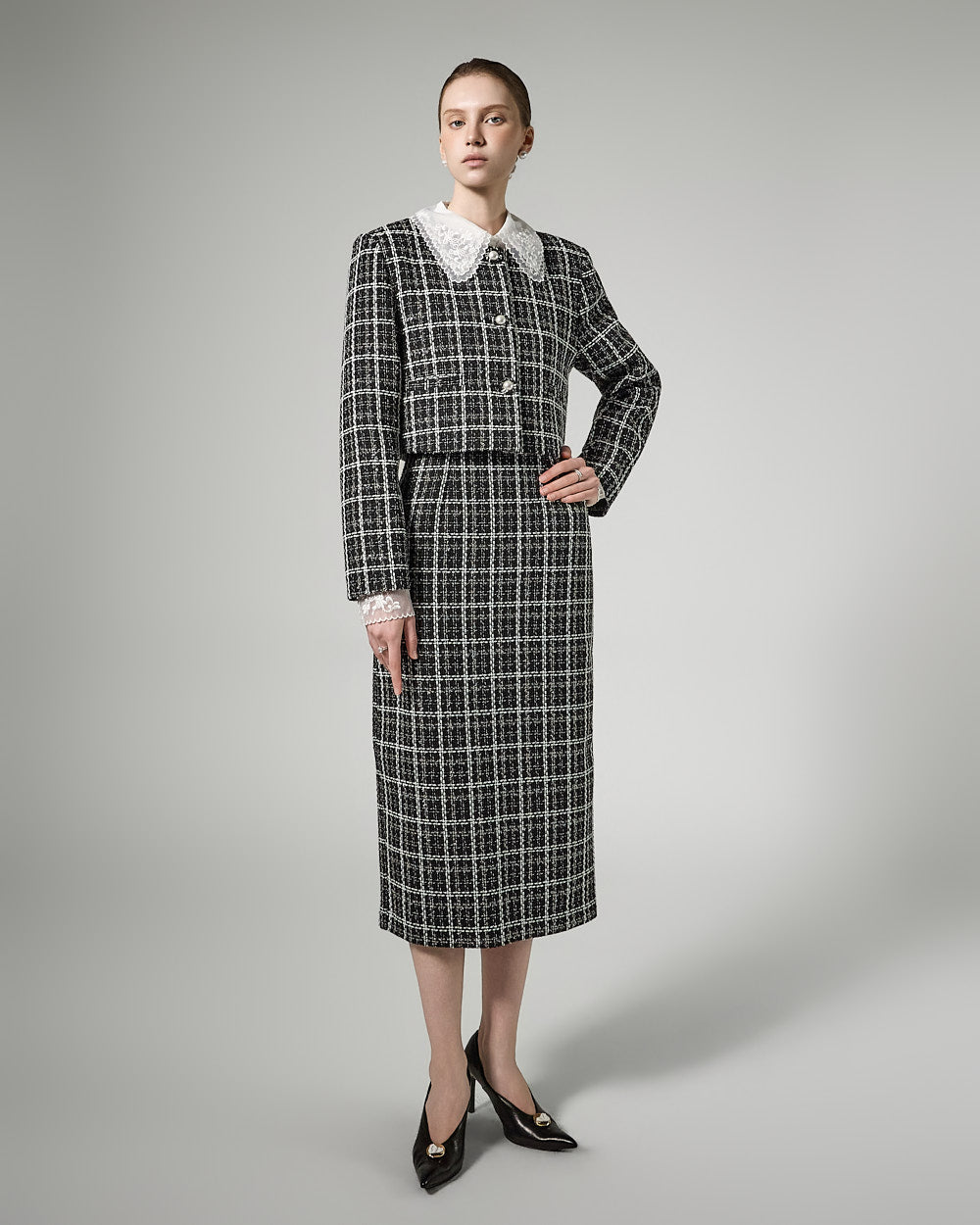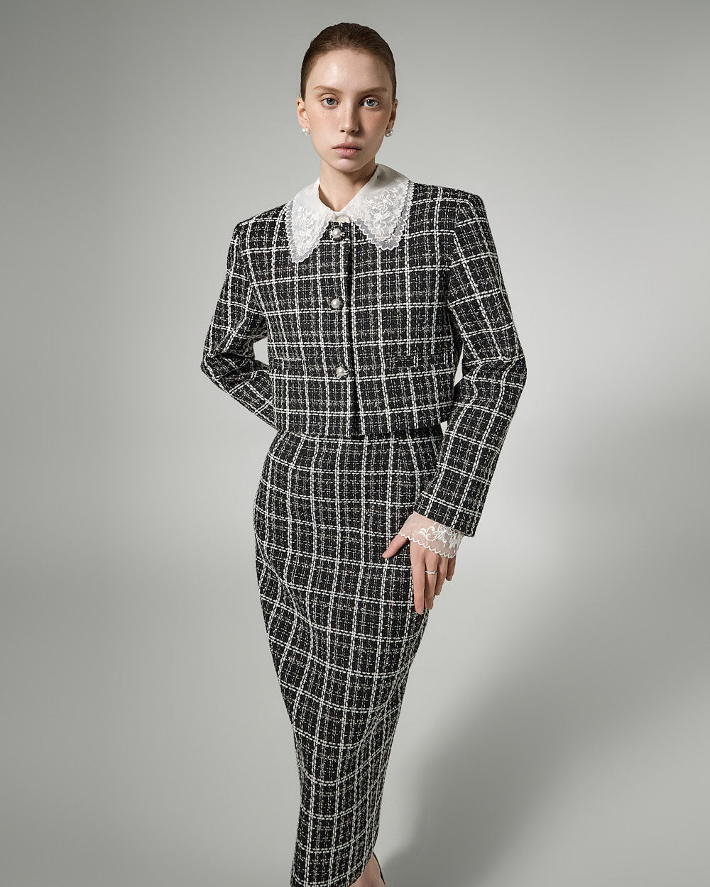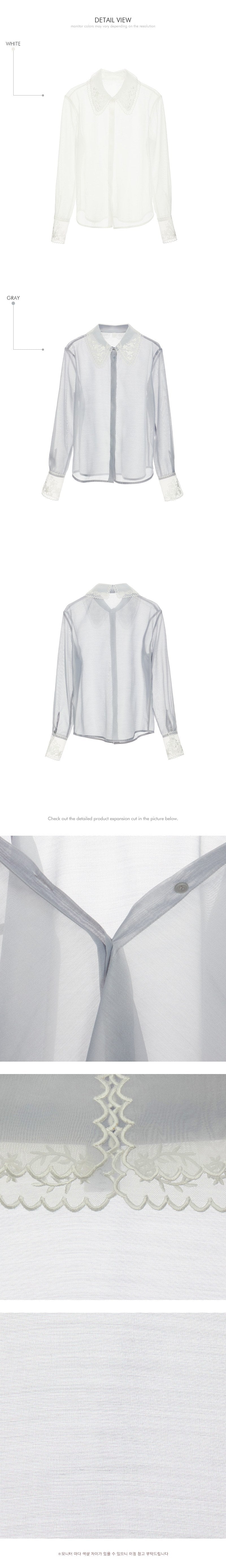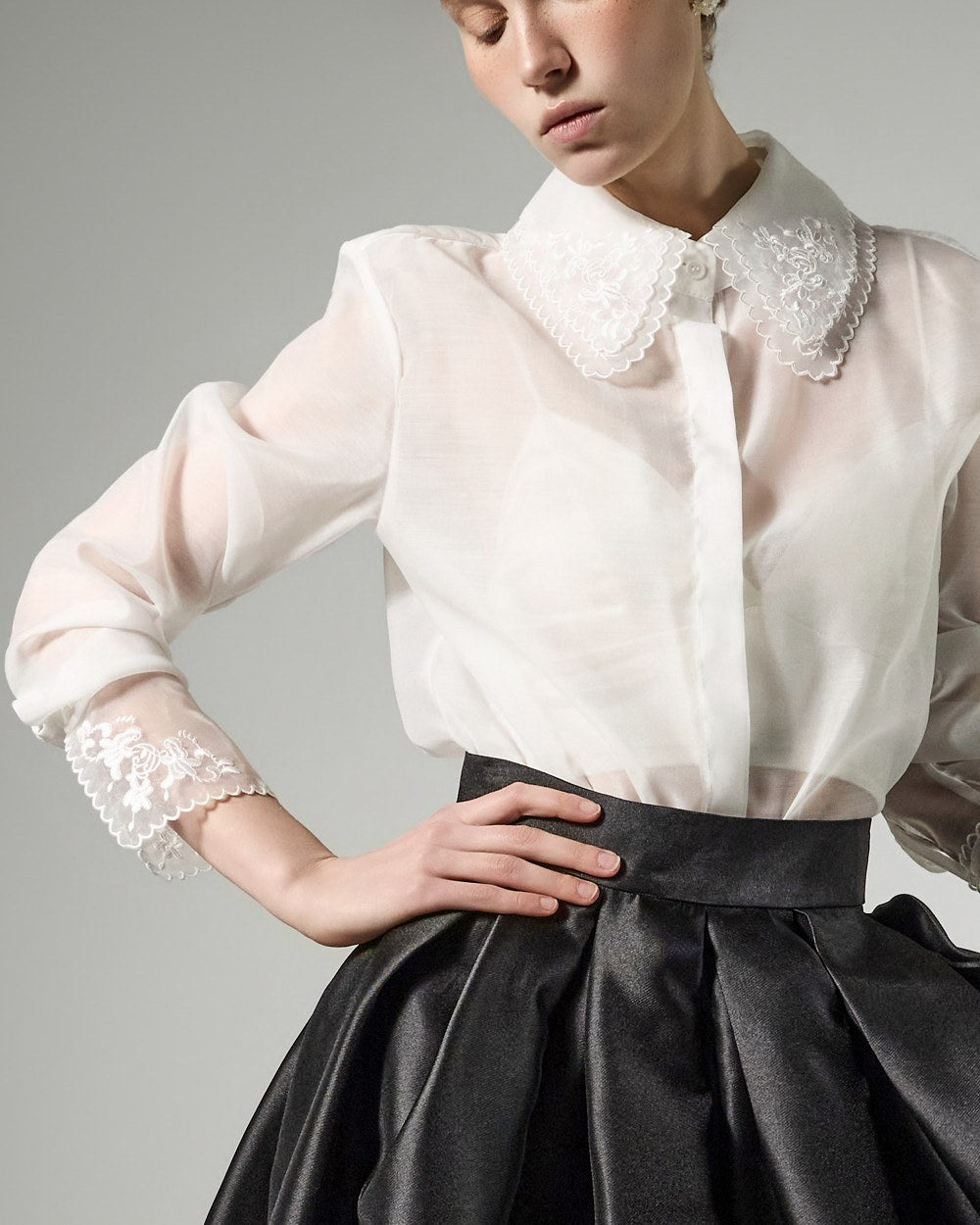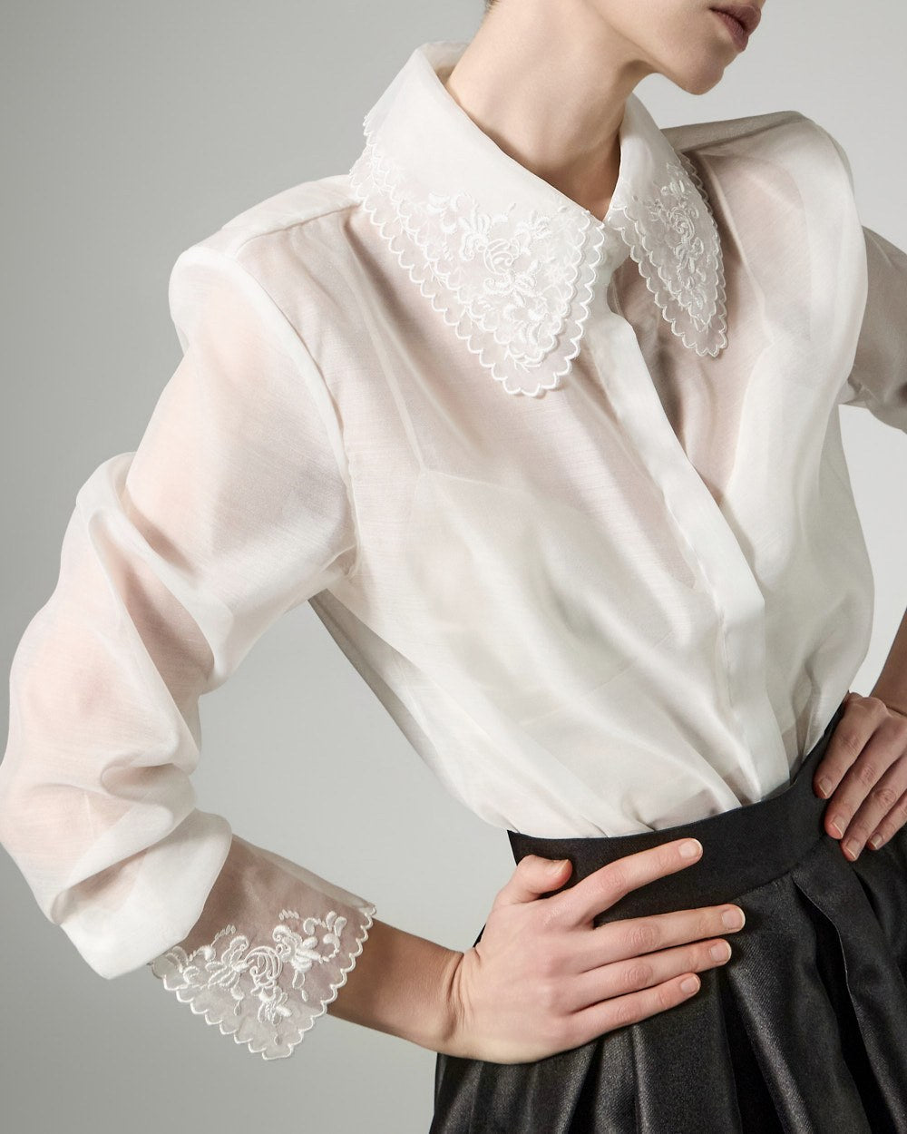 レースの刺繍があしらわれたダブルカラーとカフスのディテールが