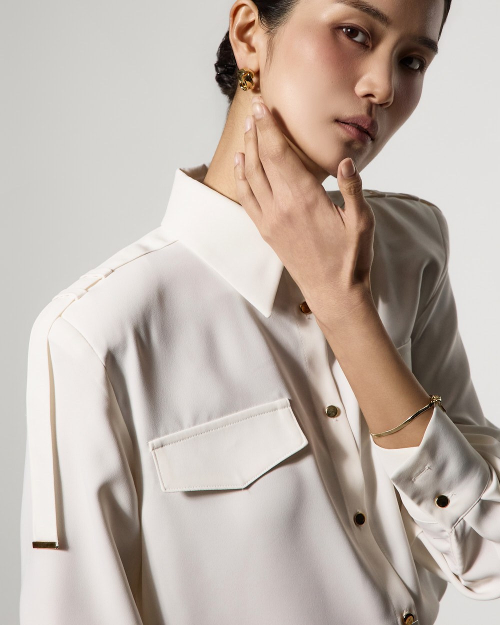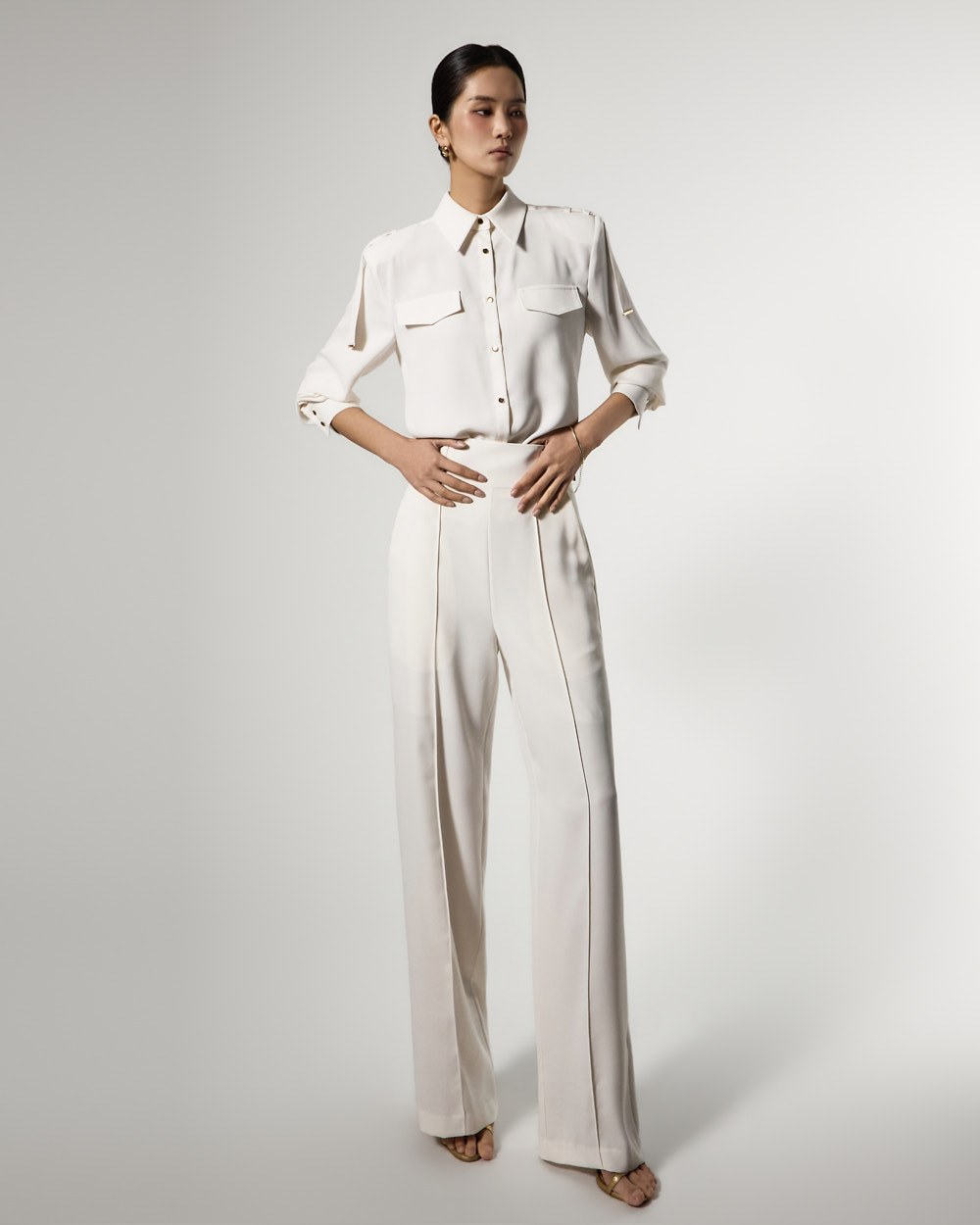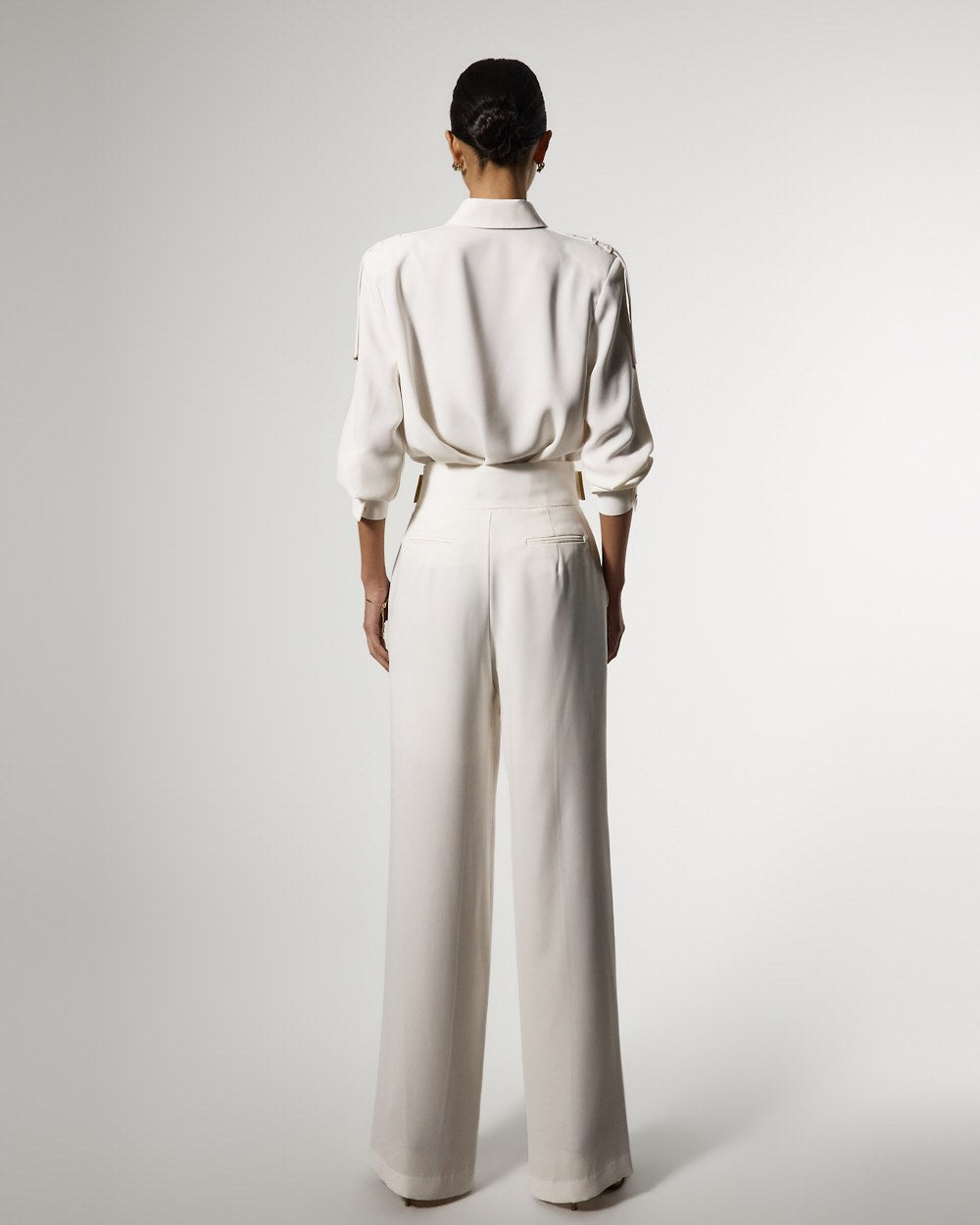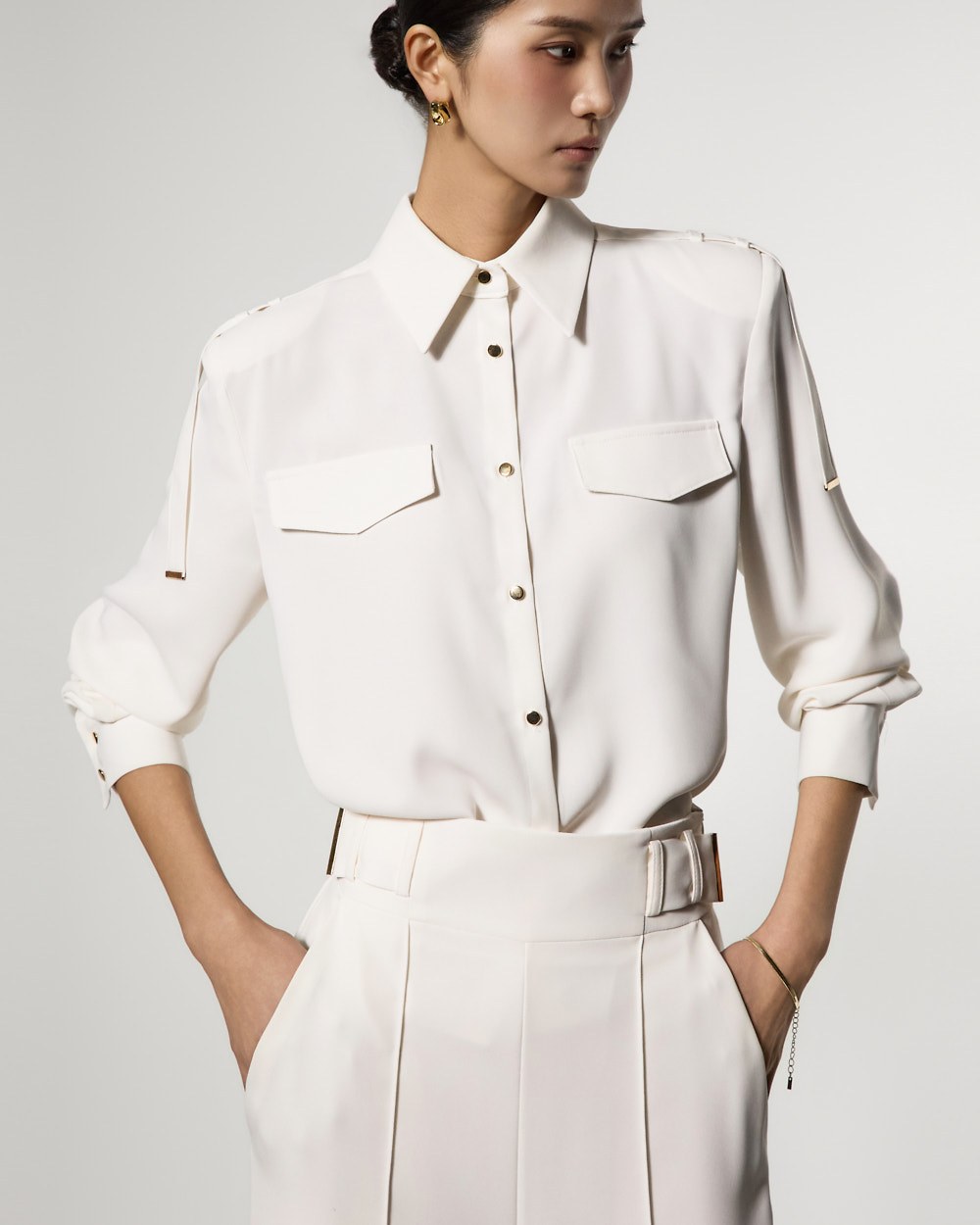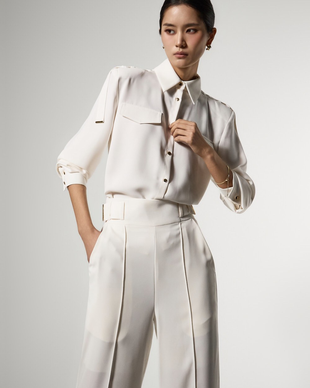 袖にあしらわれた2つのバックルとピンタックプリーツディテールが構築的なシルエットを完成させ、