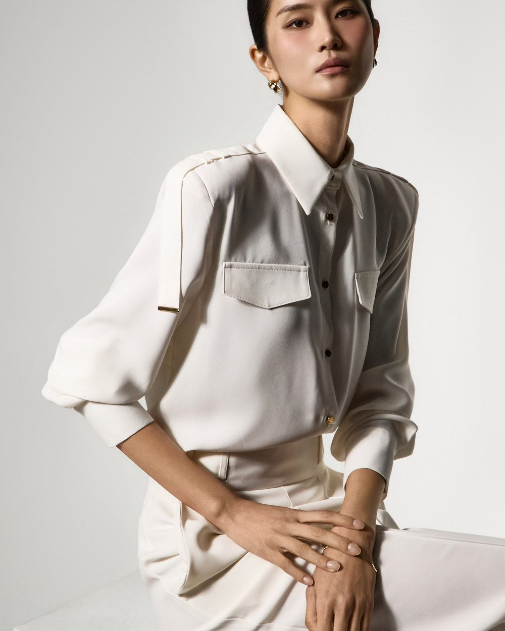 現代的で洗練された印象のブラウス。