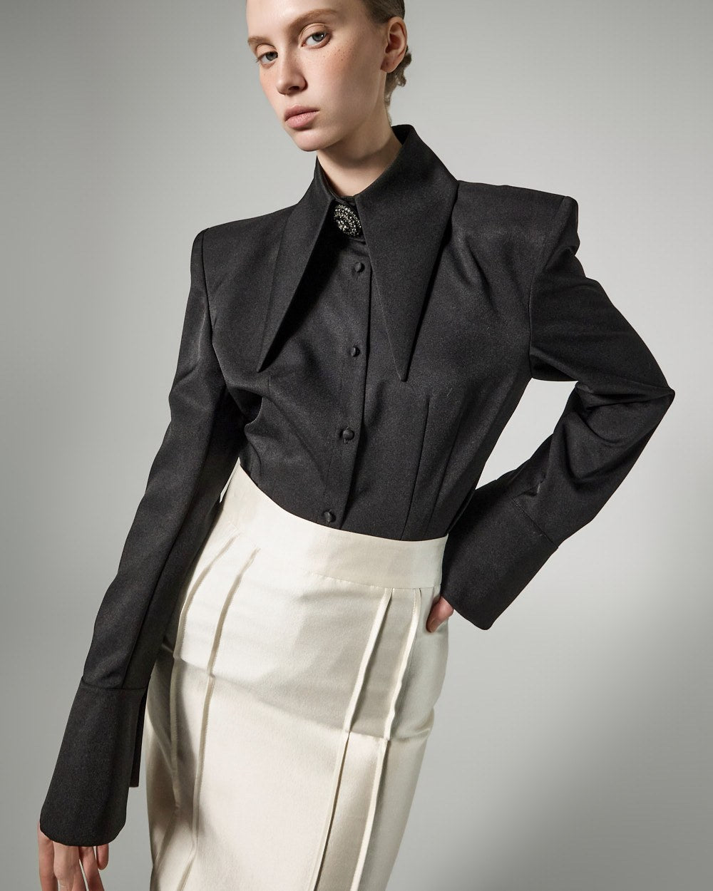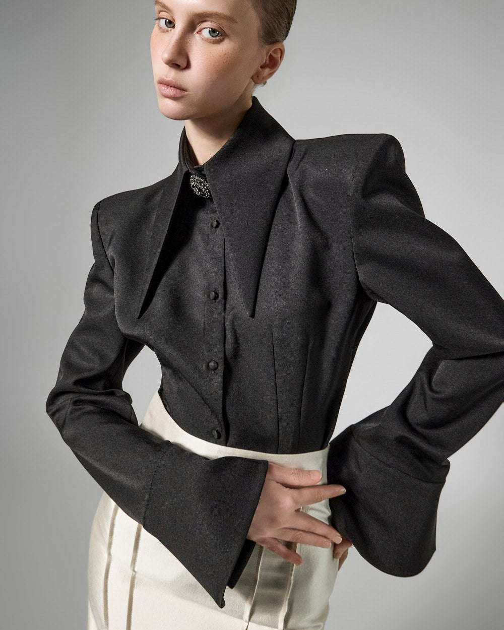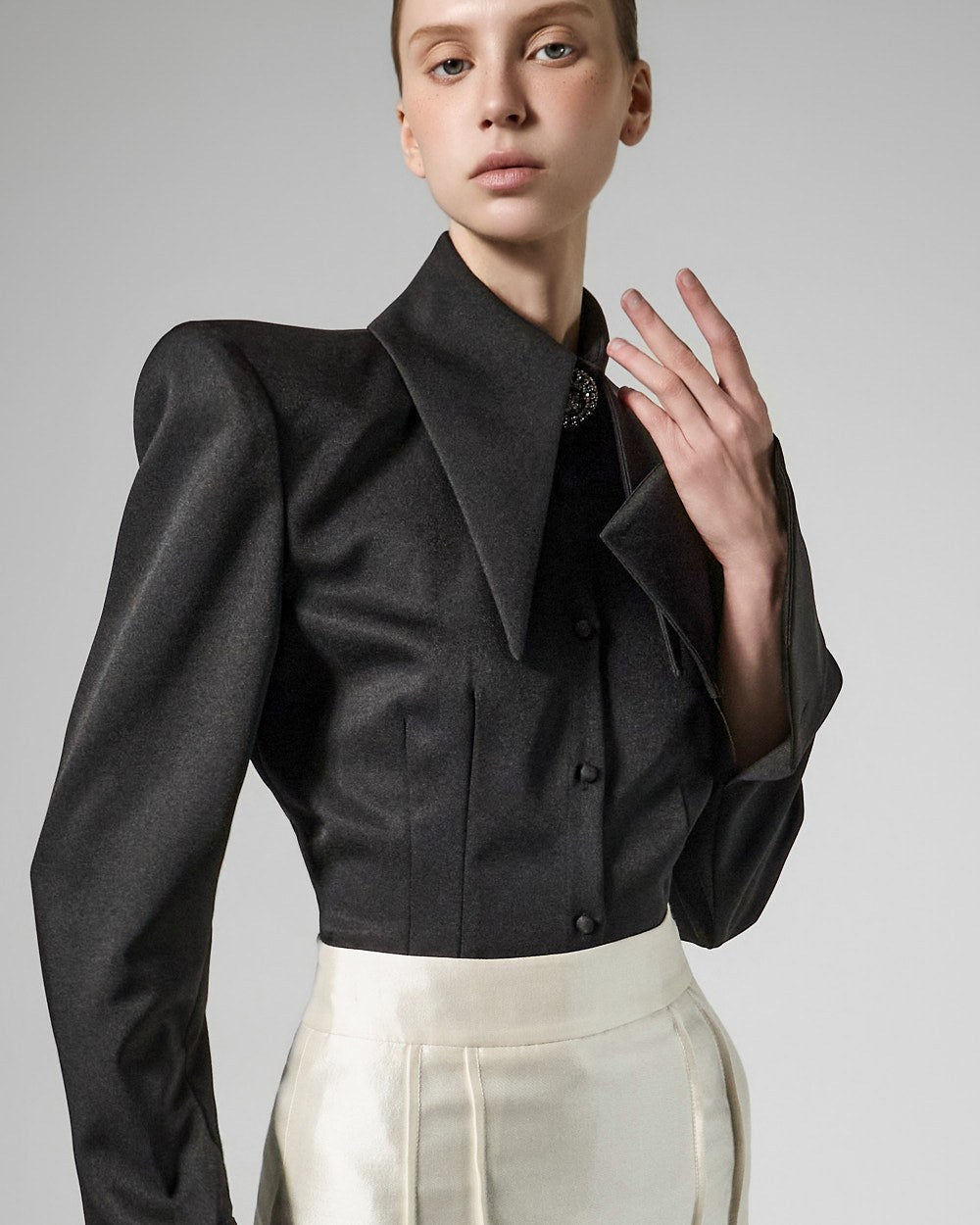 while the large collar detailing creates a sophisticated face line,
