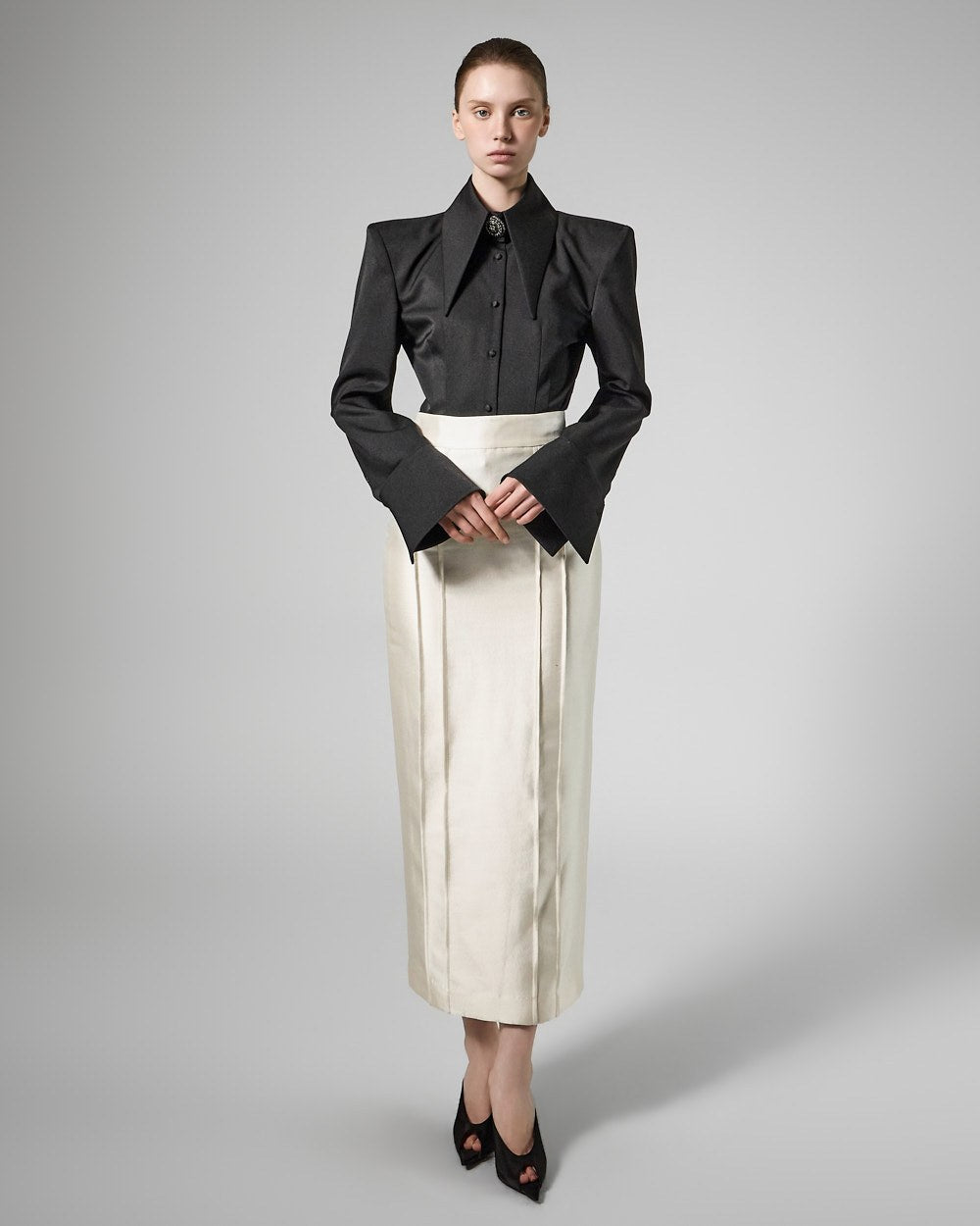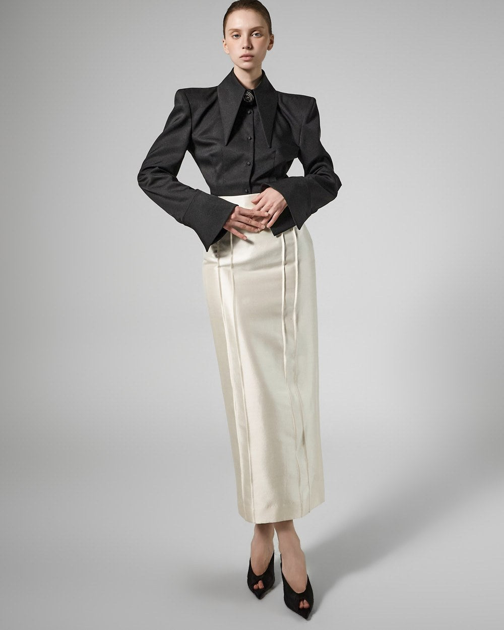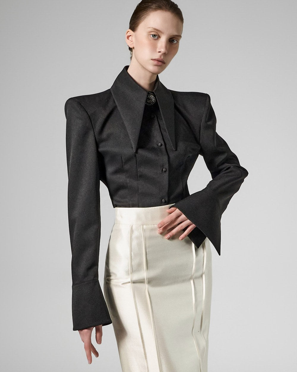 while the large collar detailing creates a sophisticated face line,