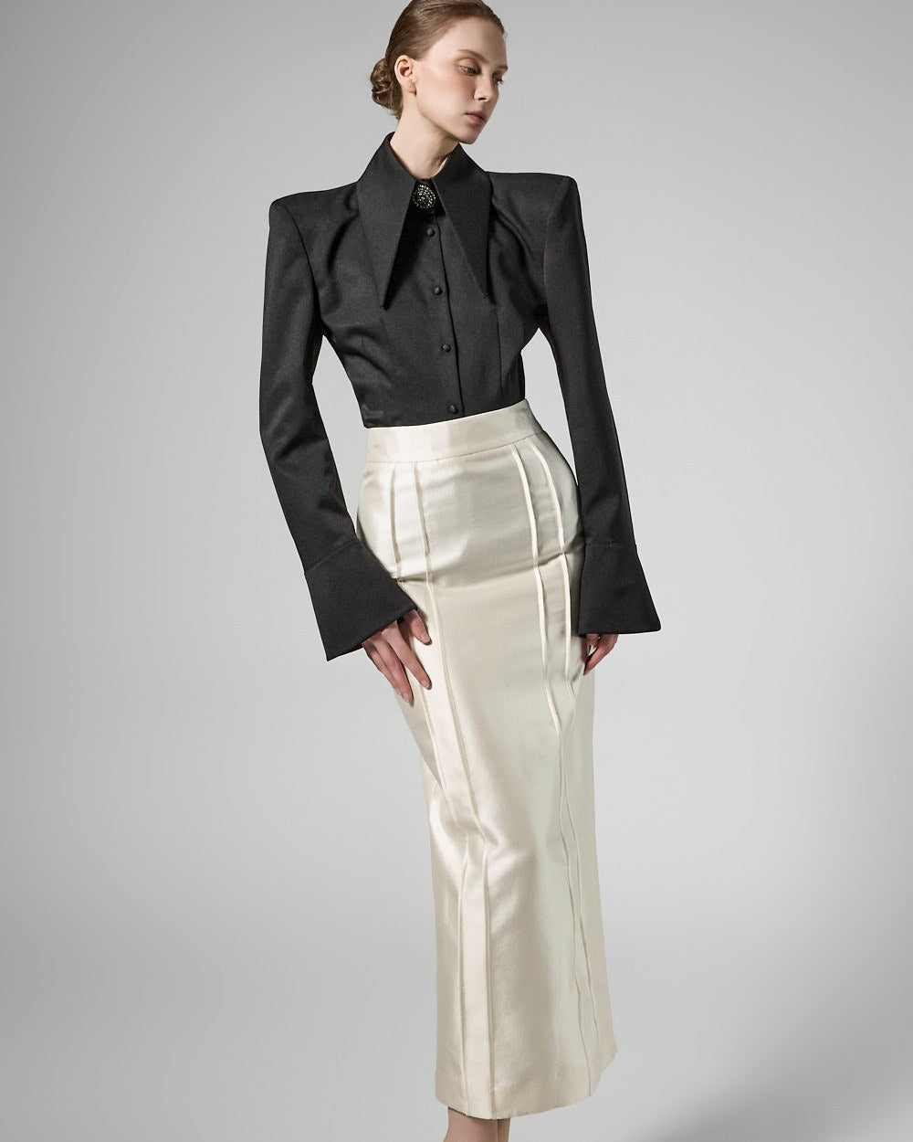 and the neckline brooch accentuates