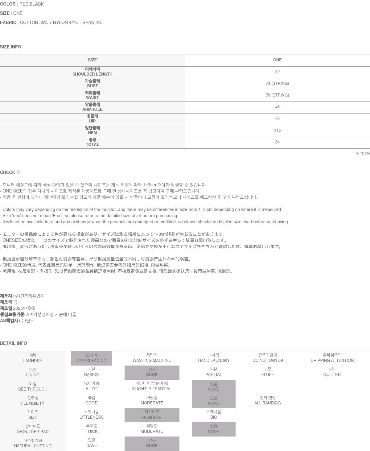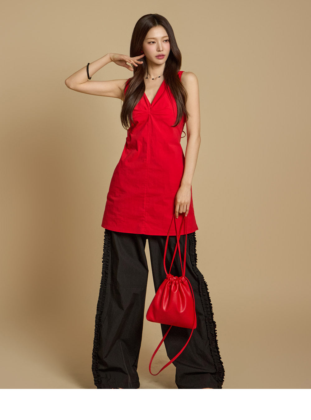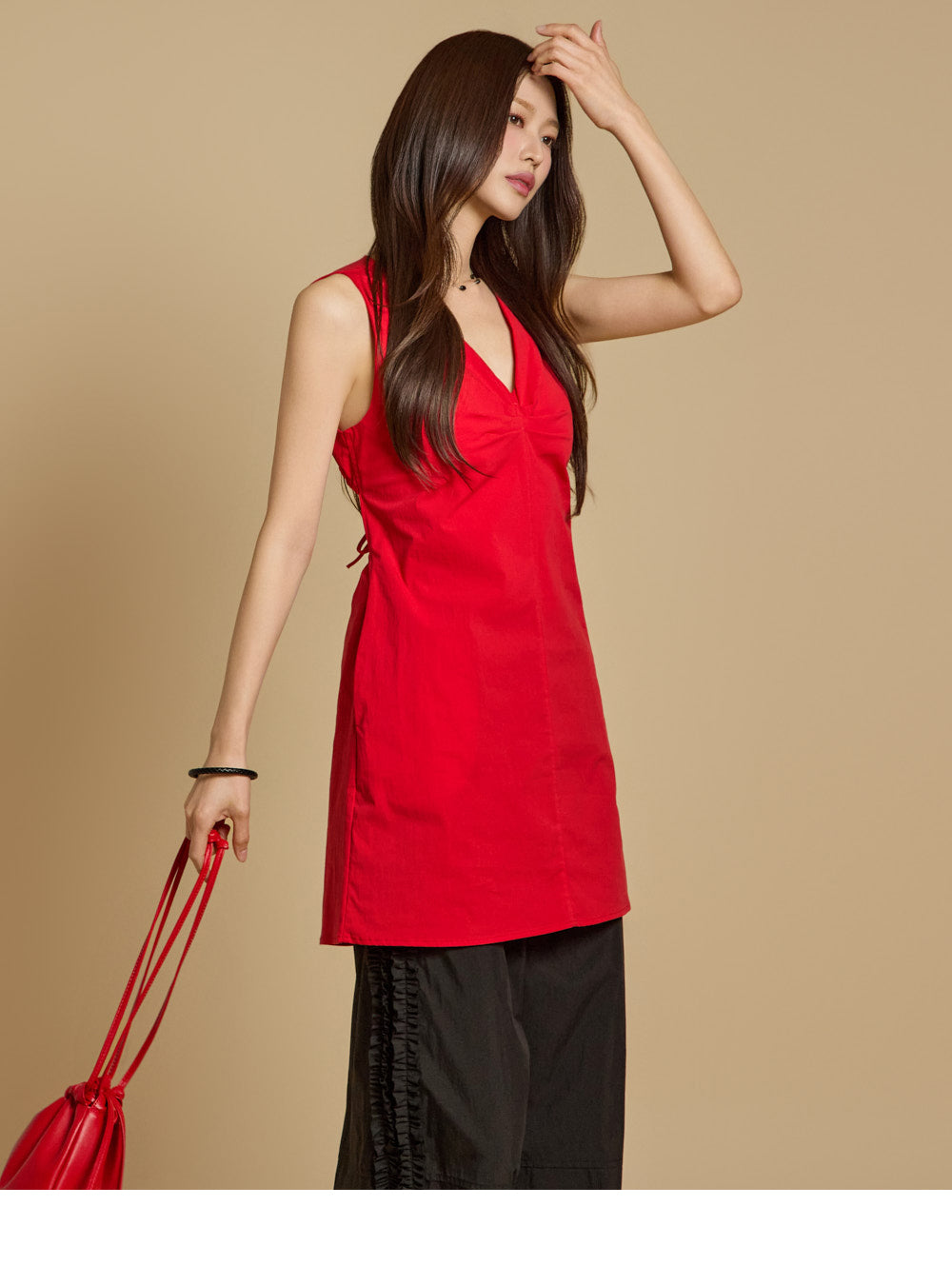 モデルの身長は171cm、REDのワンサイズを着用しています。