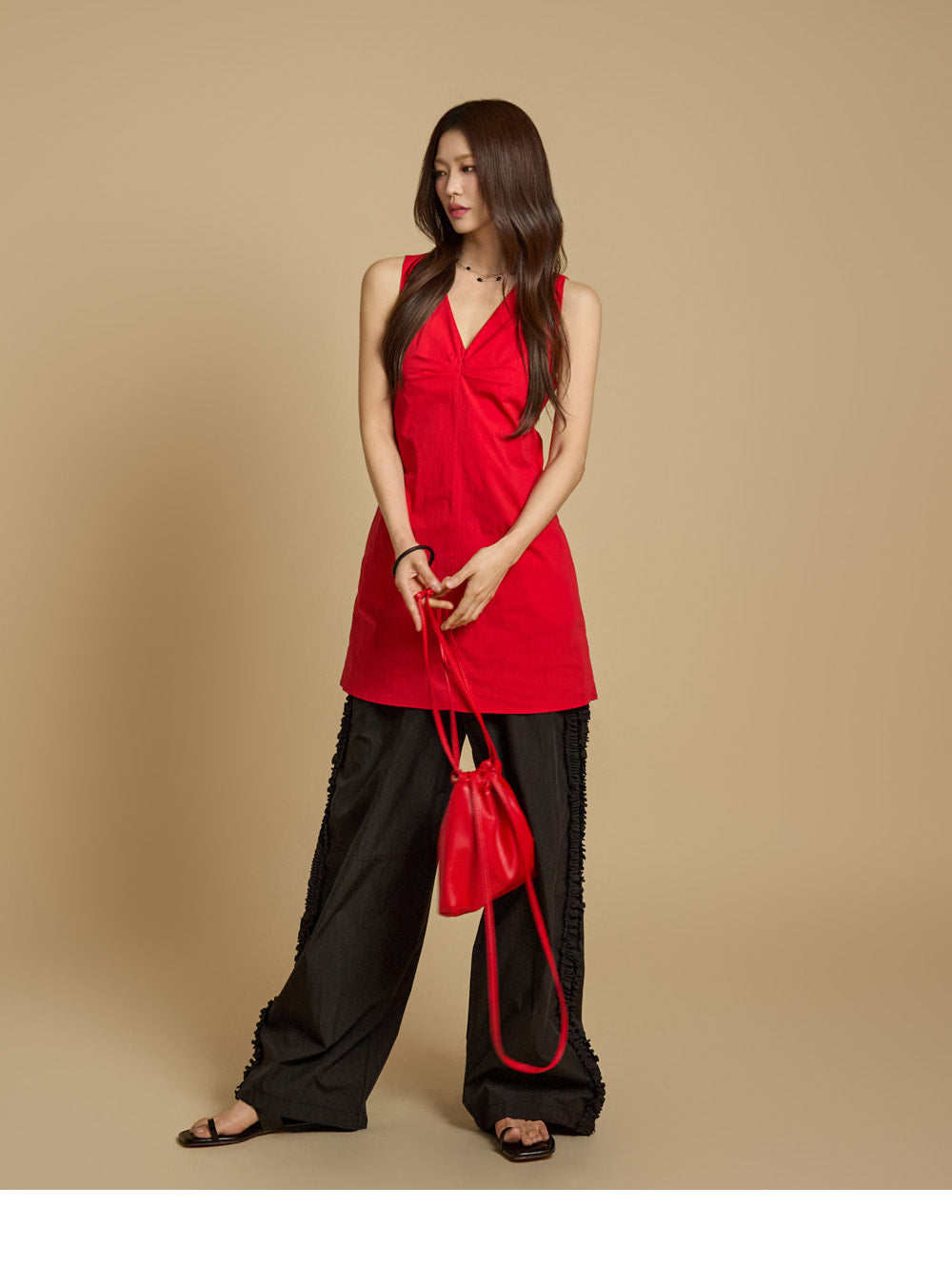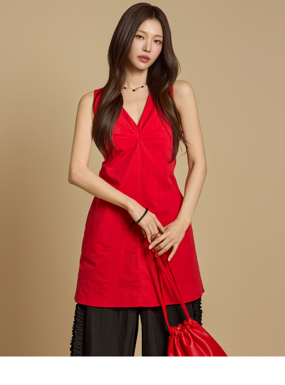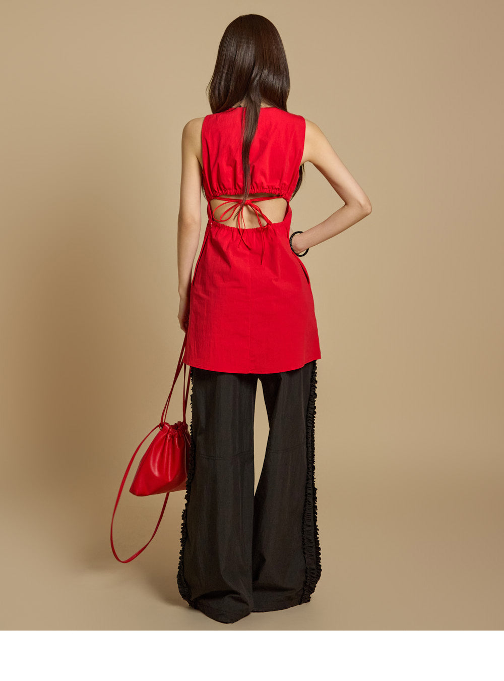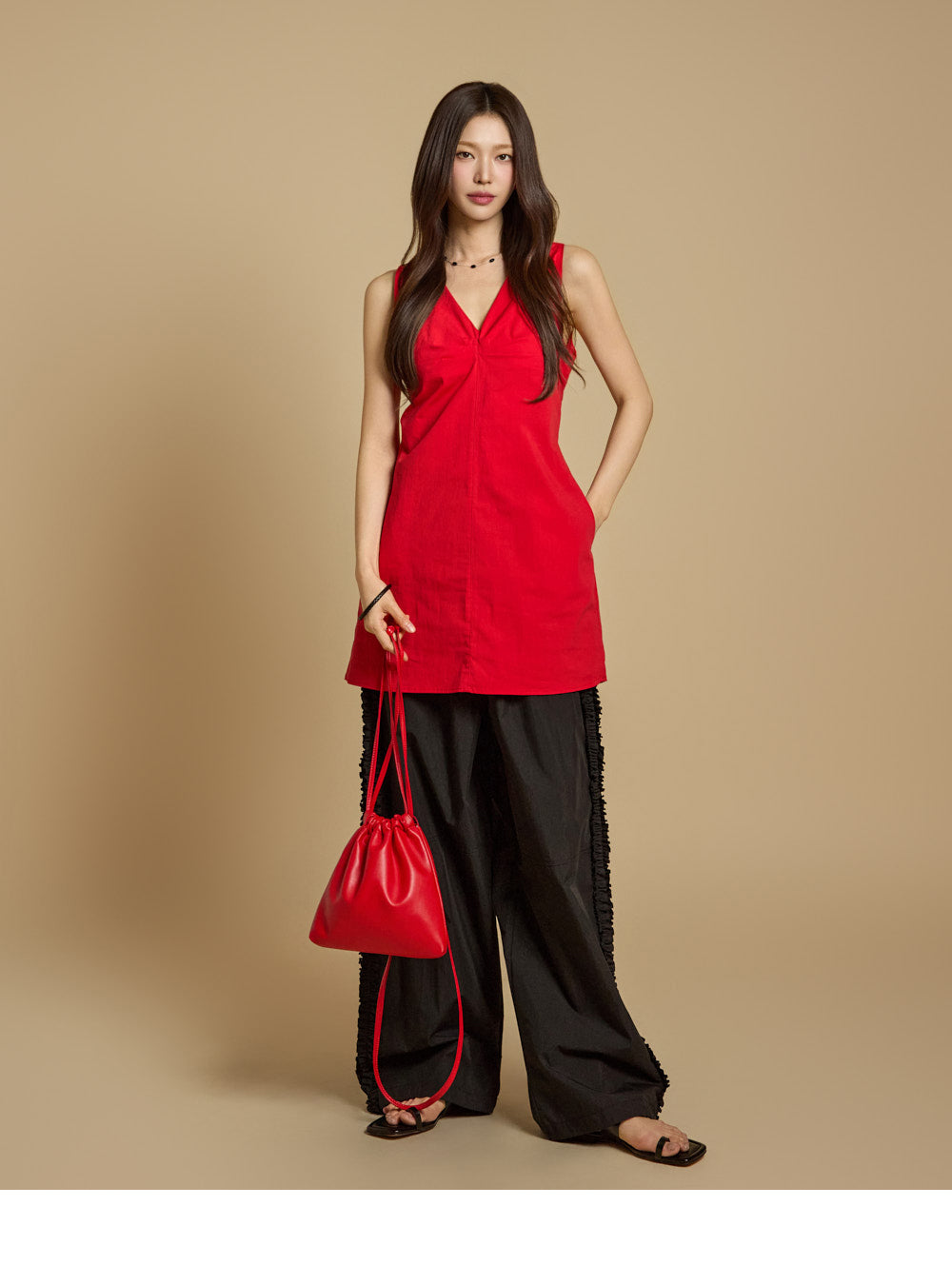 モデルの身長は171cm、REDのワンサイズを着用しています。