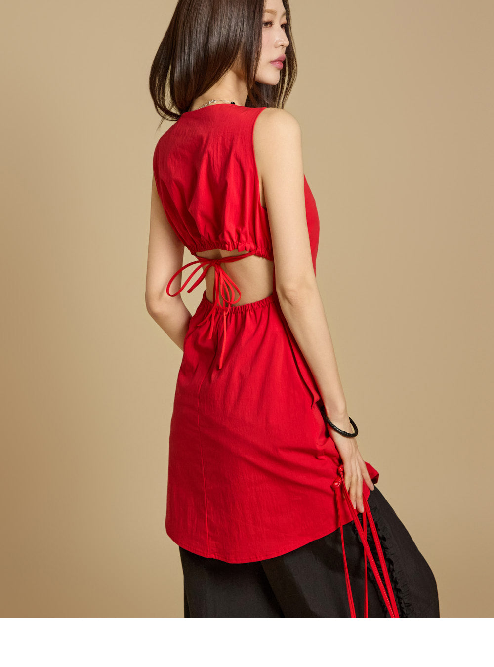 ミニ丈とバックオープンのディテールが、活気のあるスタイリッシュなルックスを演出します。