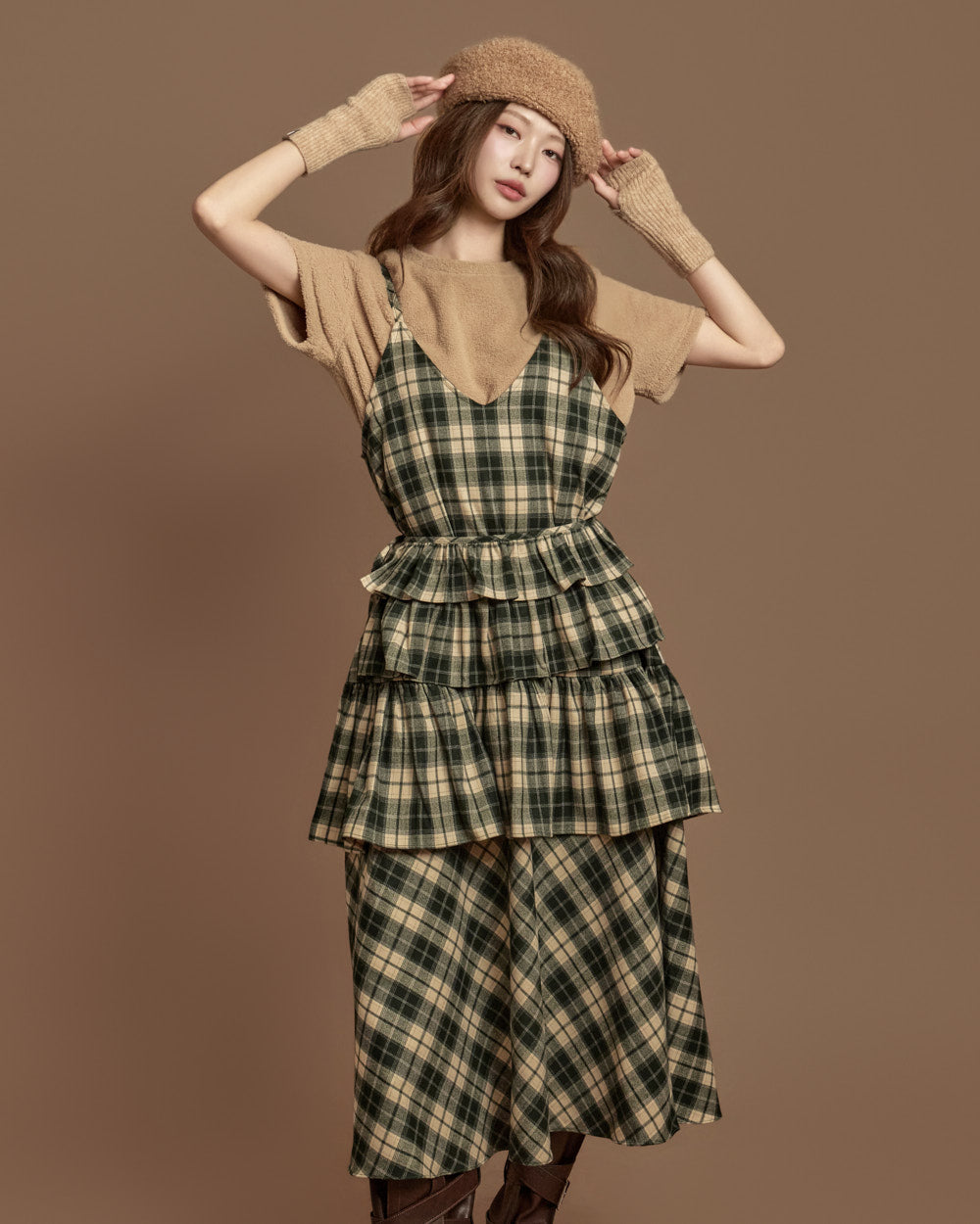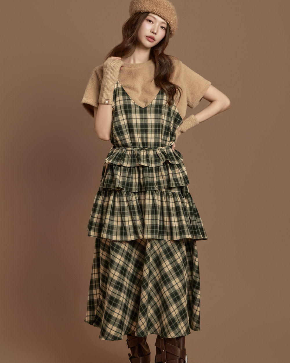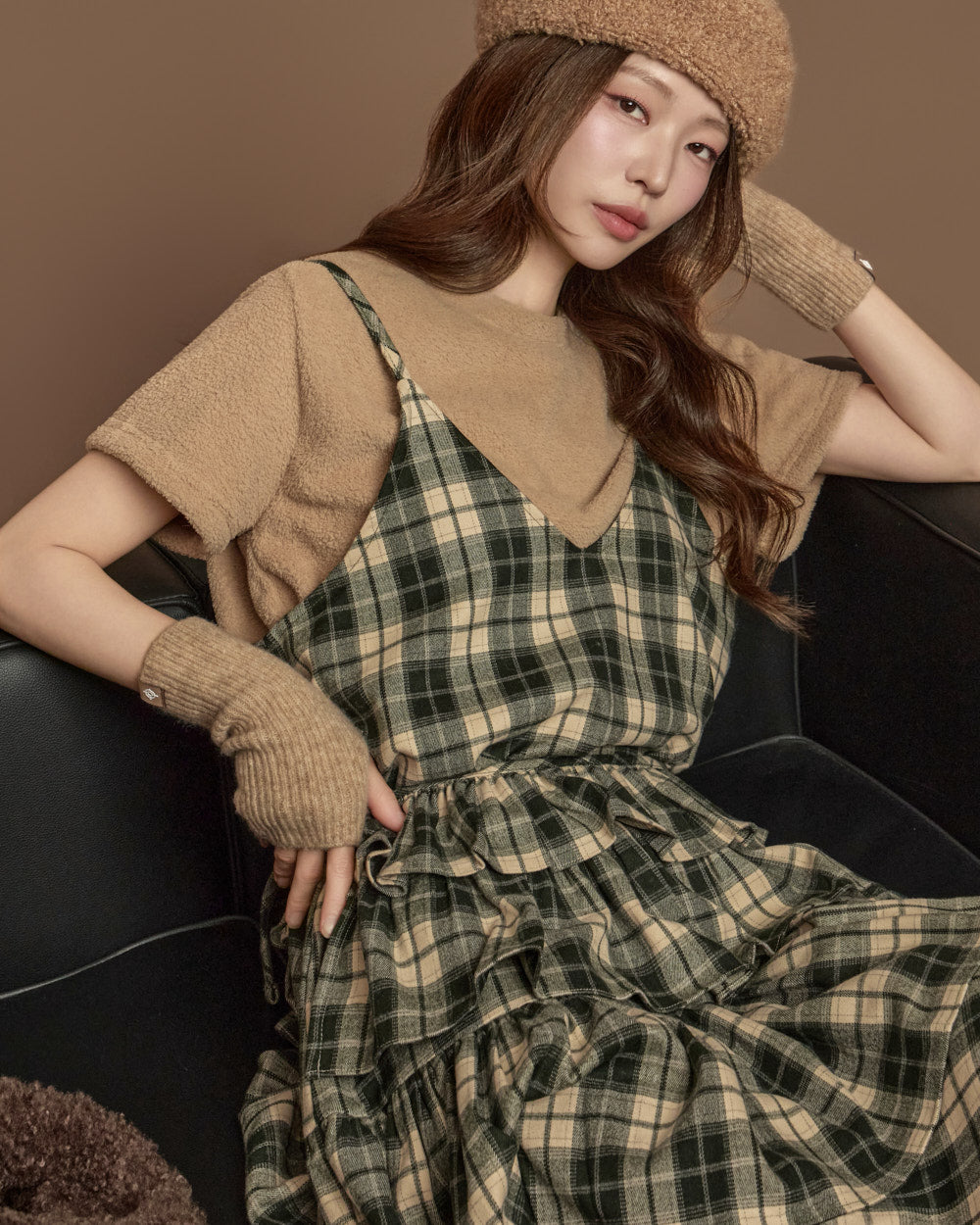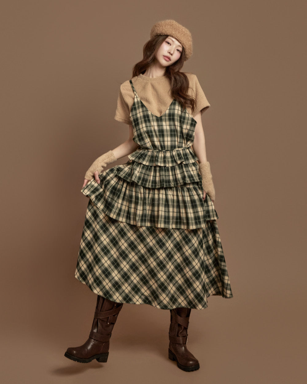 The check-patterned frill skirt and sleeveless dress