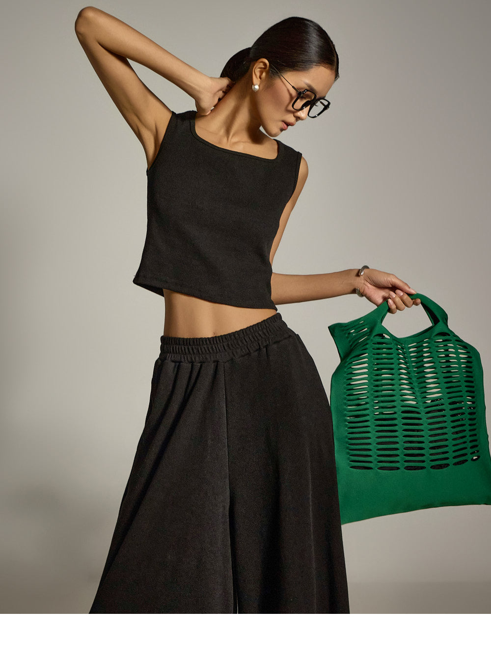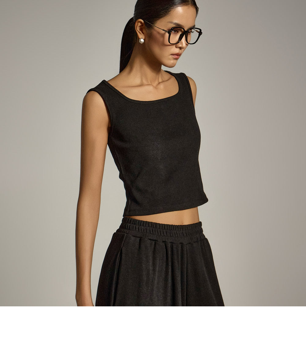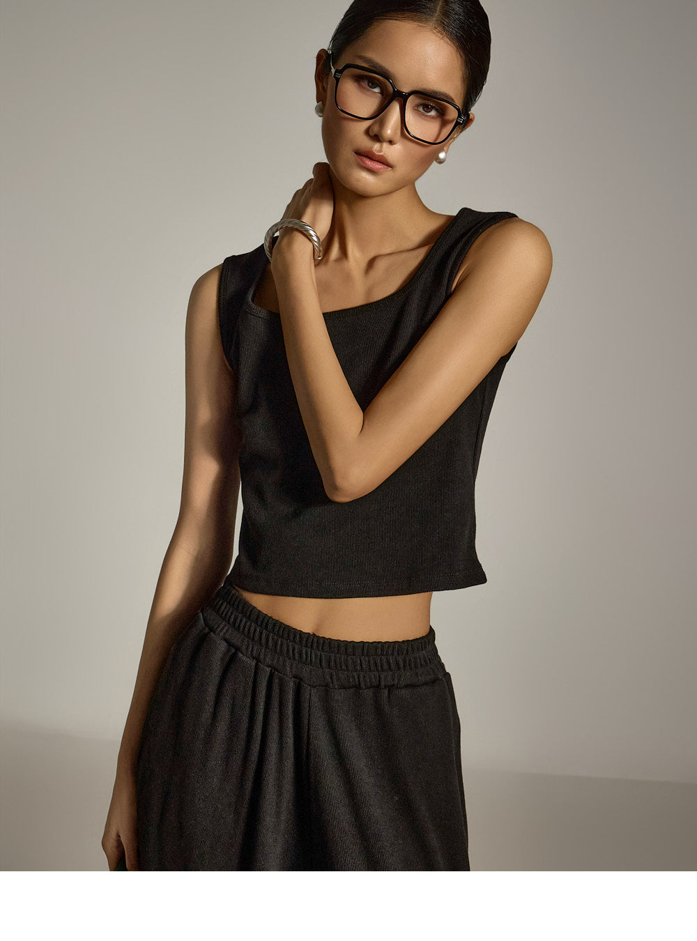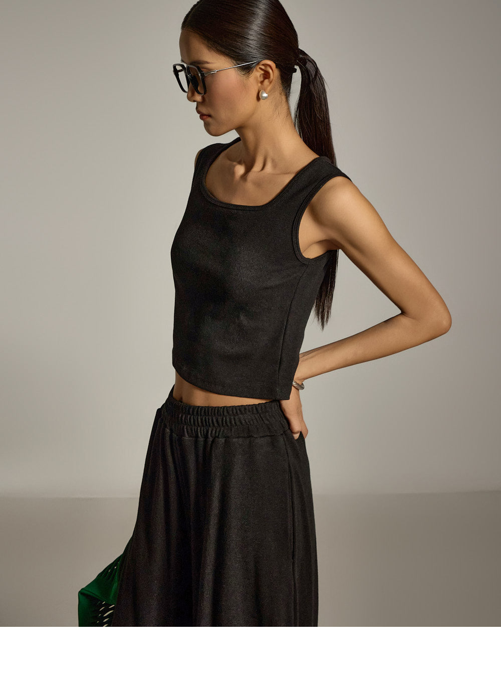 スクエアネックとクロップド丈がシンプルながらもスタイリッシュなシルエットを演出します。