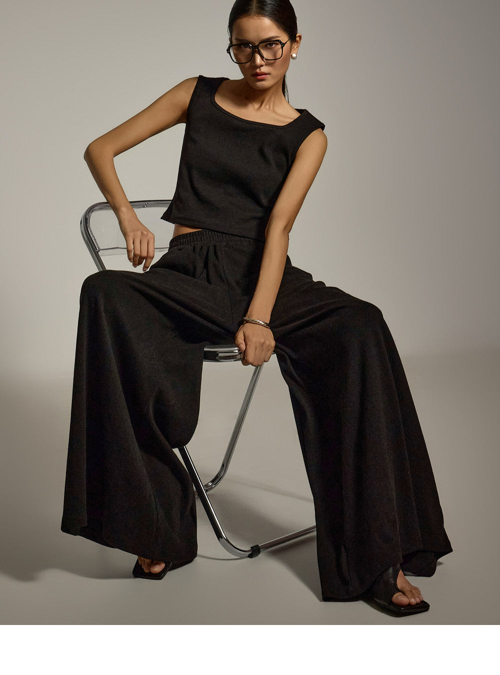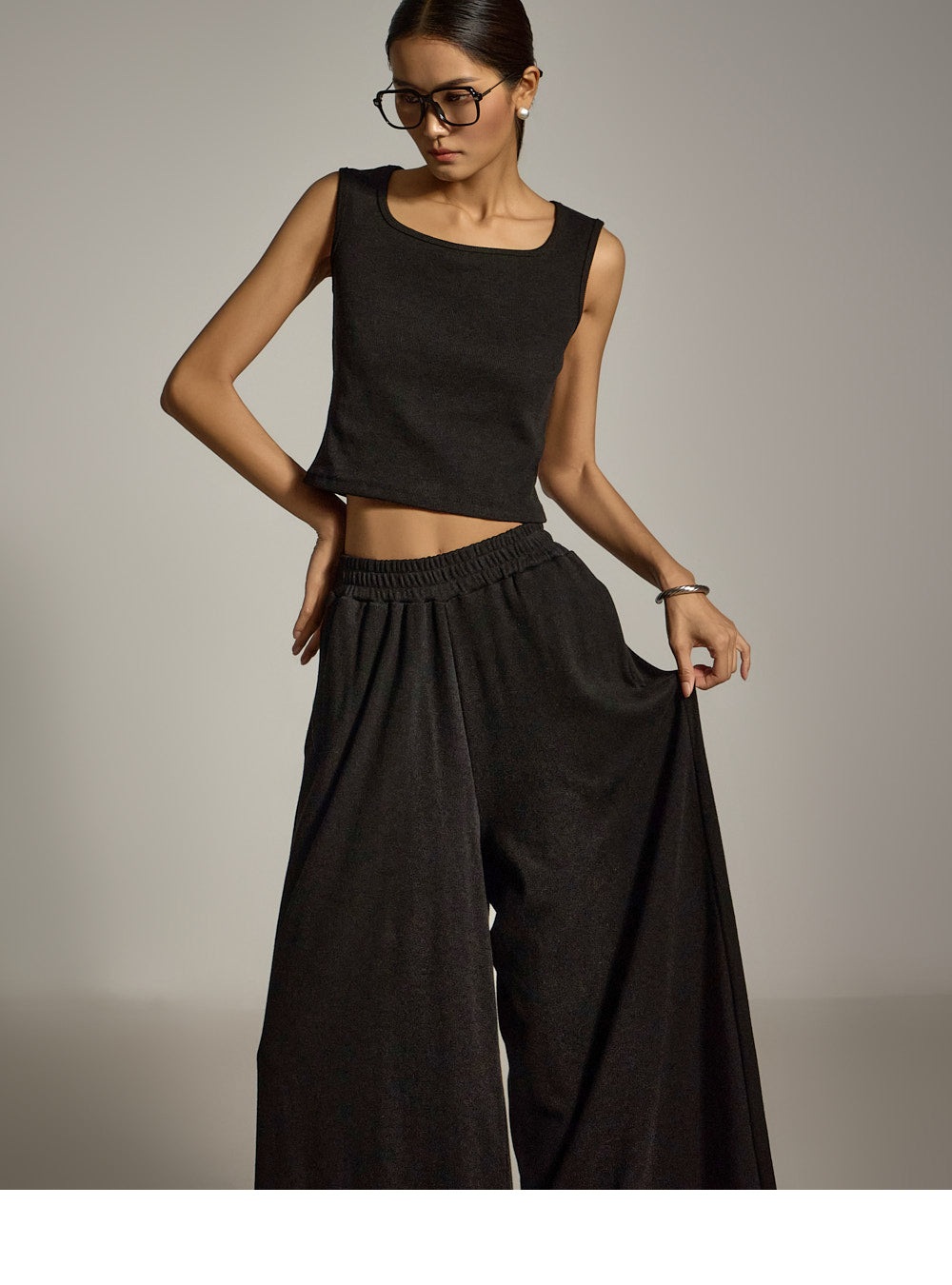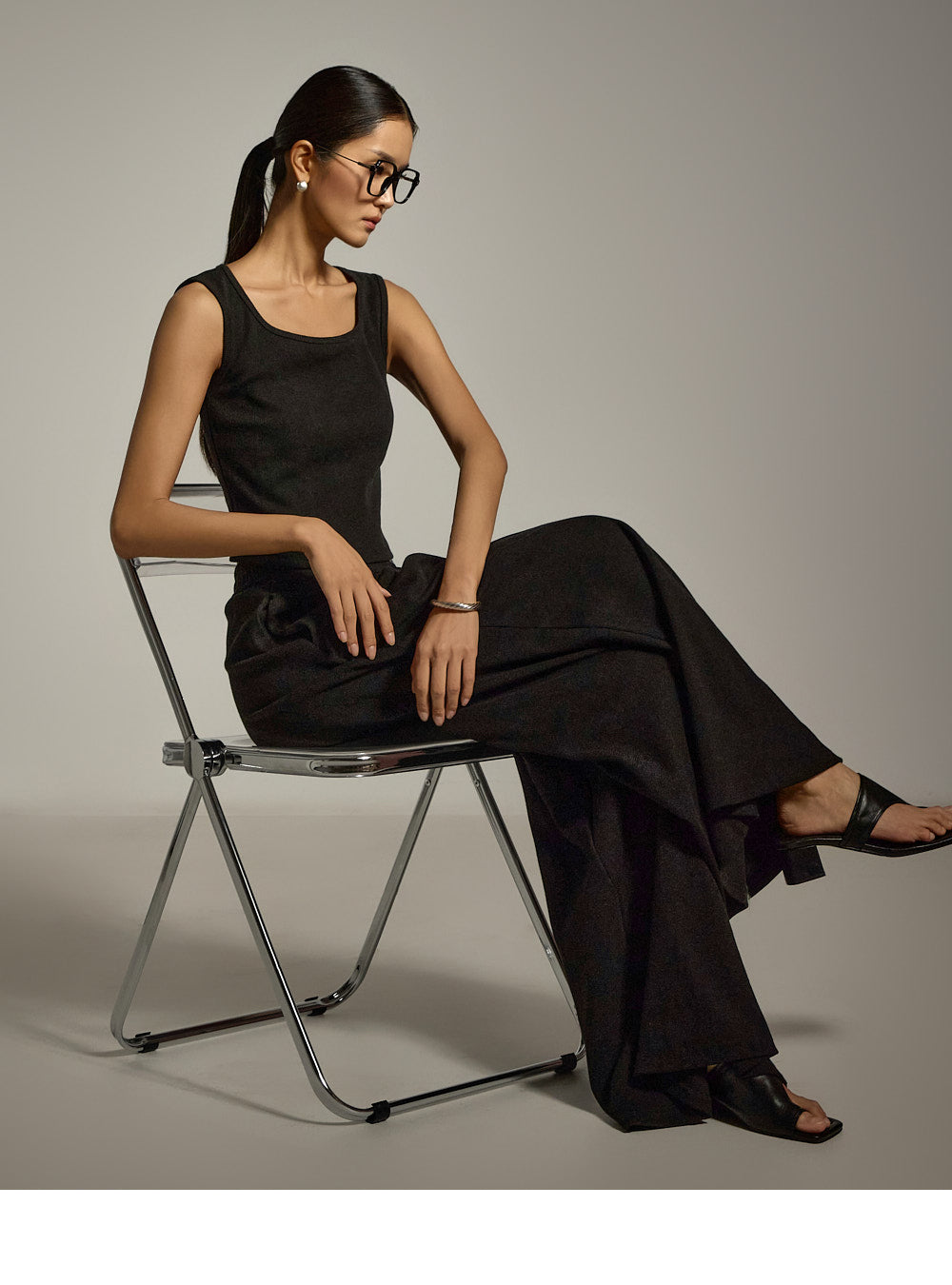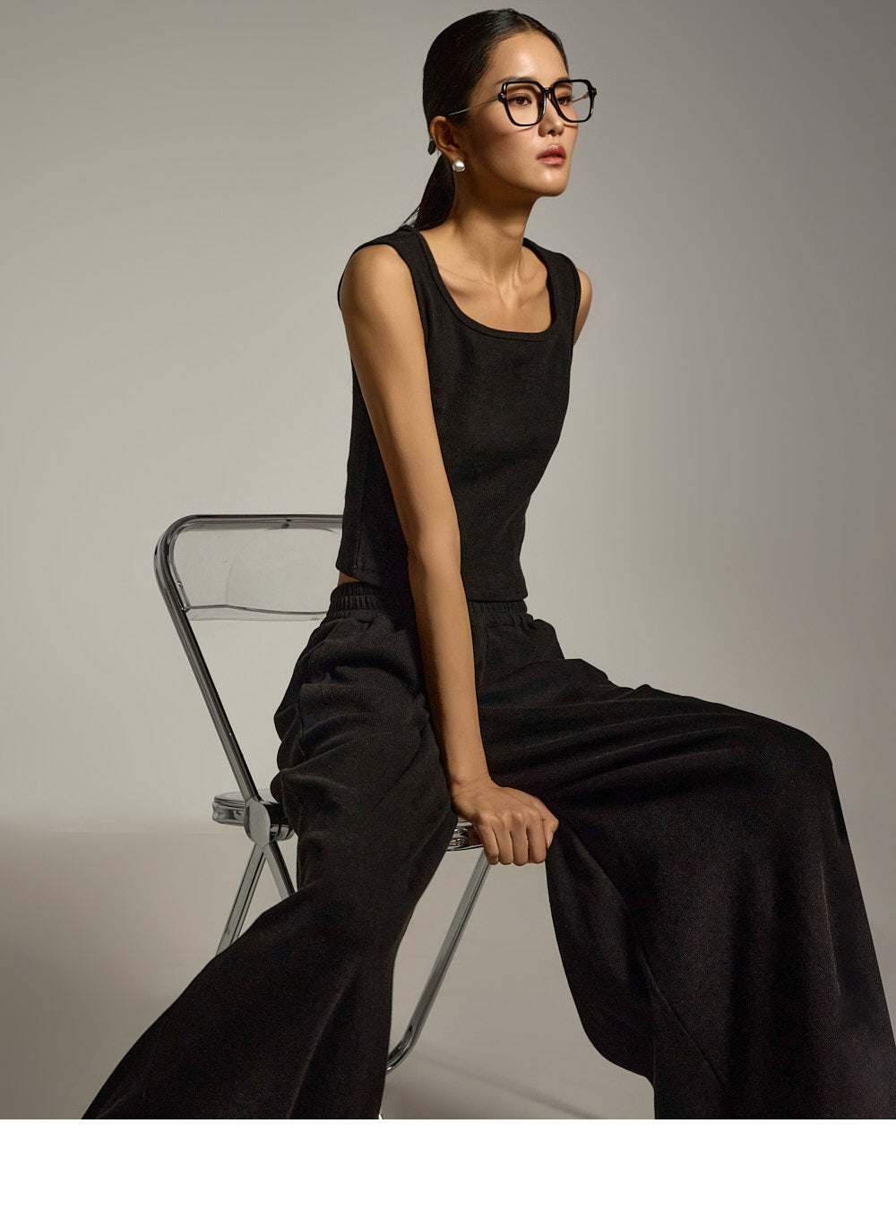 スクエアネックとクロップド丈がシンプルながらもスタイリッシュなシルエットを演出します。