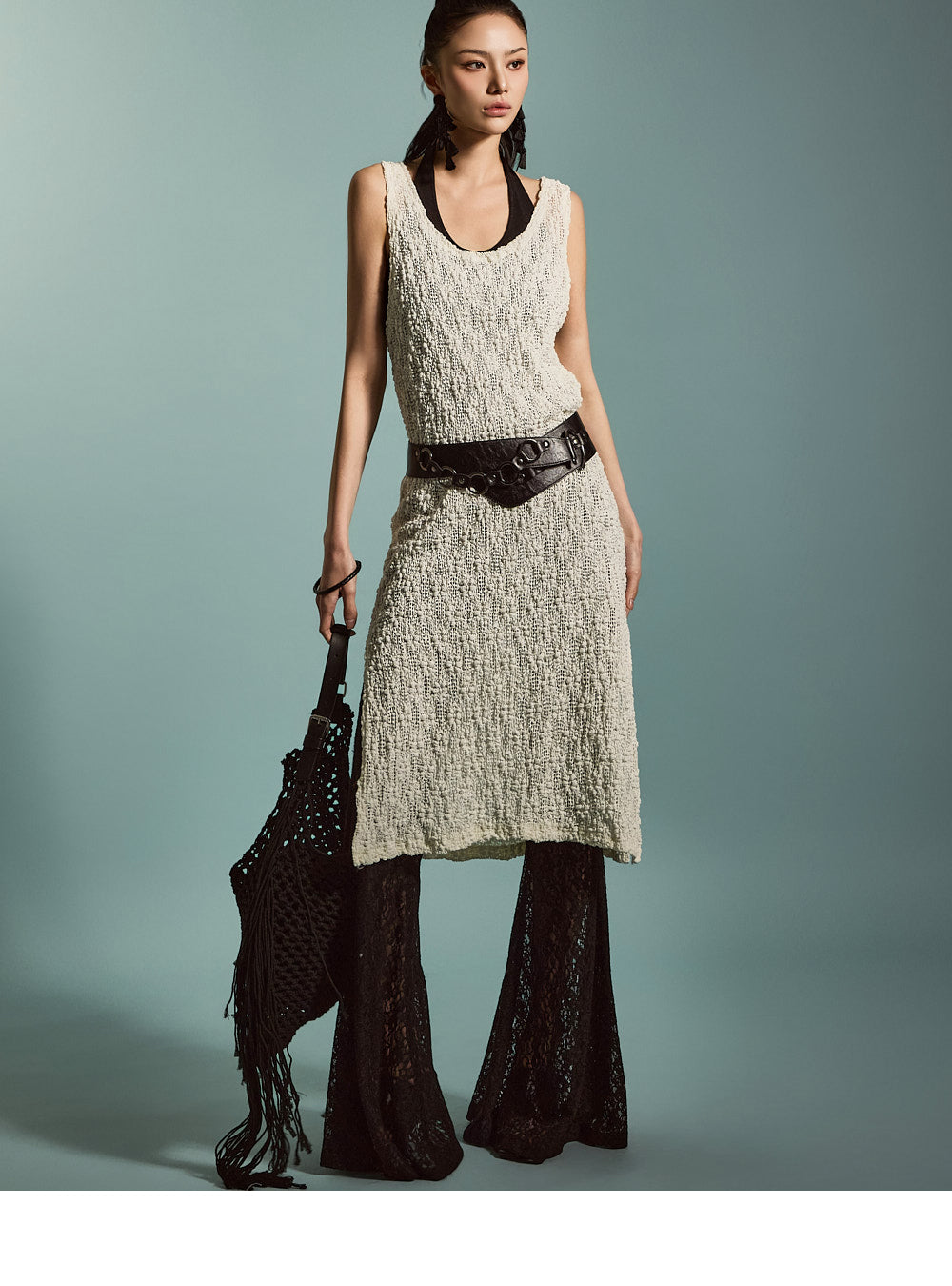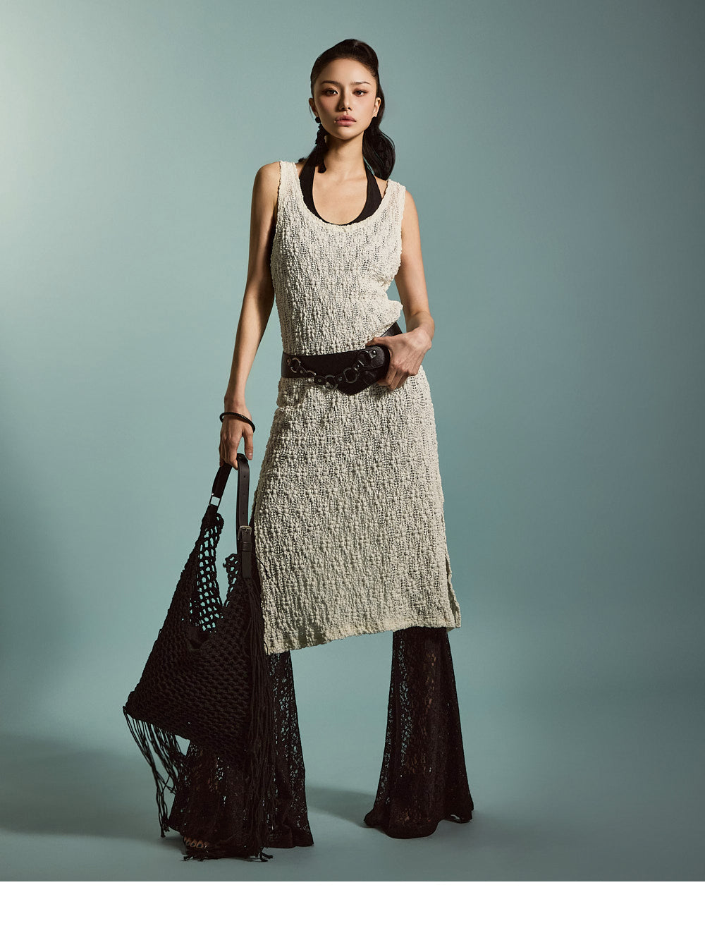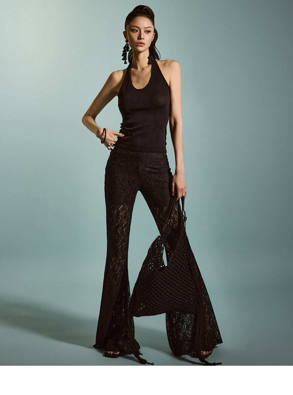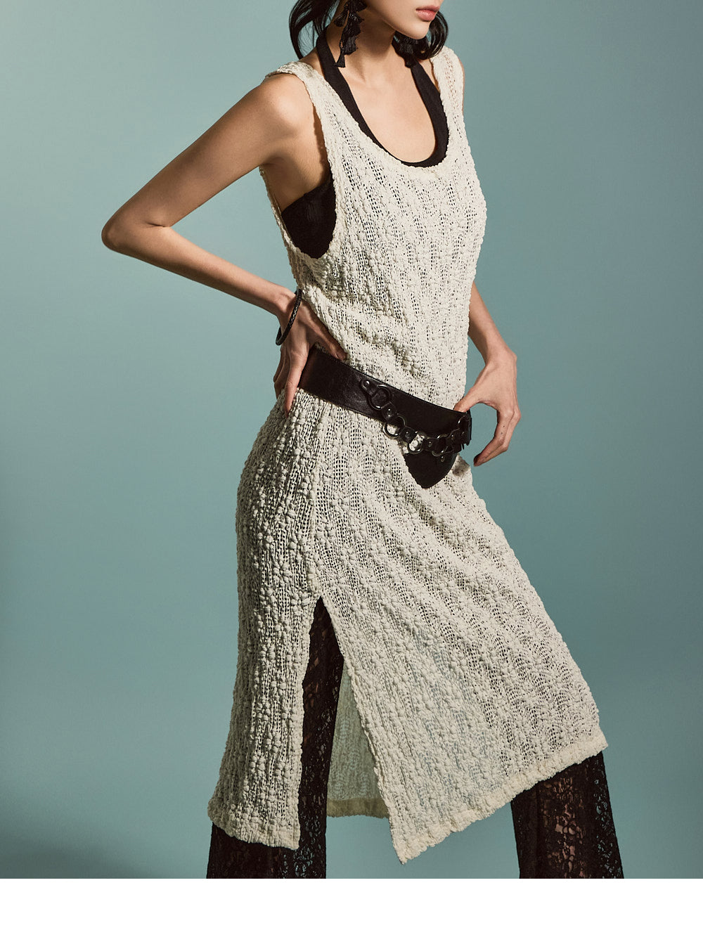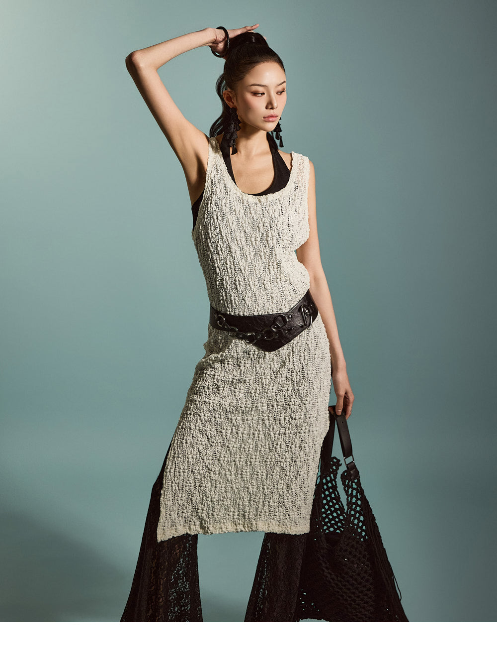 ホルターネックがネックラインを強調し、すっきりと爽やかな印象を与えるので、一枚で着ても、様々なアウターと重ね着しても素敵です。