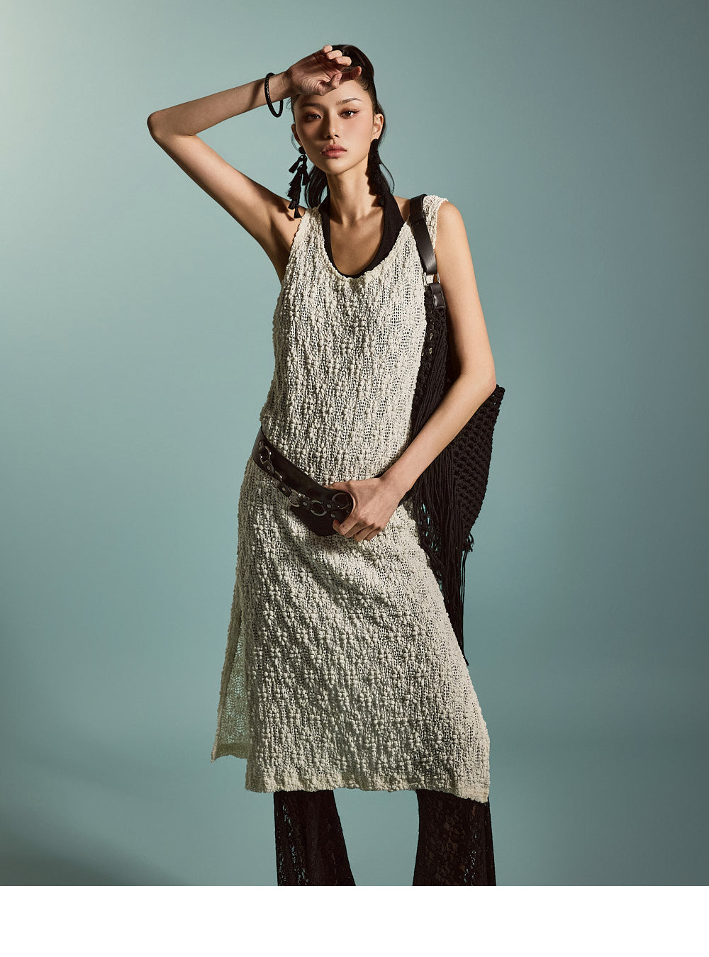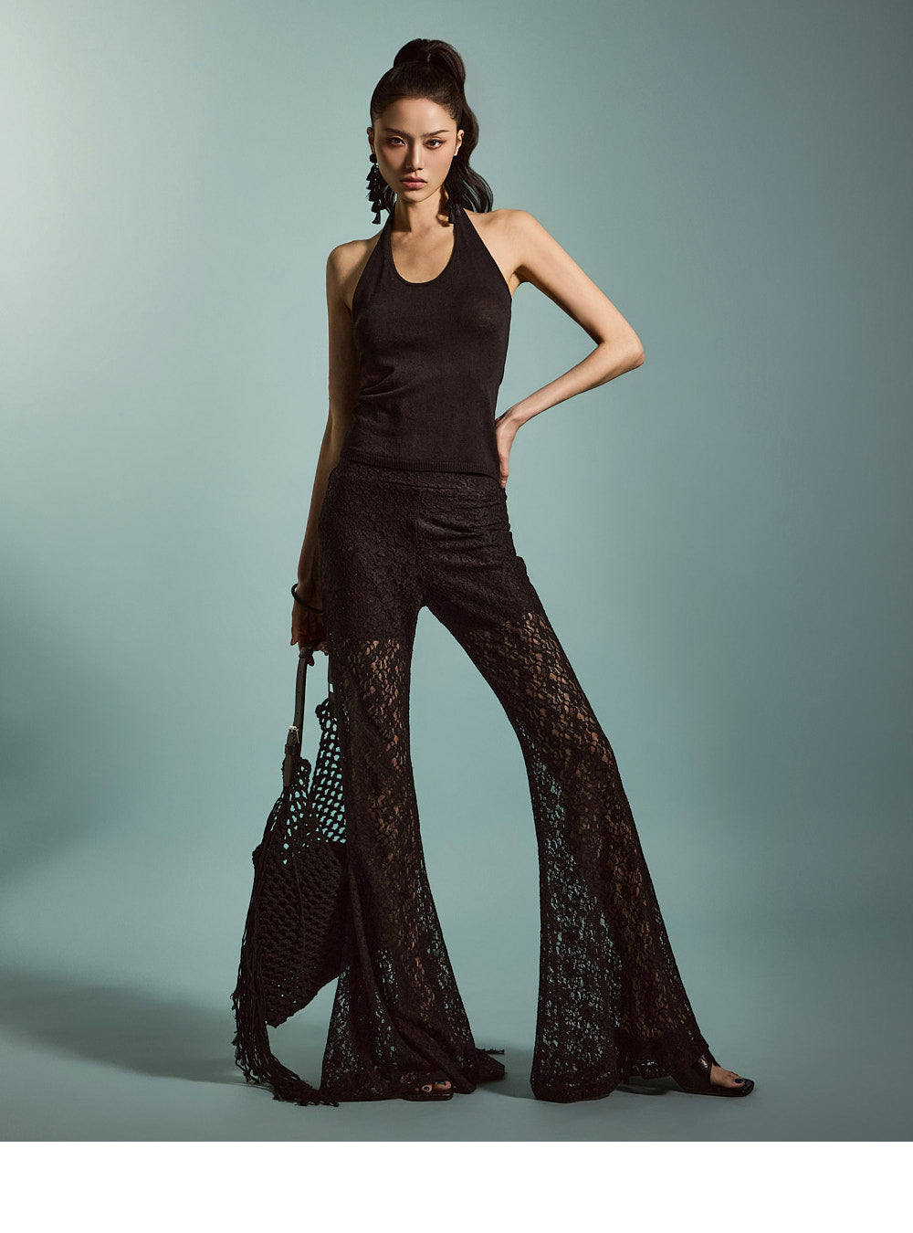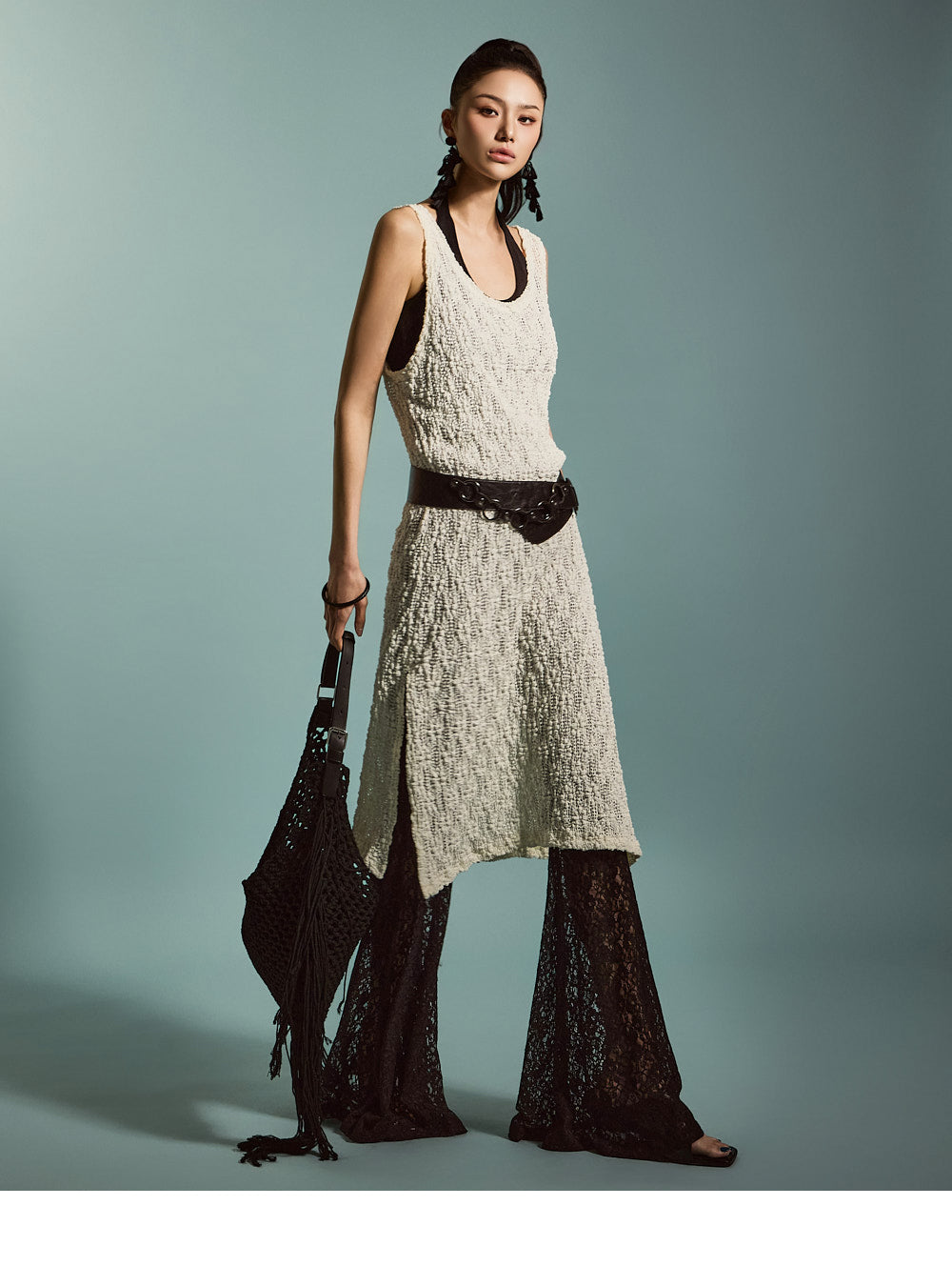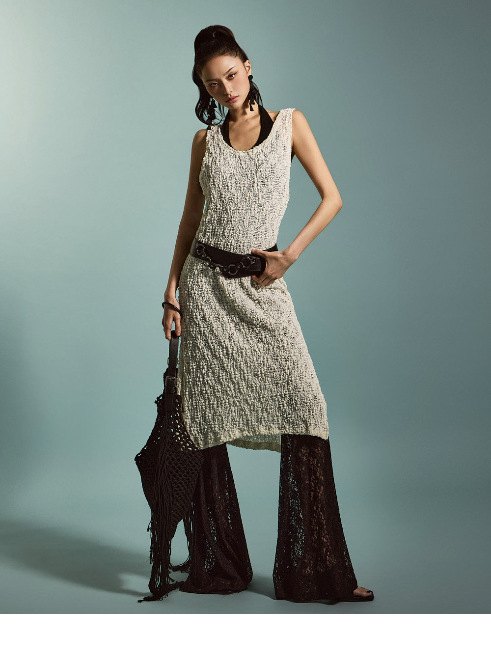 ホルターネックがネックラインを強調し、すっきりと爽やかな印象を与えるので、一枚で着ても、様々なアウターと重ね着しても素敵です。