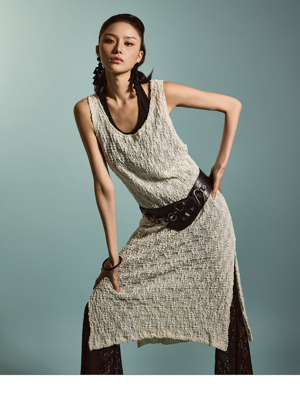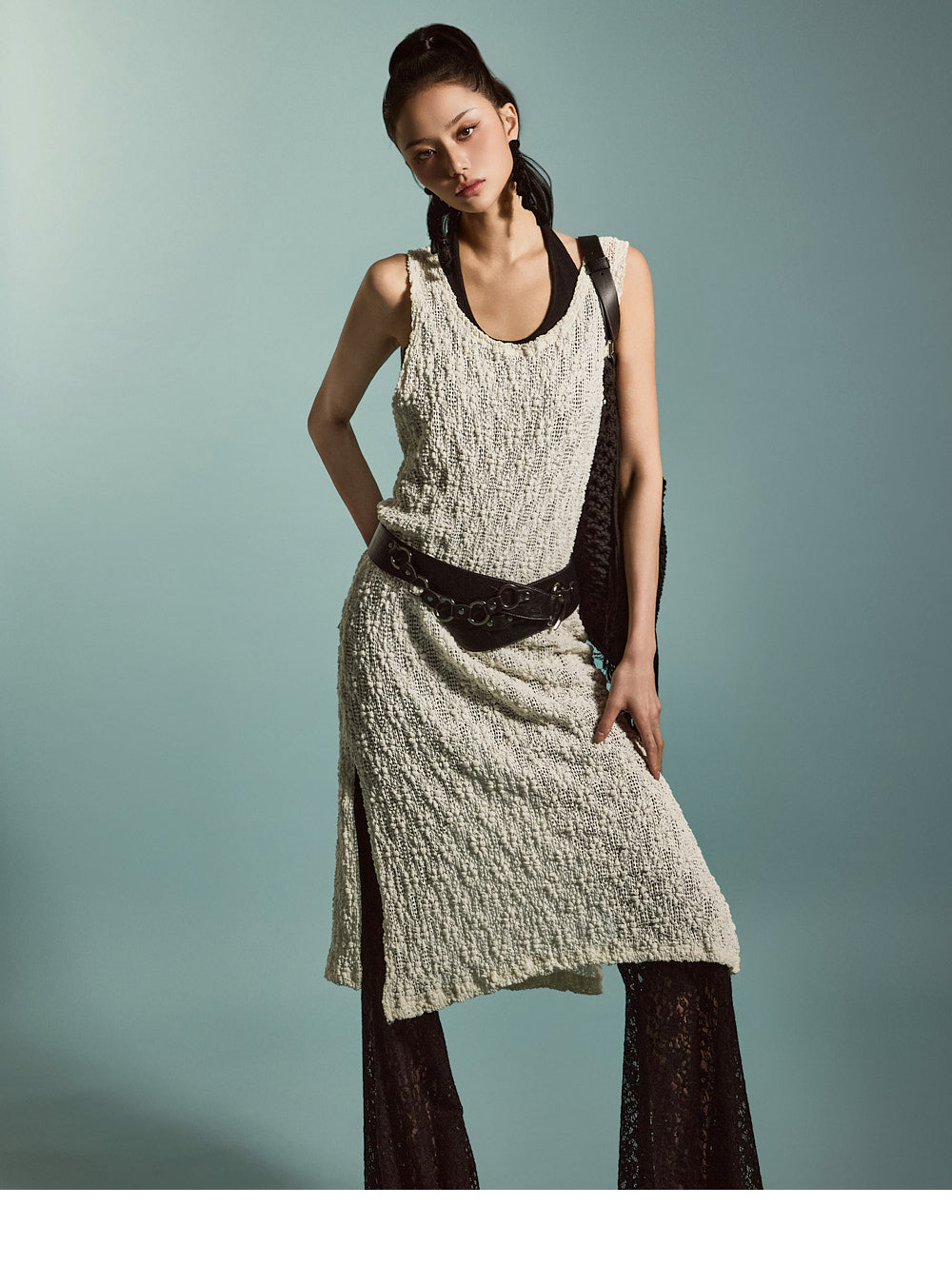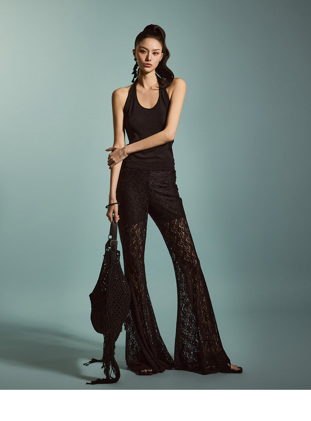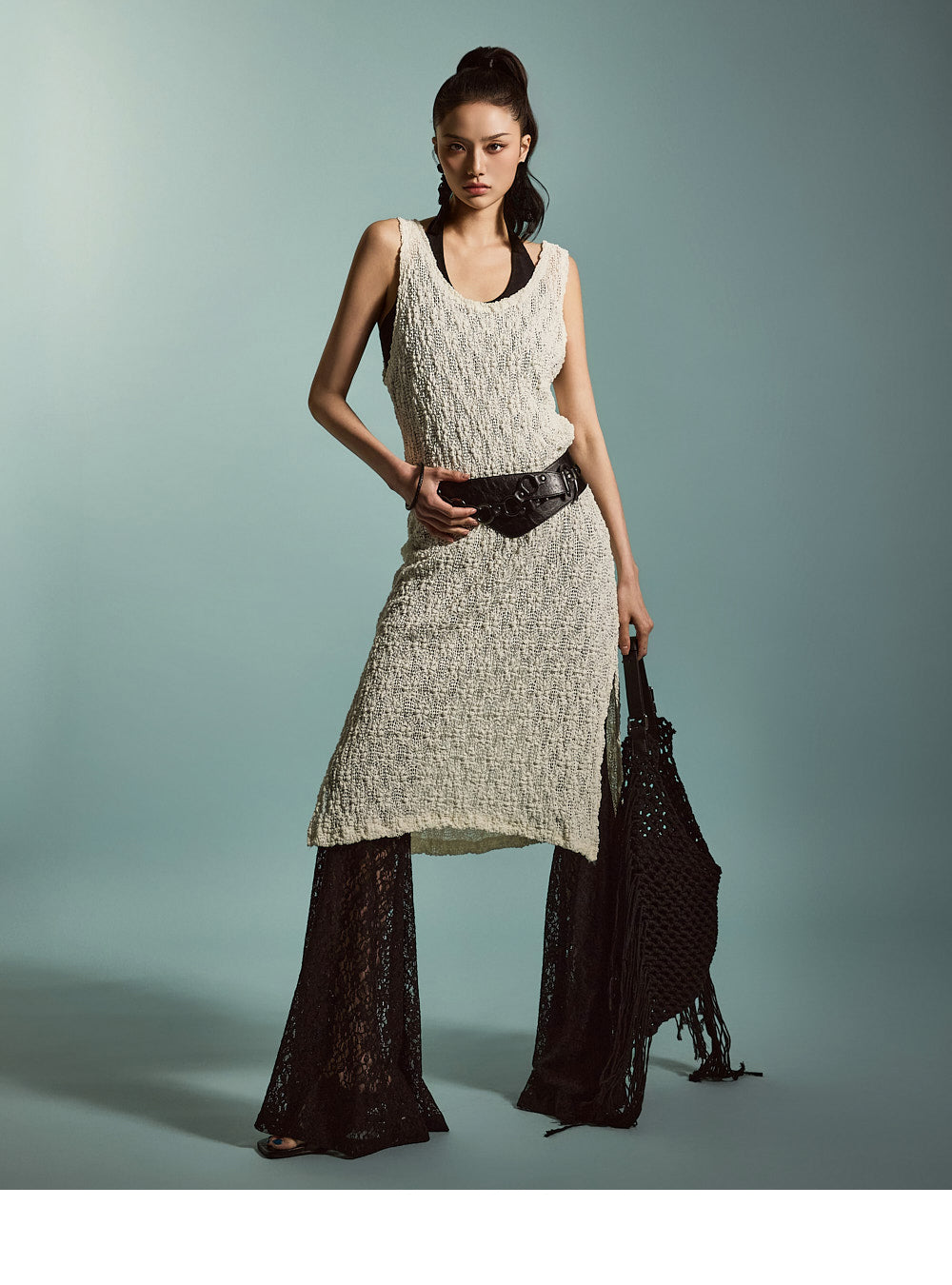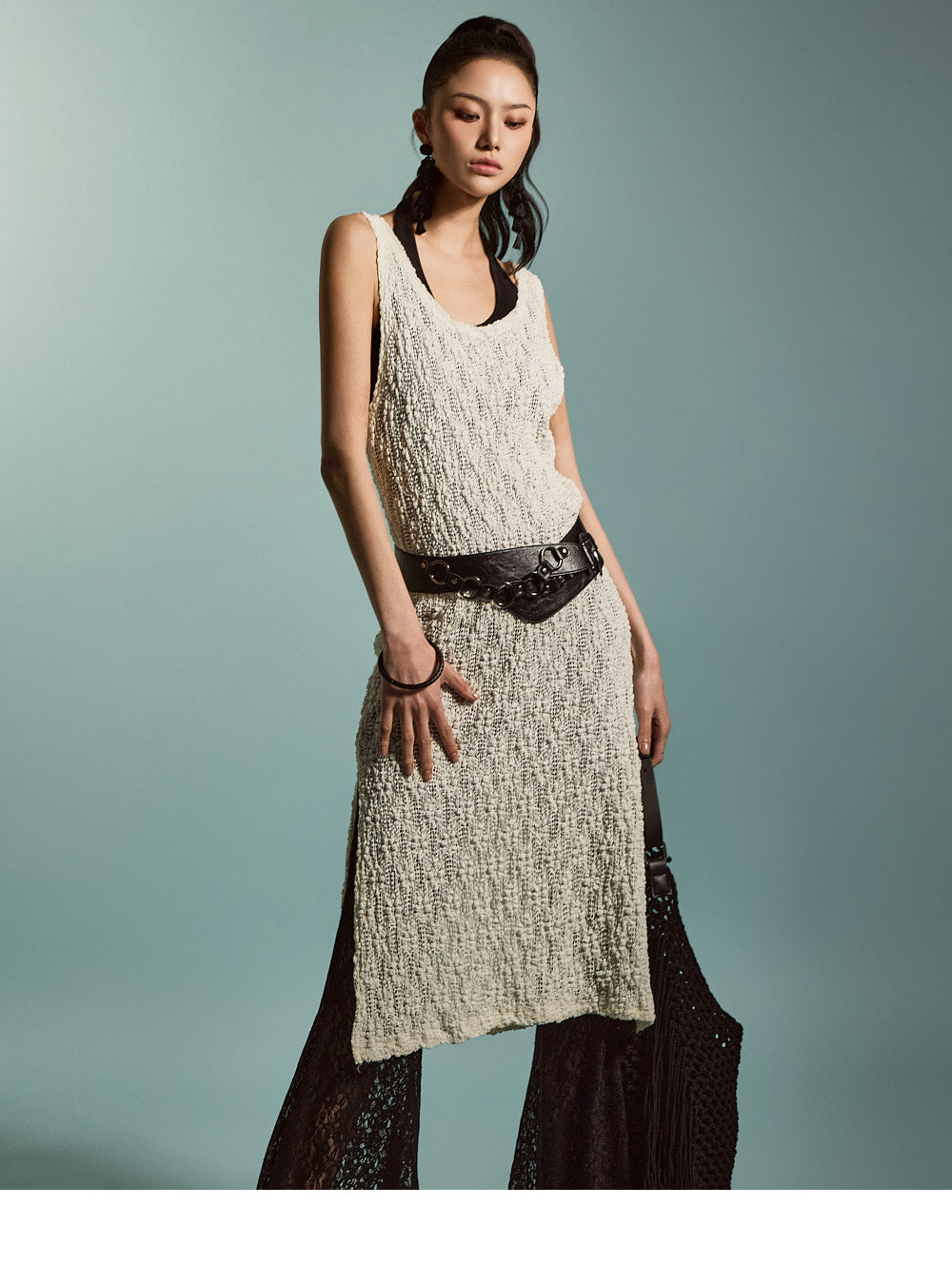 ホルターネックがネックラインを強調し、すっきりと爽やかな印象を与えるので、一枚で着ても、様々なアウターと重ね着しても素敵です。