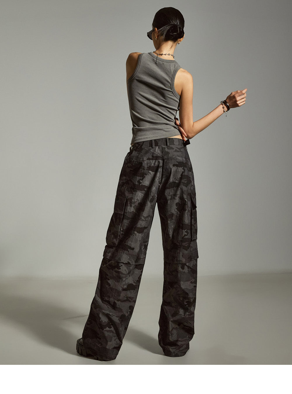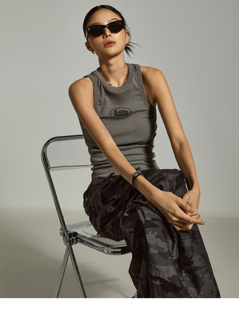 このリブ編みのノースリーブトップスは、ユニークでスタイリッシュなタッチをもたらします。