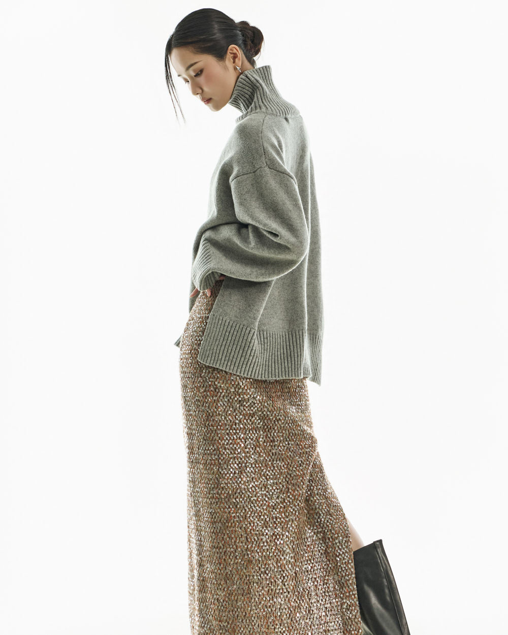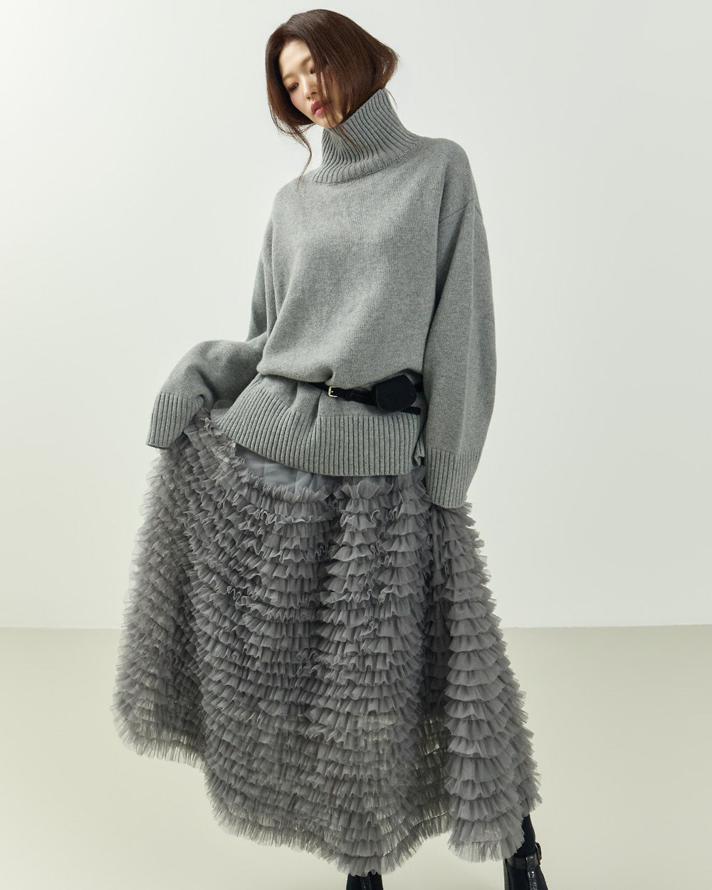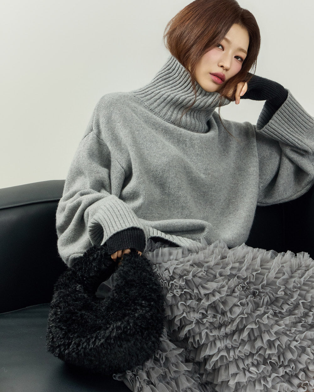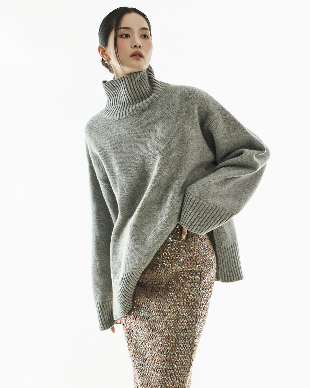 The turtleneck design, oversized fit, and loose silhouette