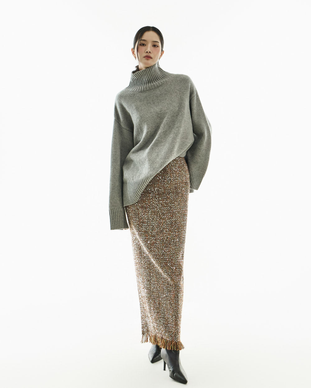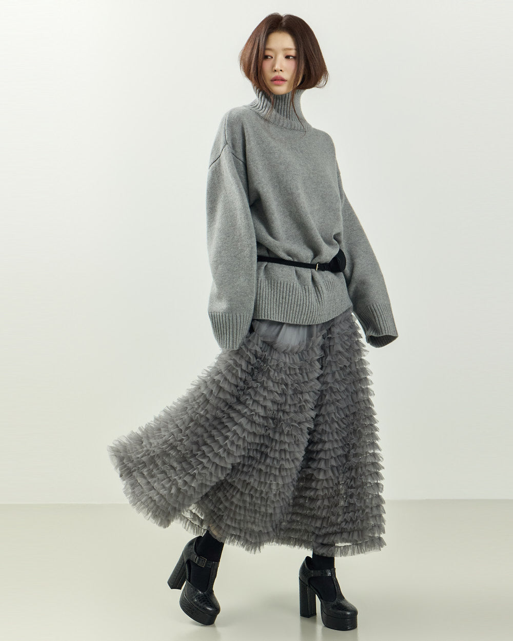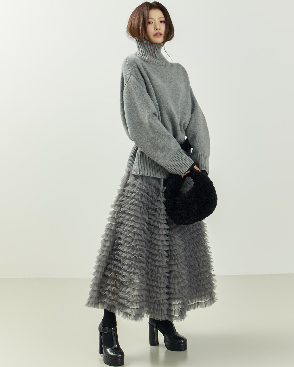 The turtleneck design, oversized fit, and loose silhouette