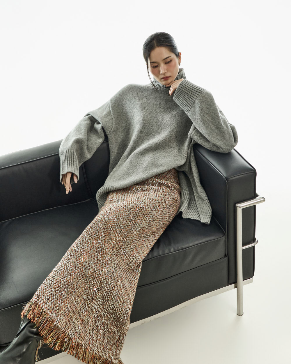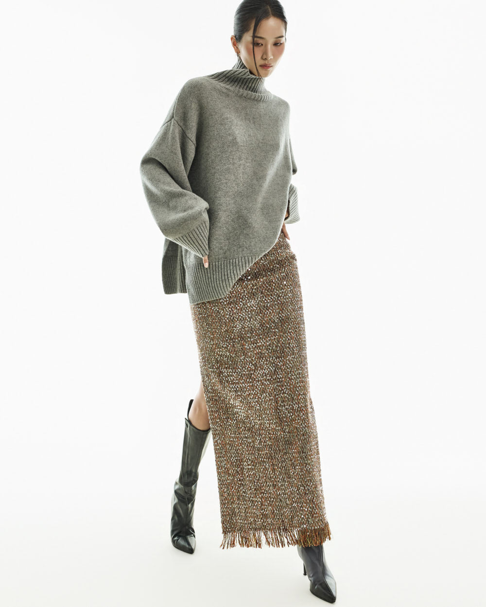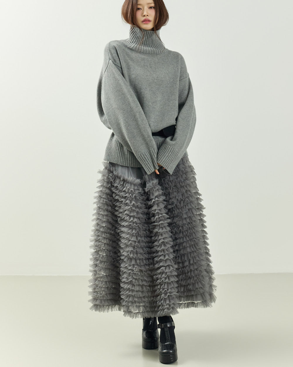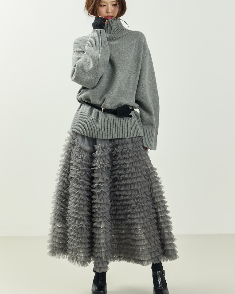 The turtleneck design, oversized fit, and loose silhouette