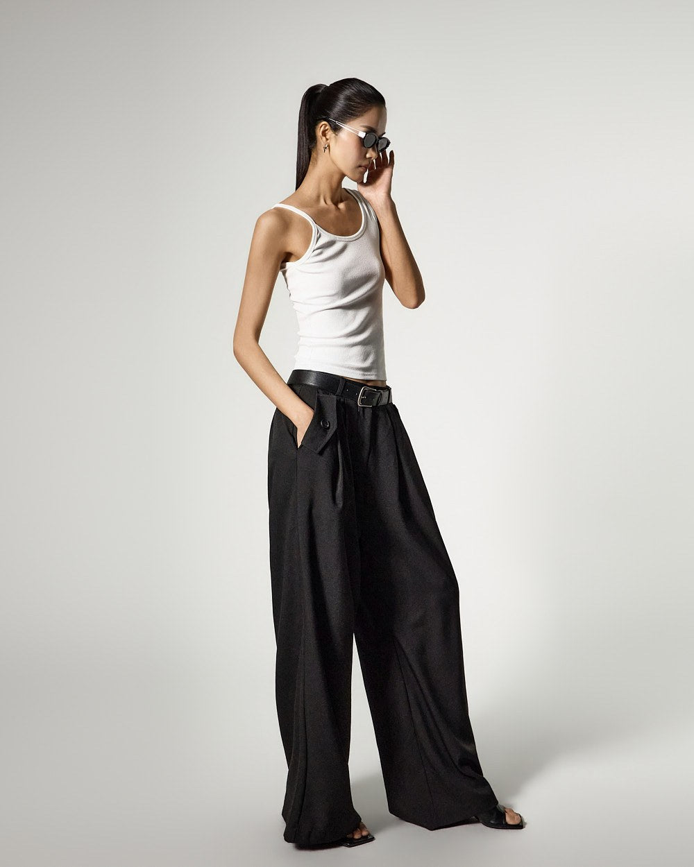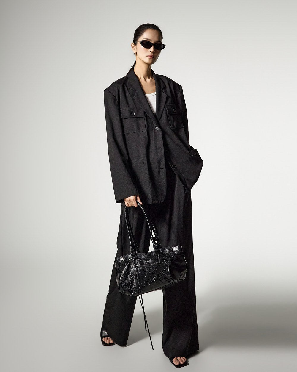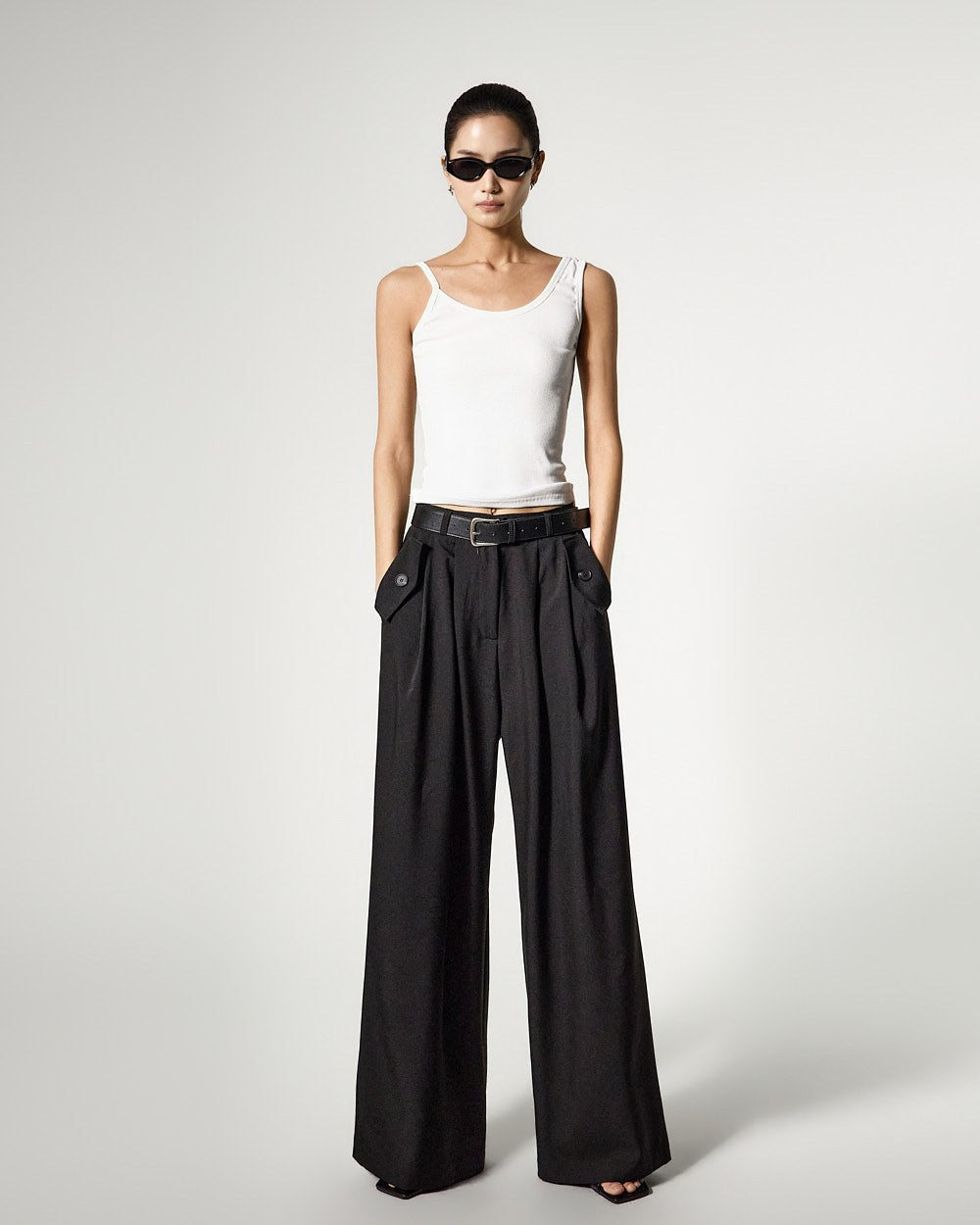 アシンメトリーなストラップディテールがユニークなアクセントになり