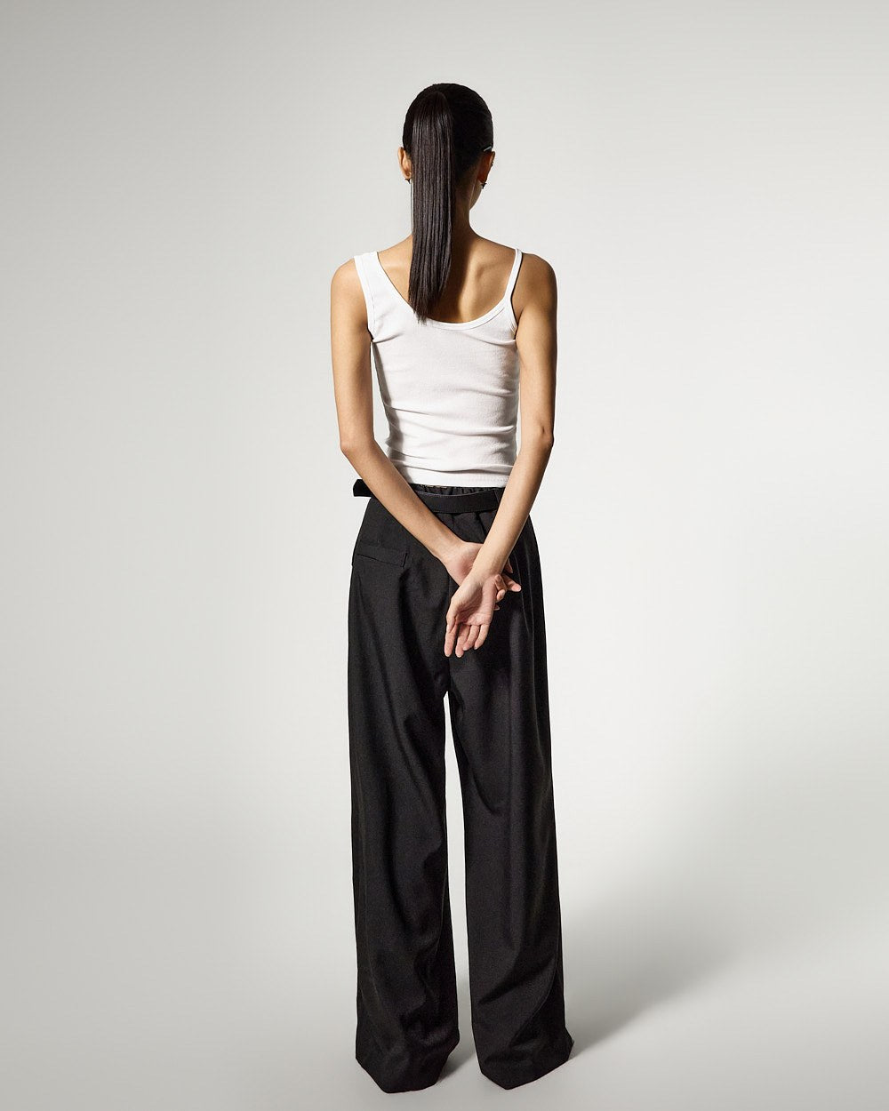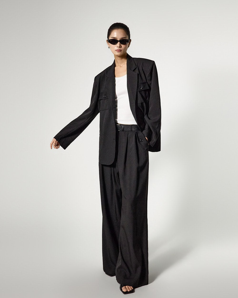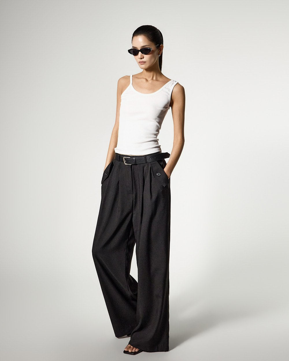アシンメトリーなストラップディテールがユニークなアクセントになり