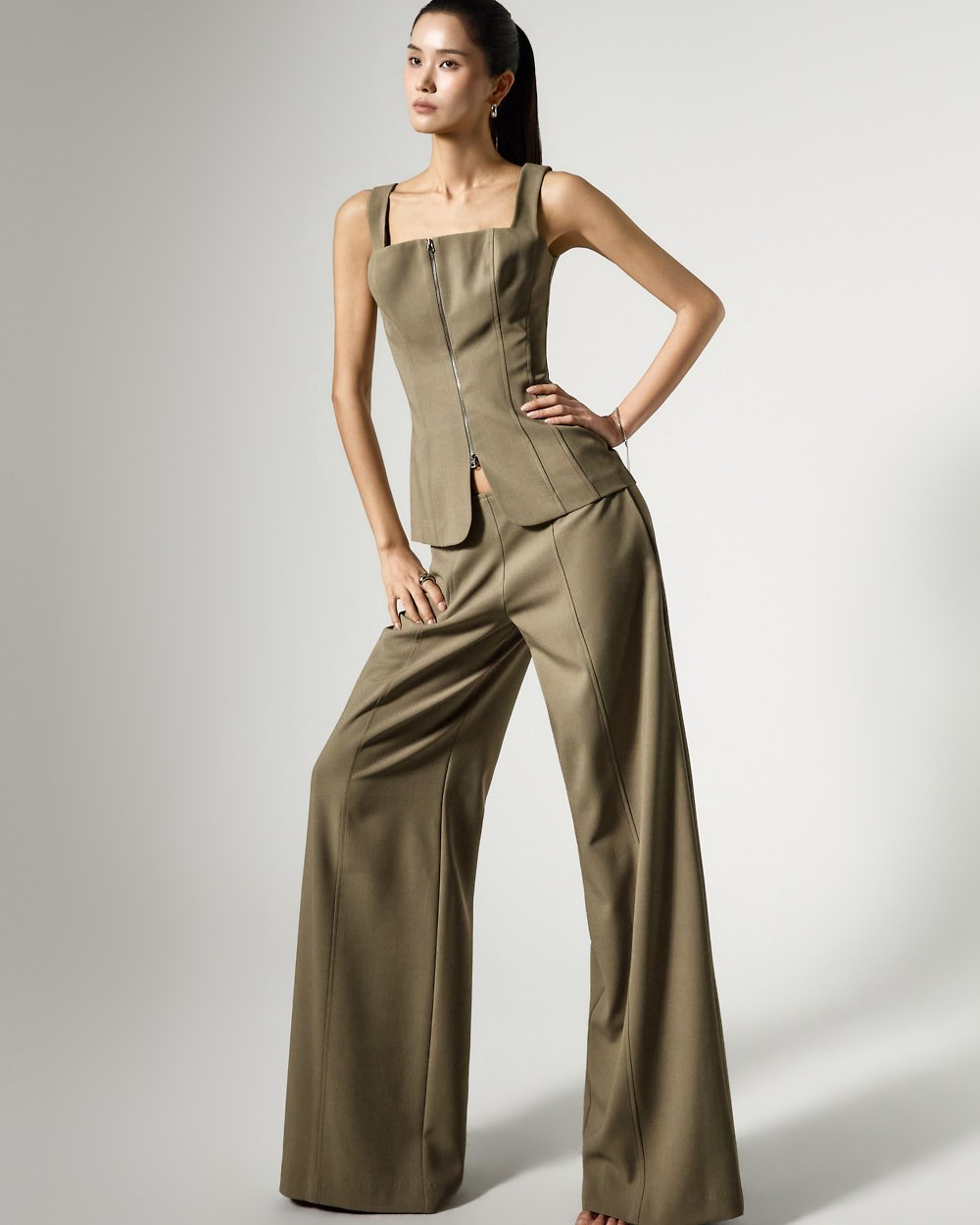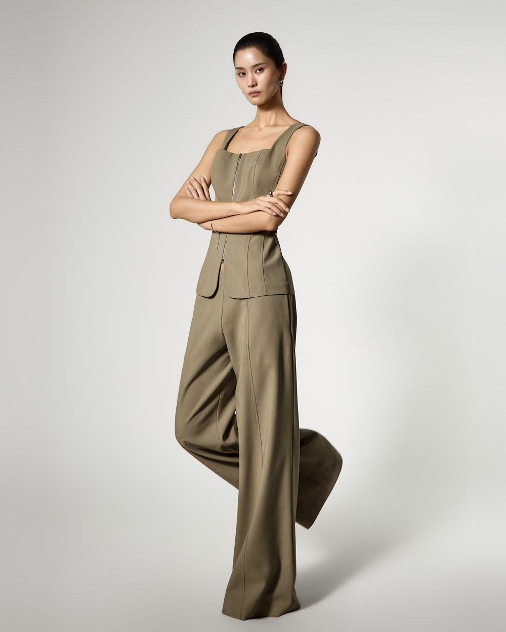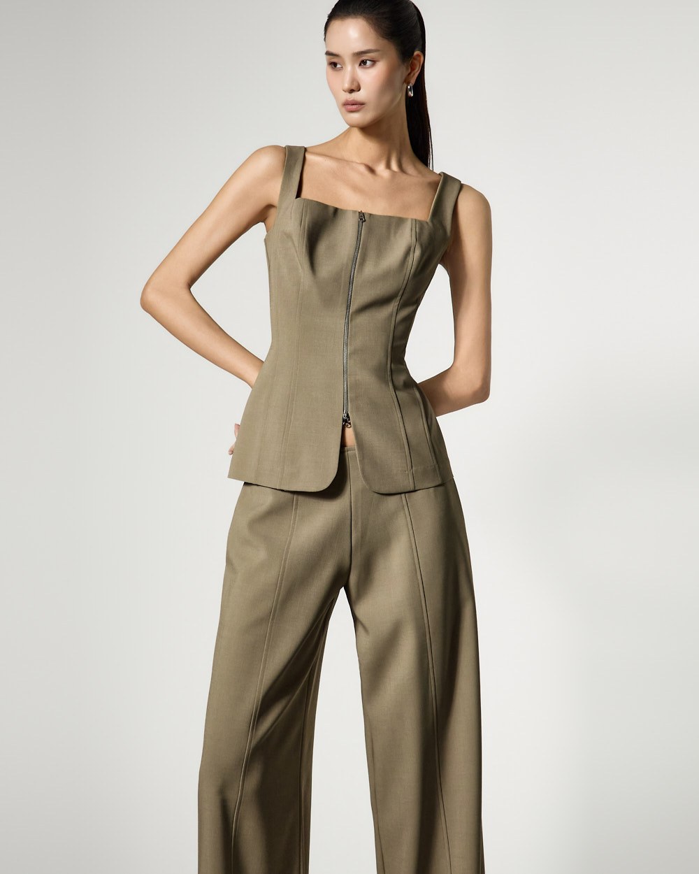 特徴的な立体感のあるシルエットが魅力のジップアップノースリーブブラウスです。