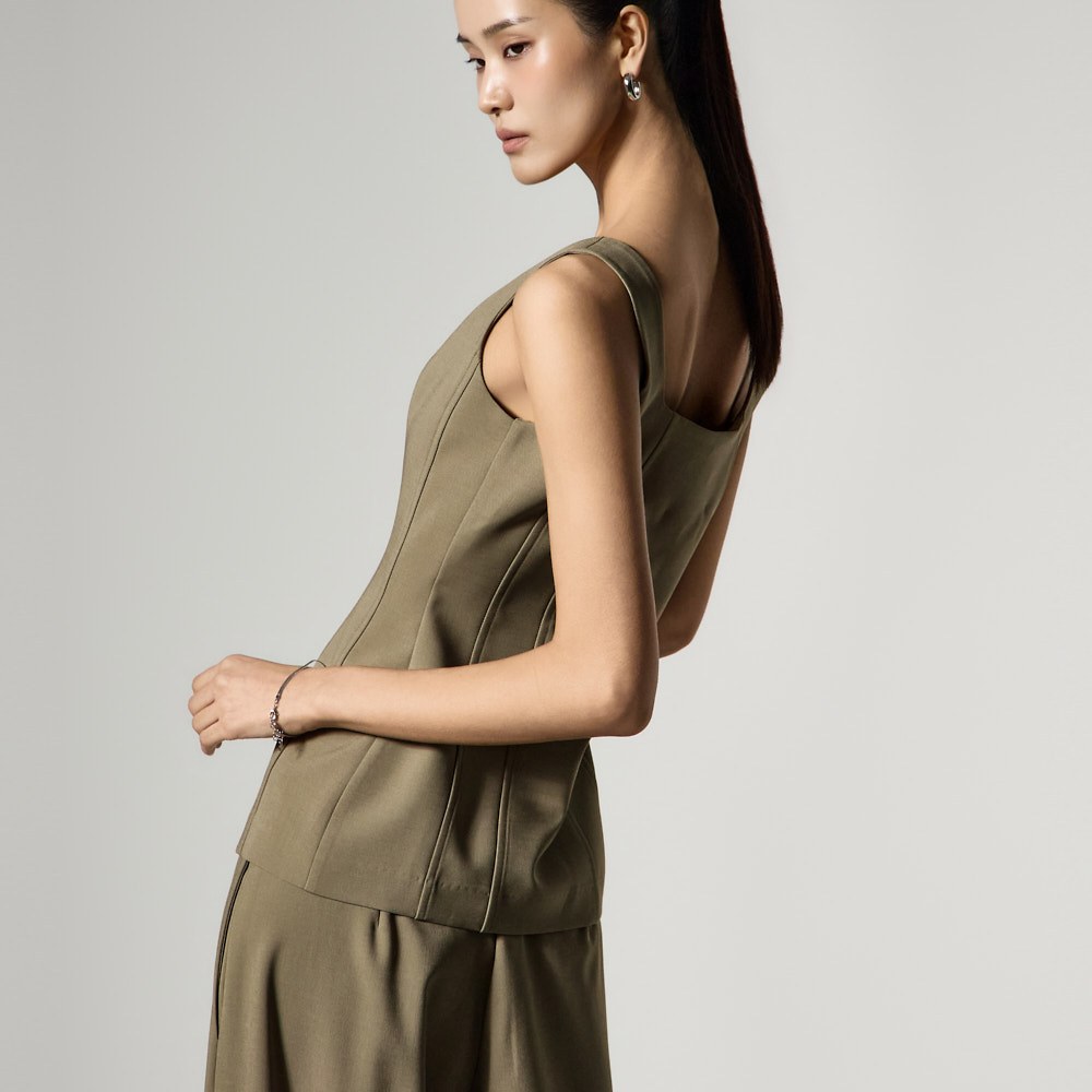 スクエアネックラインと幅広のショルダーストラップが肩のラインをすっきりと見せ、