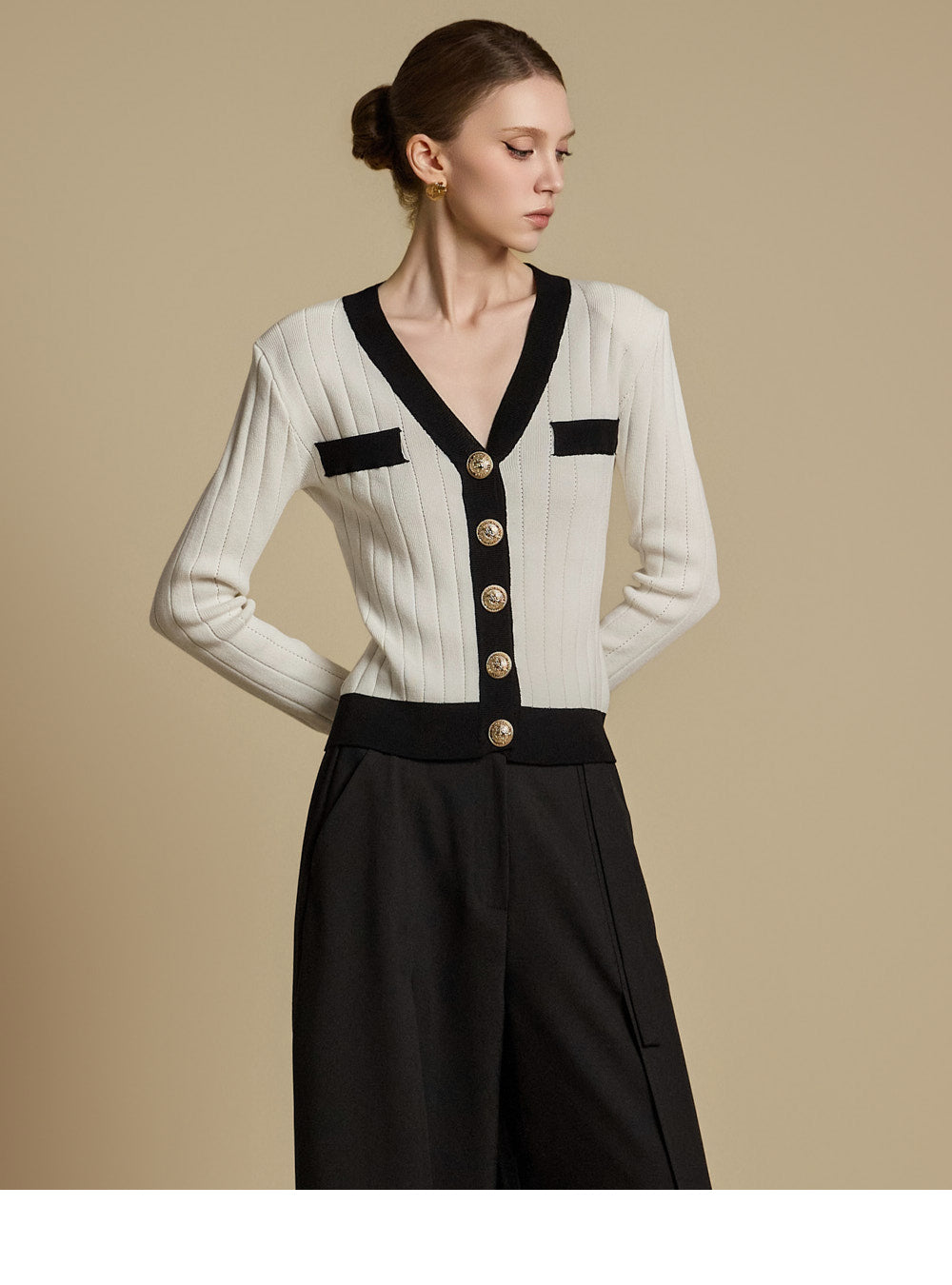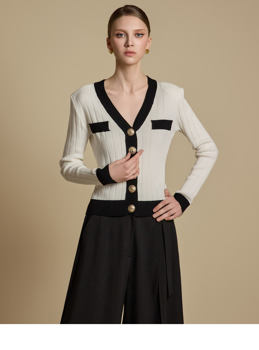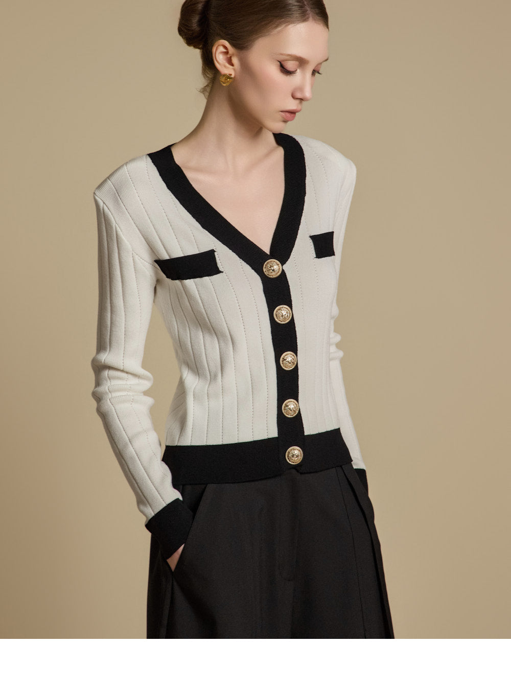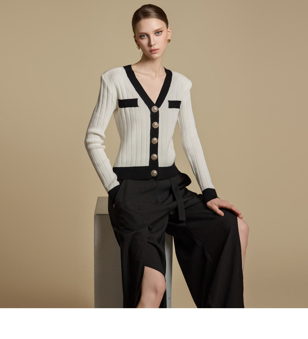 このカーディガンはスリムフィットでカラーブロックデザインが特徴です。