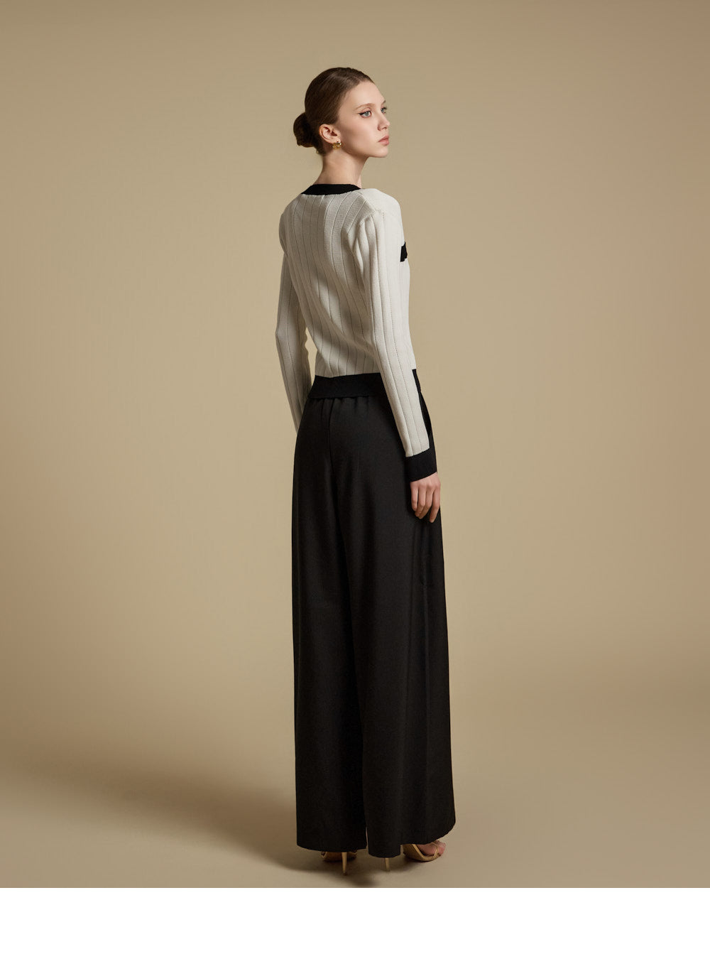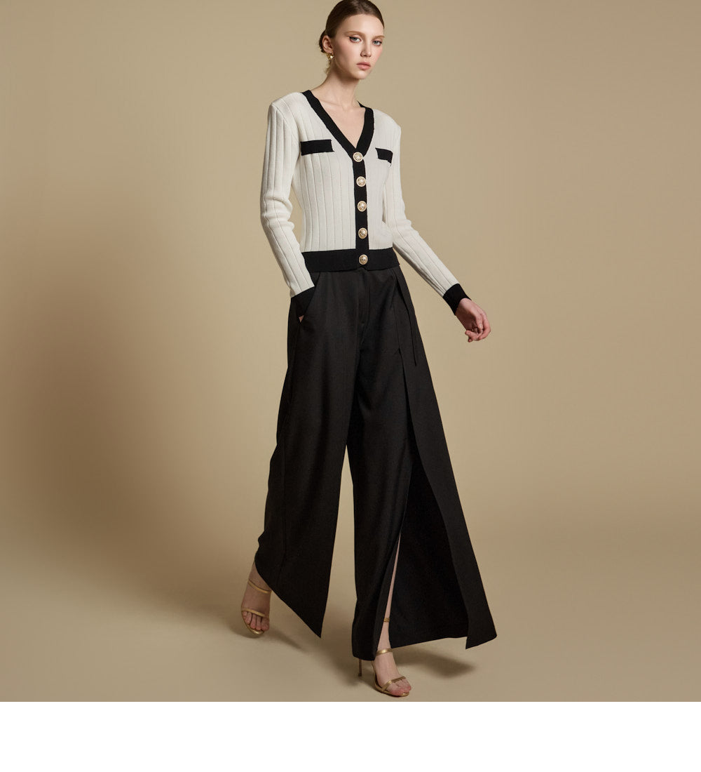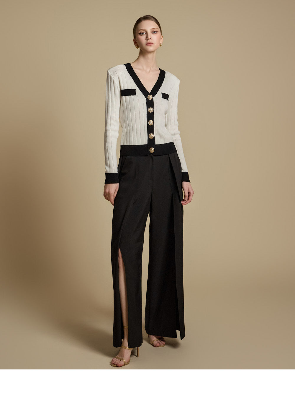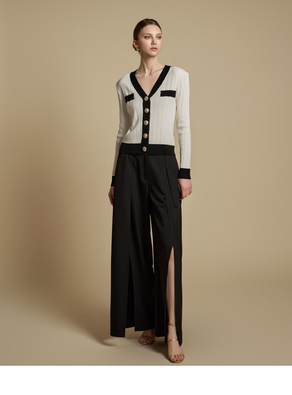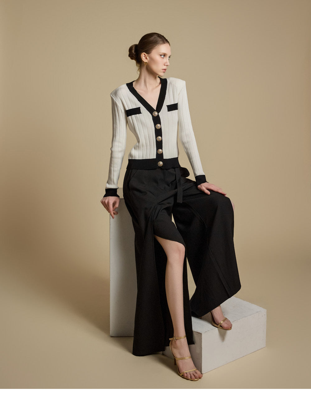 このカーディガンはスリムフィットでカラーブロックデザインが特徴です。