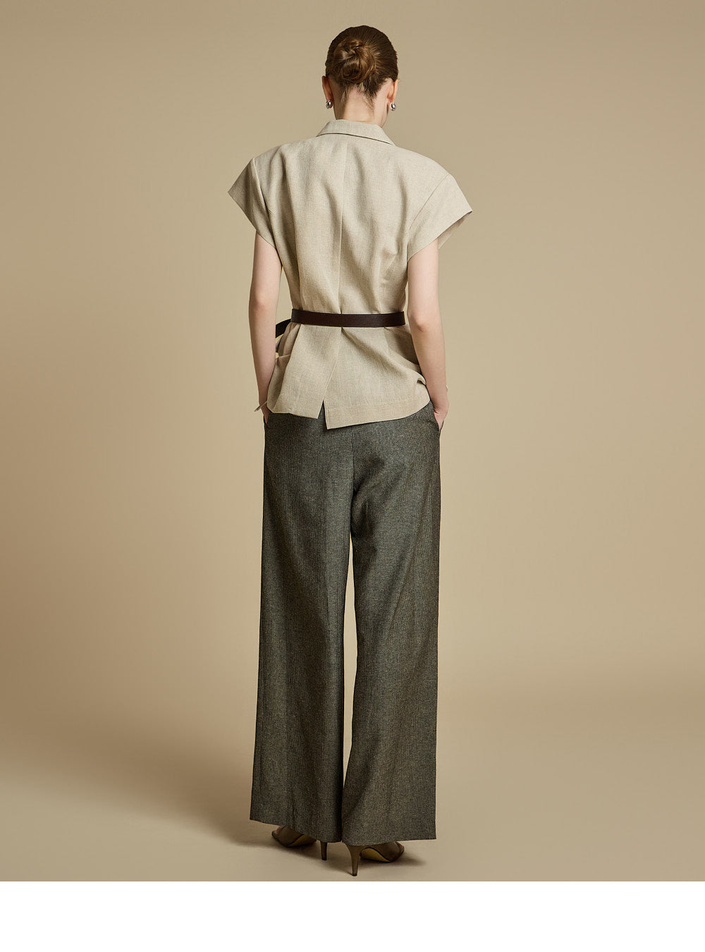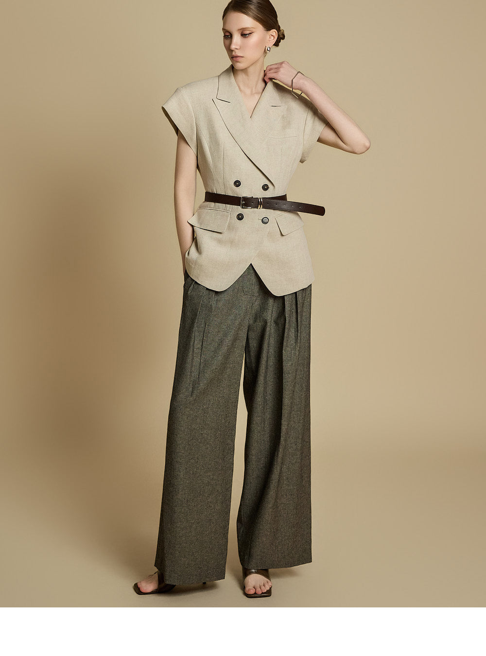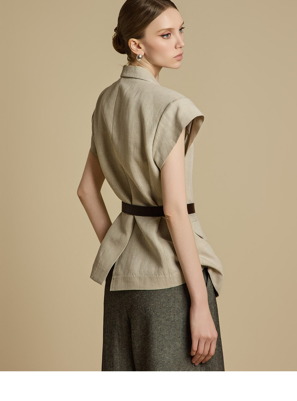 アシンメトリーな裾とフロントボタン留めが洗練されたシルエットを演出します。
