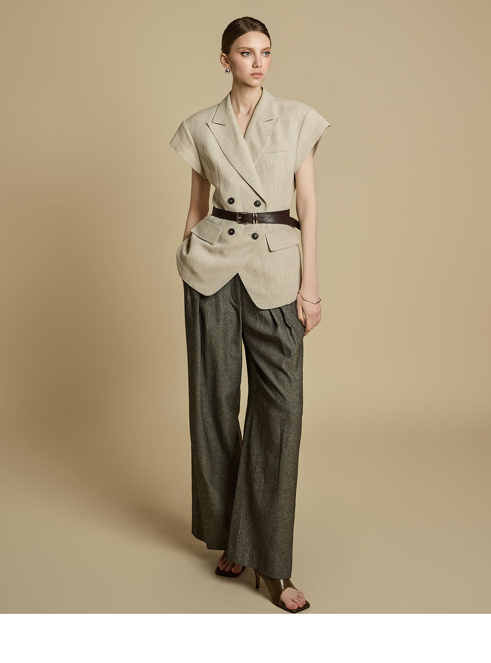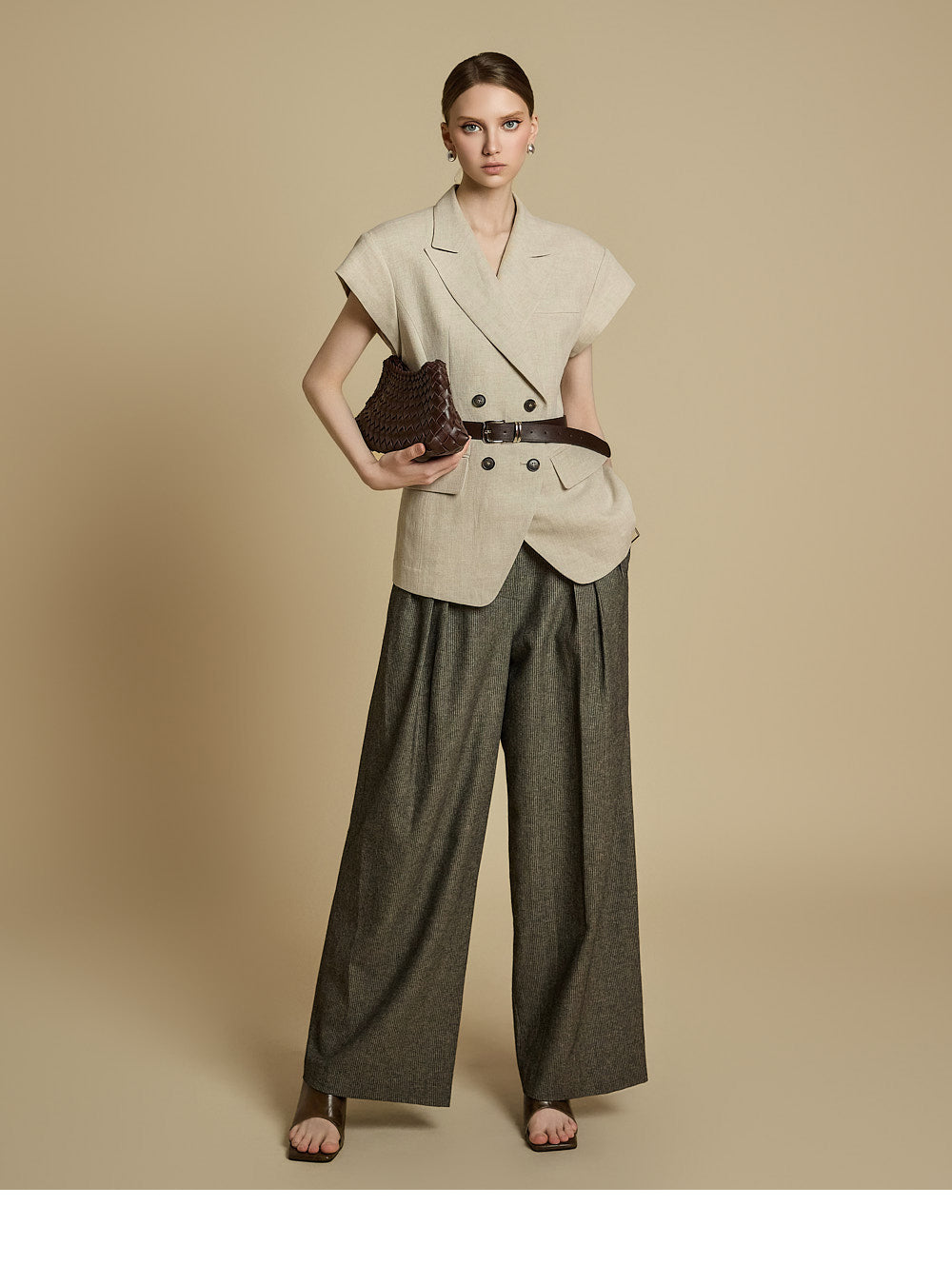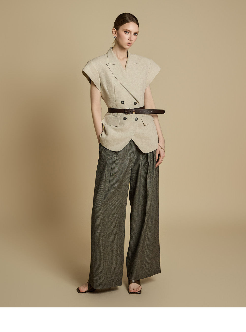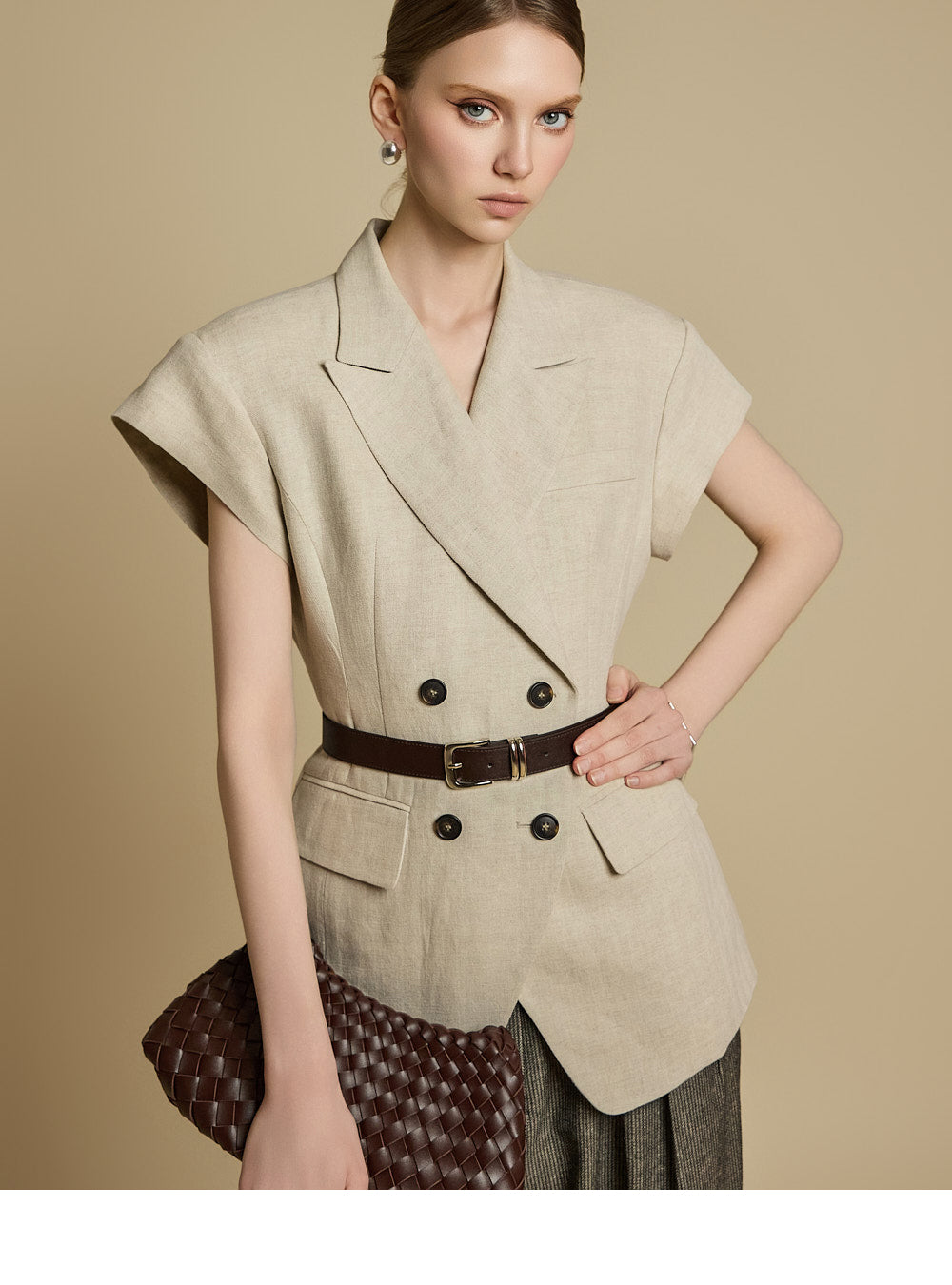 アシンメトリーな裾とフロントボタン留めが洗練されたシルエットを演出します。