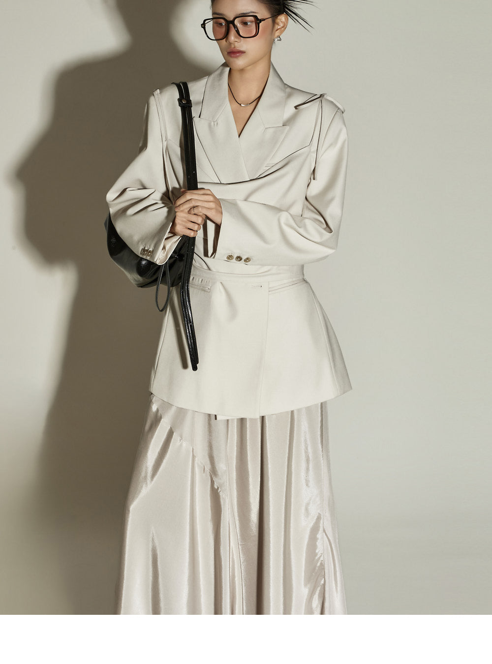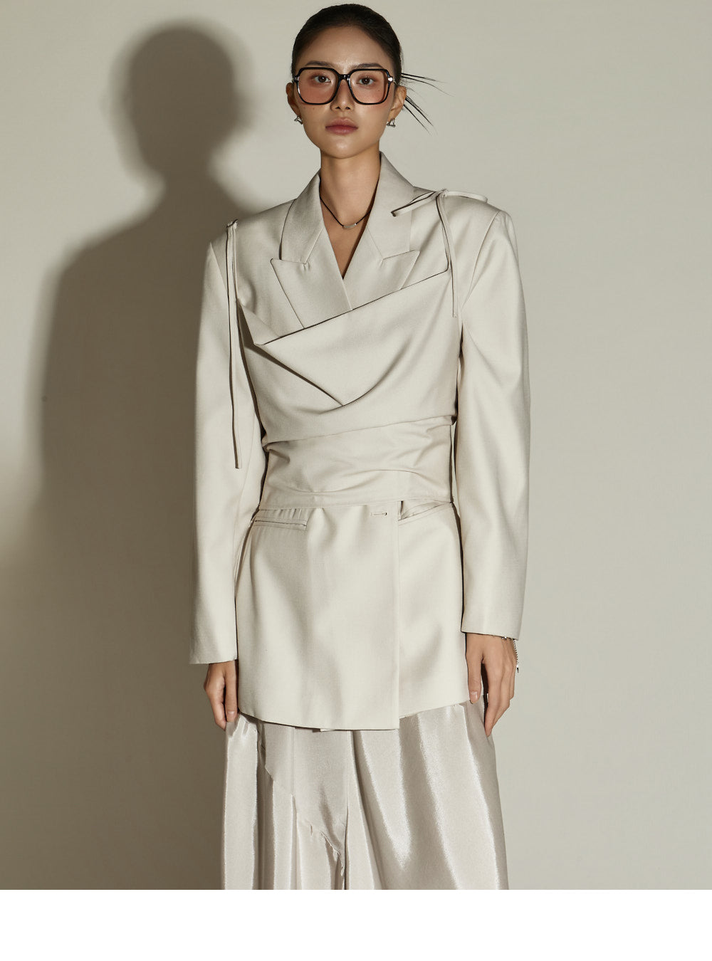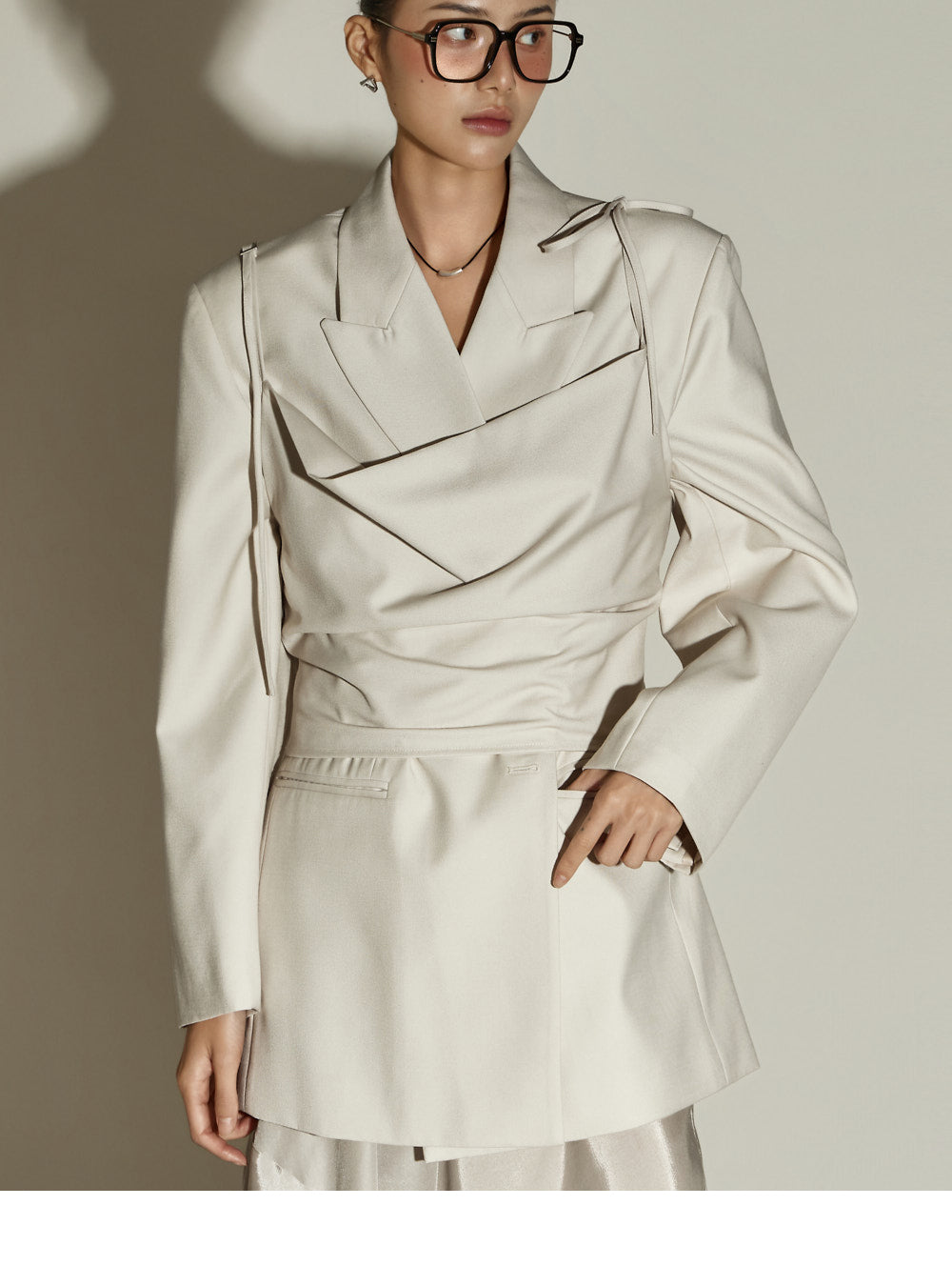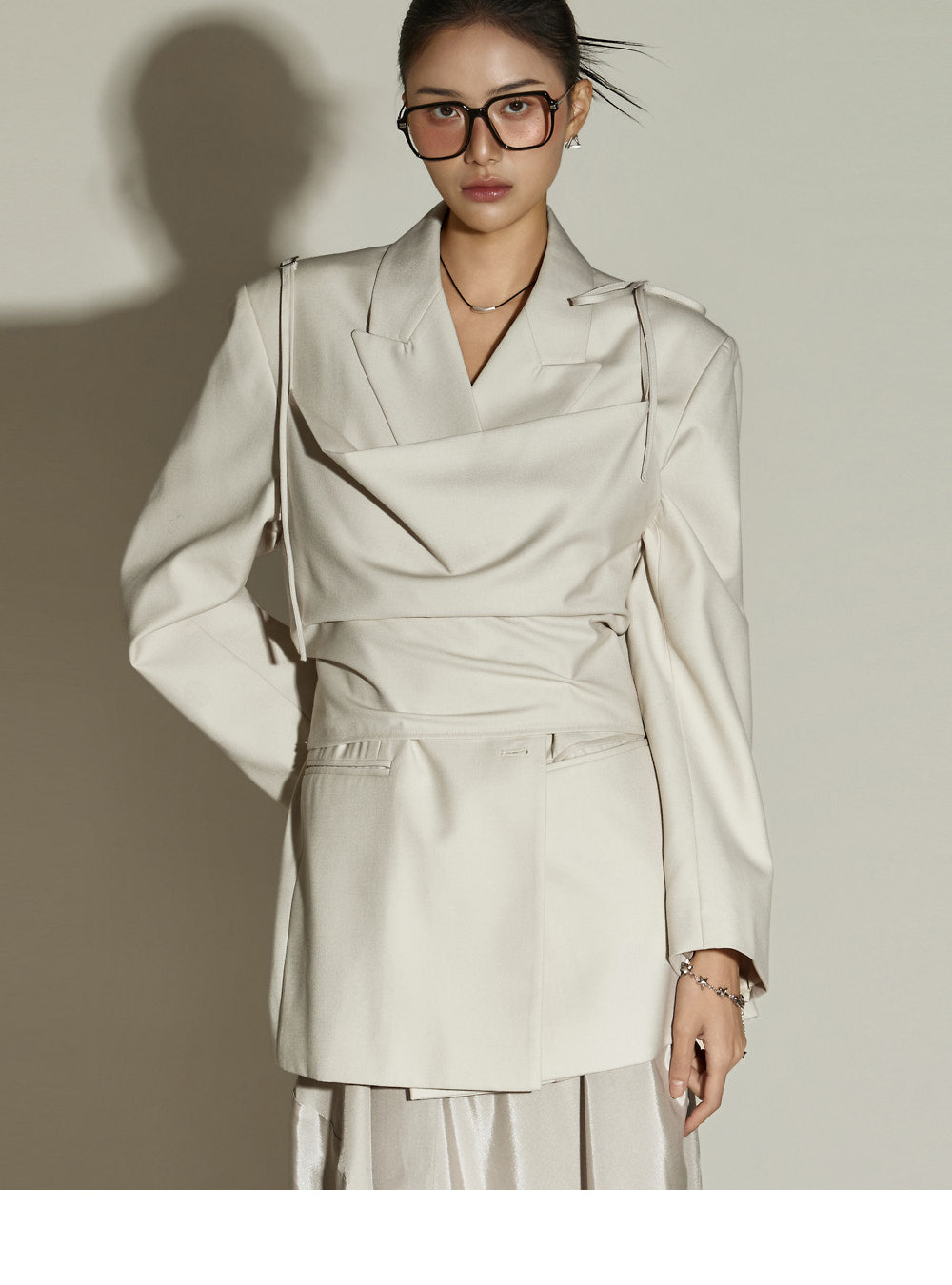 The jacket features a boxy silhouette with moderate shoulder padding,