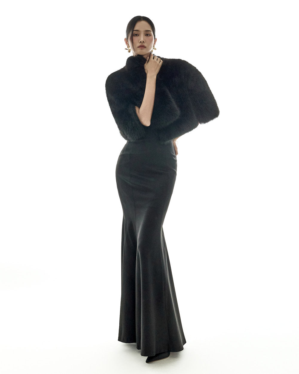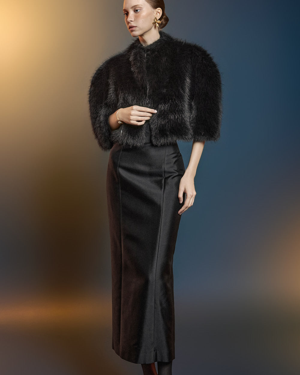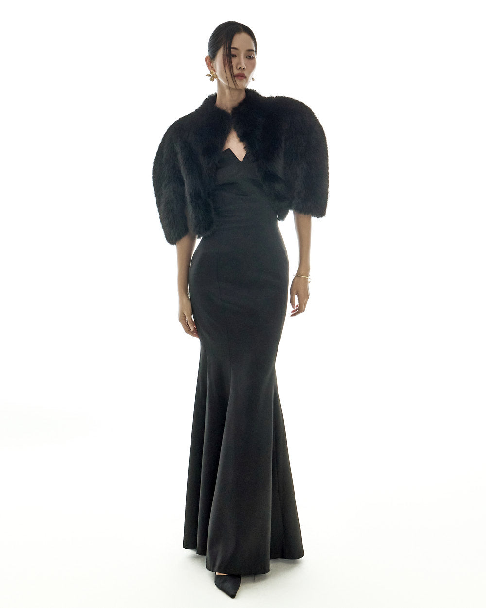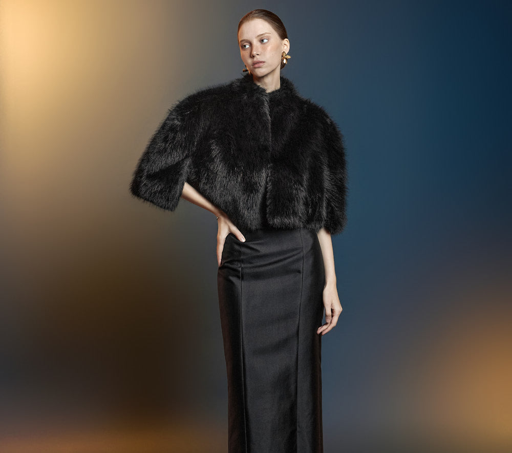 and its short cape silhouette creates a sophisticated look.