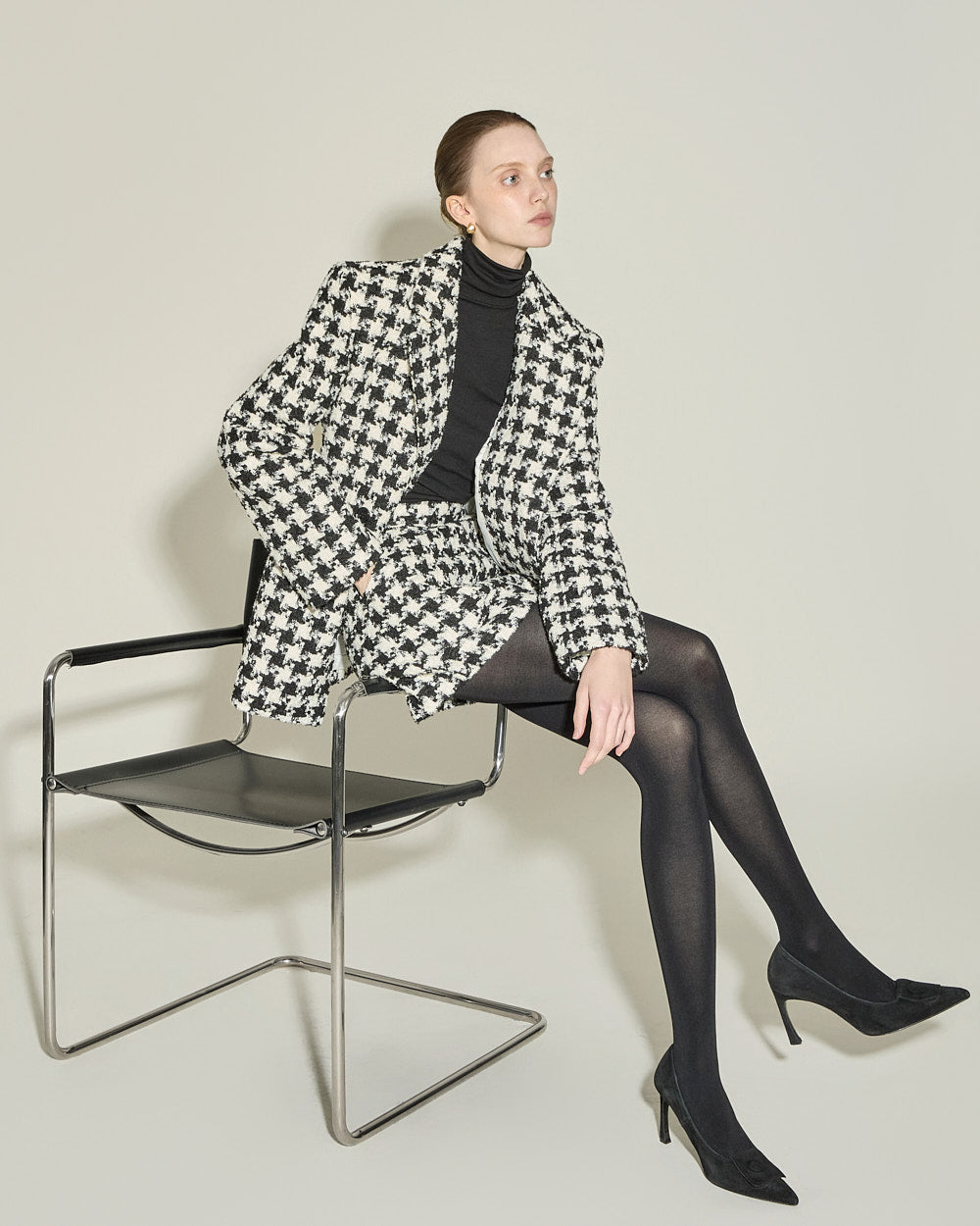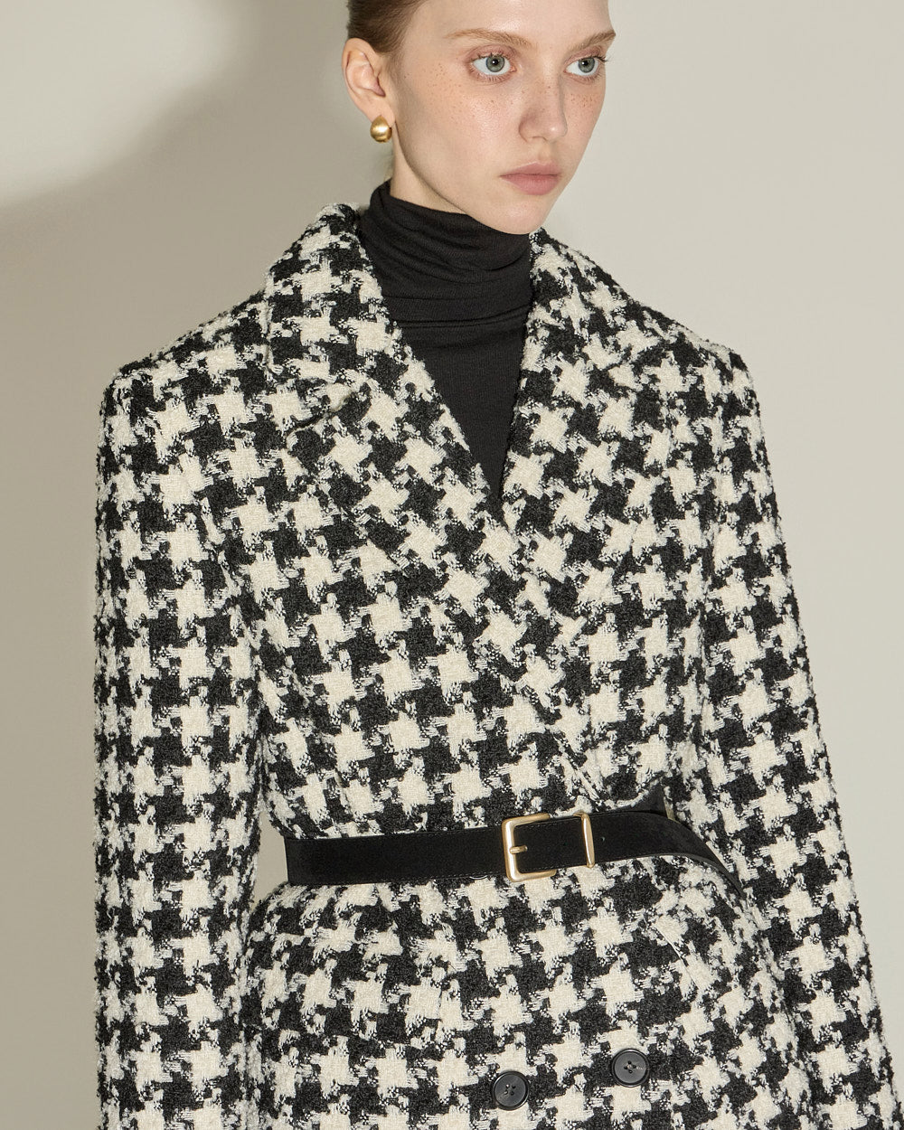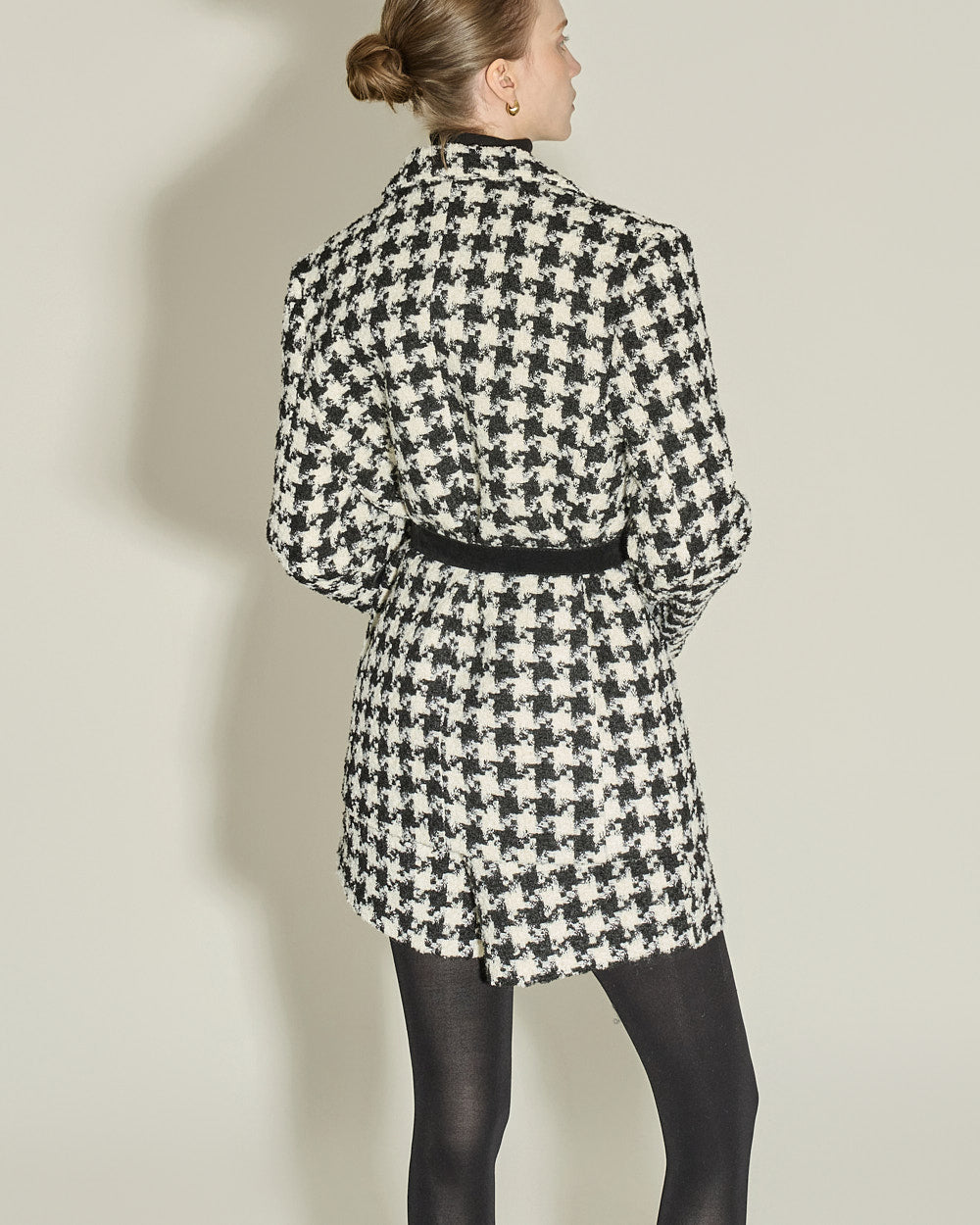 The houndstooth check pattern and beige color scheme