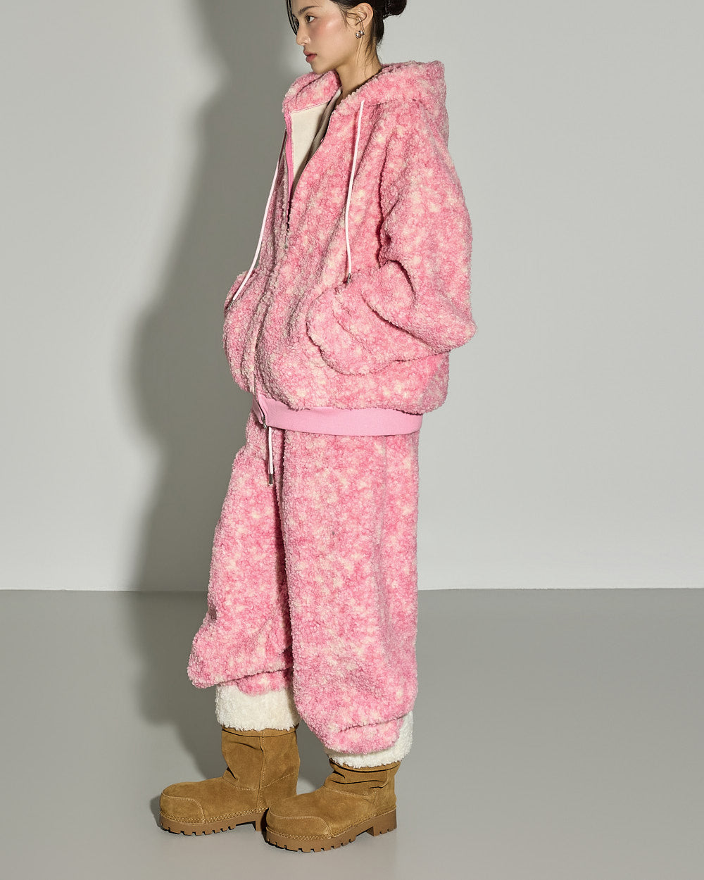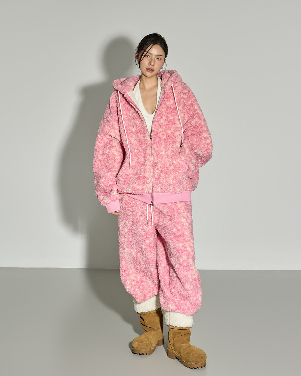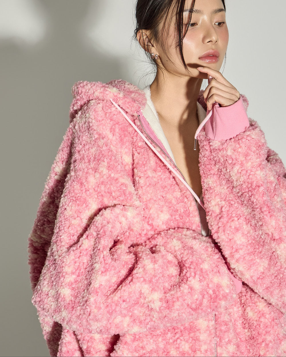 A casual teddy hooded jumper with a cozy mood.