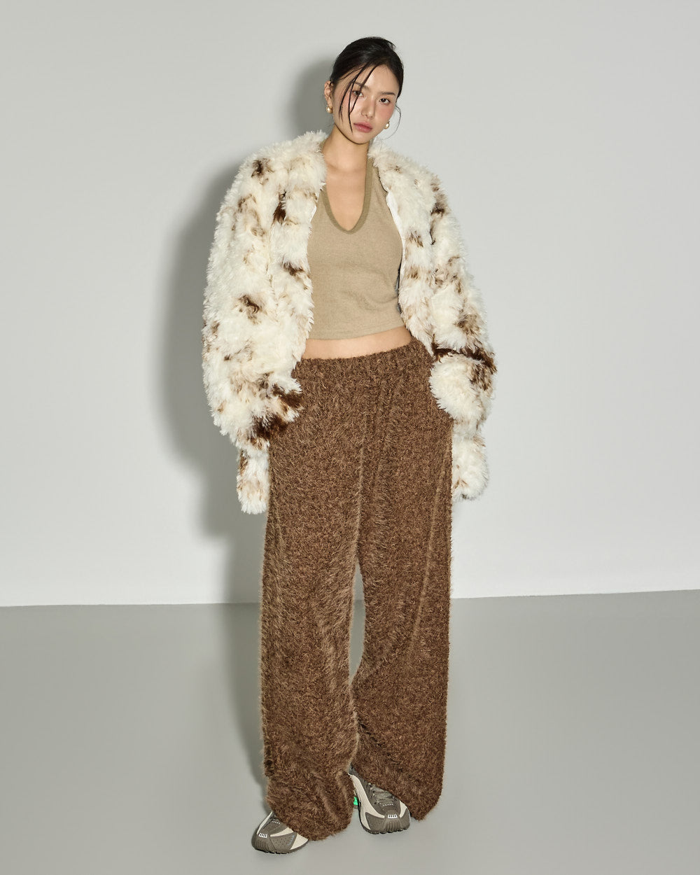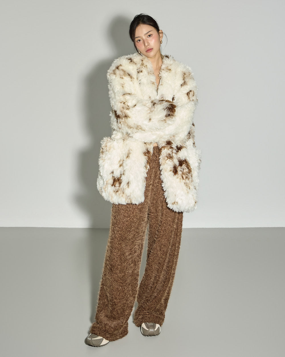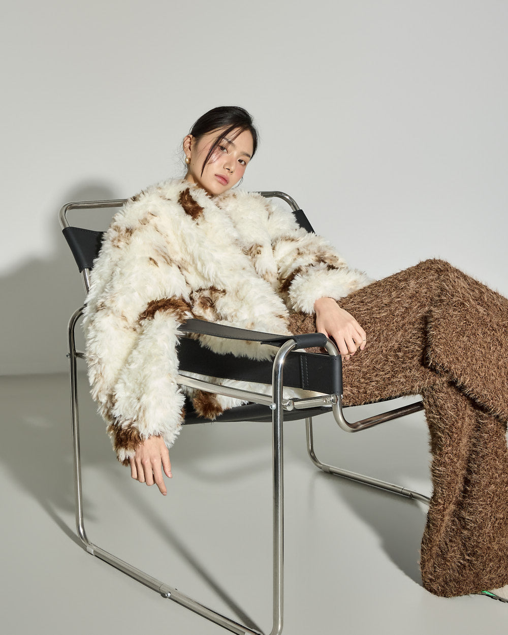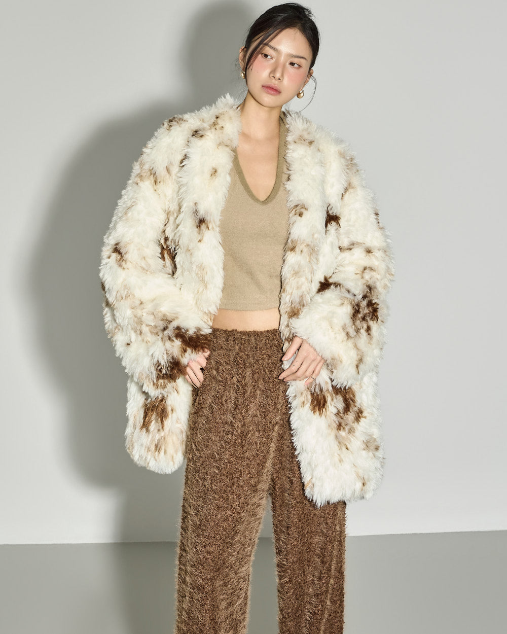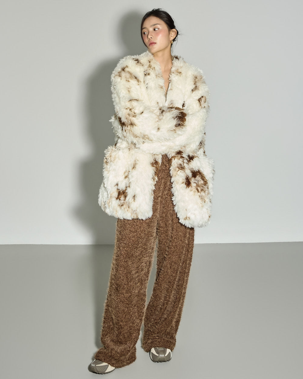 This mixed-color fur jacket has a unique vibe.