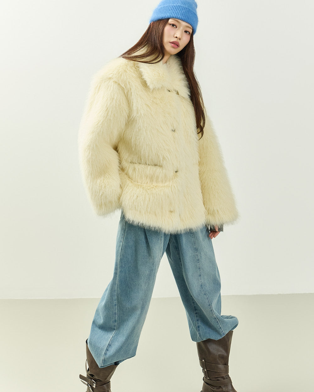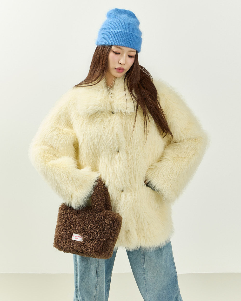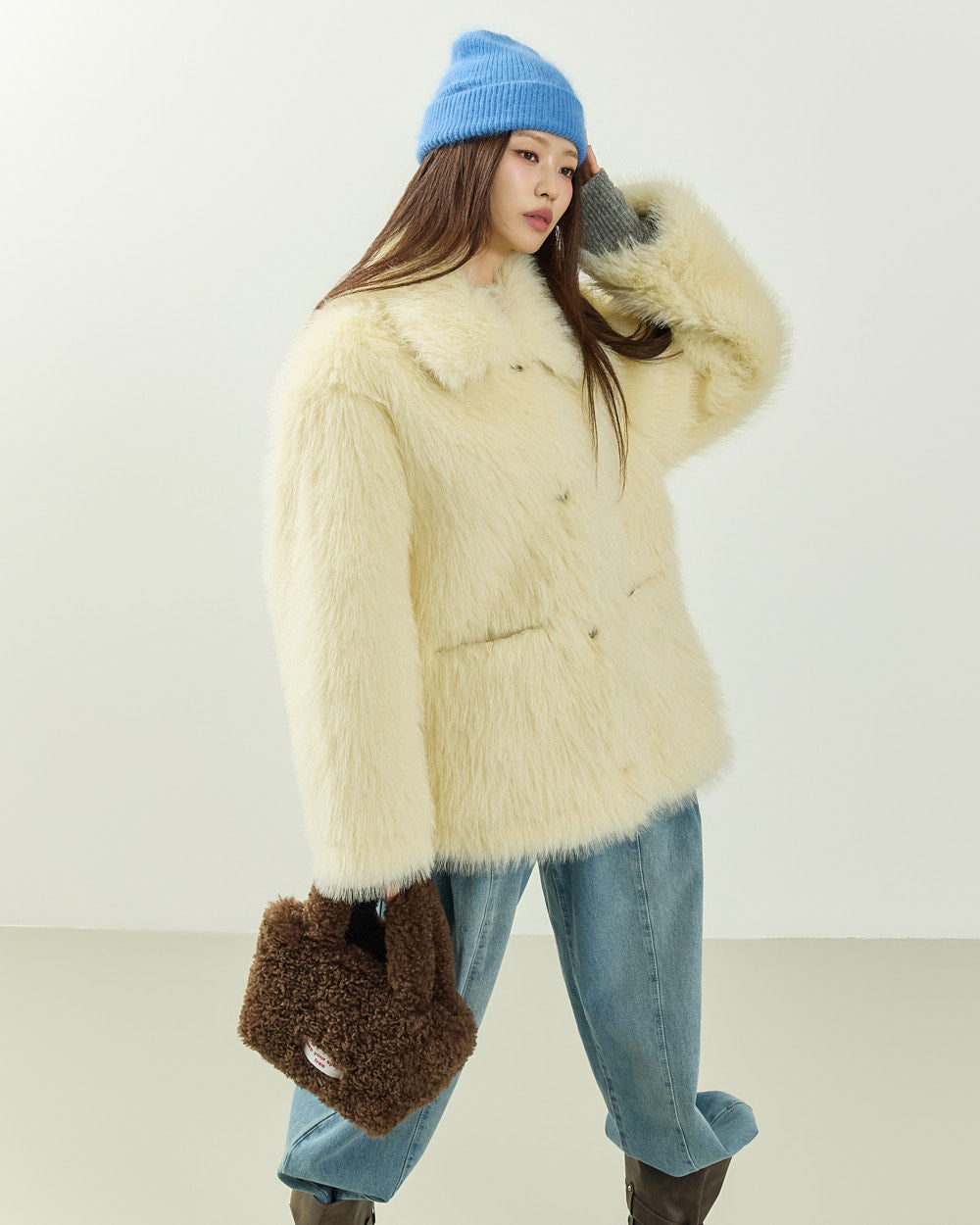 This hairy fur jacket exudes a romantic, feminine vibe.