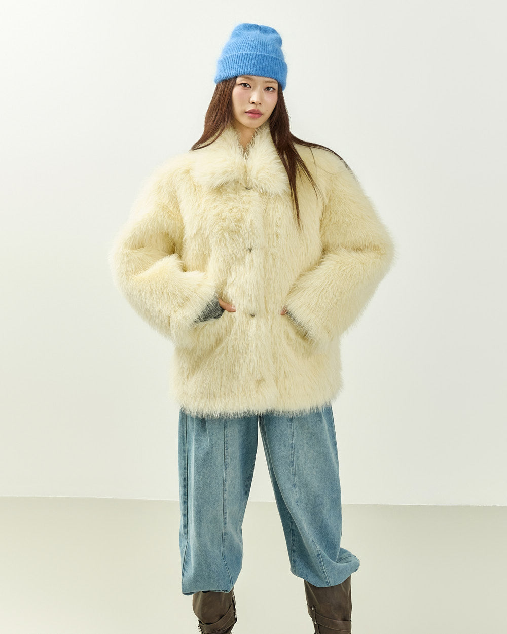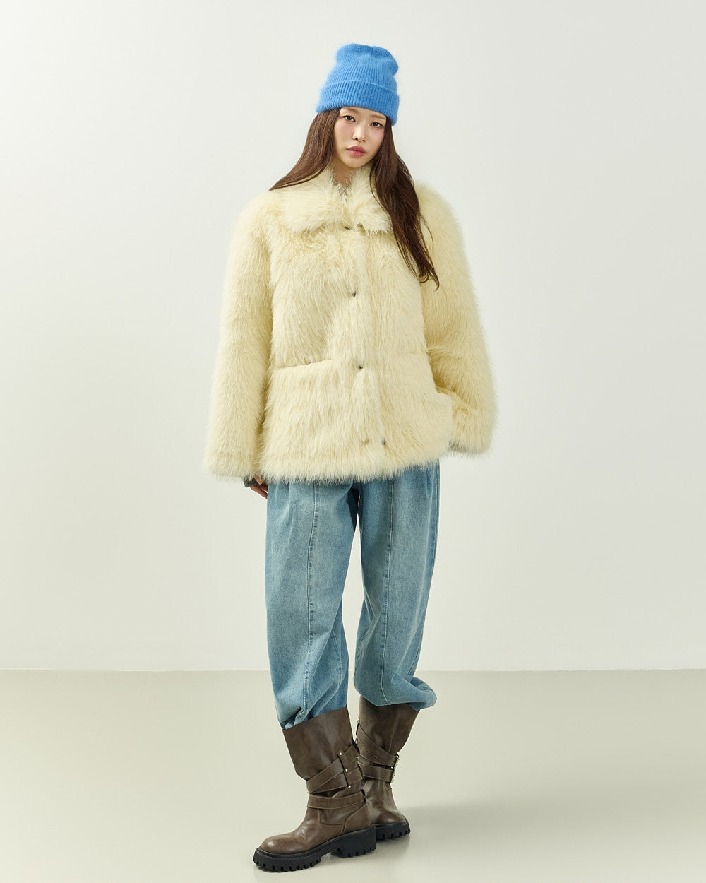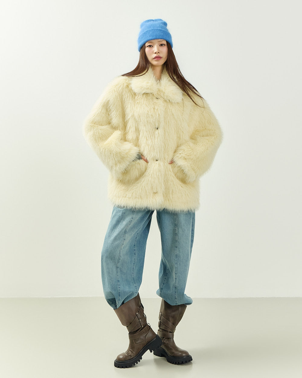 This hairy fur jacket exudes a romantic, feminine vibe.
