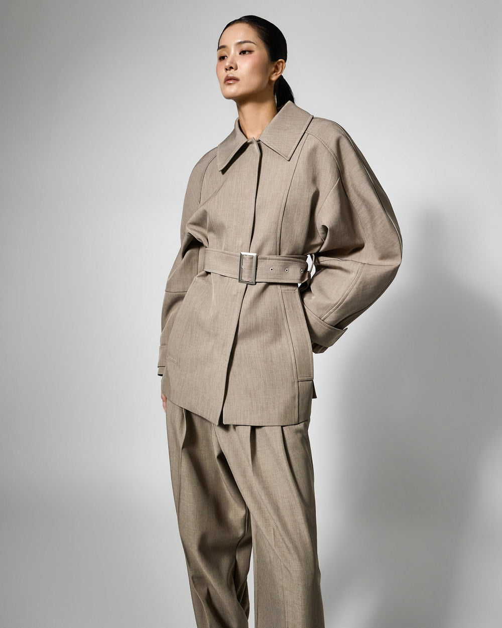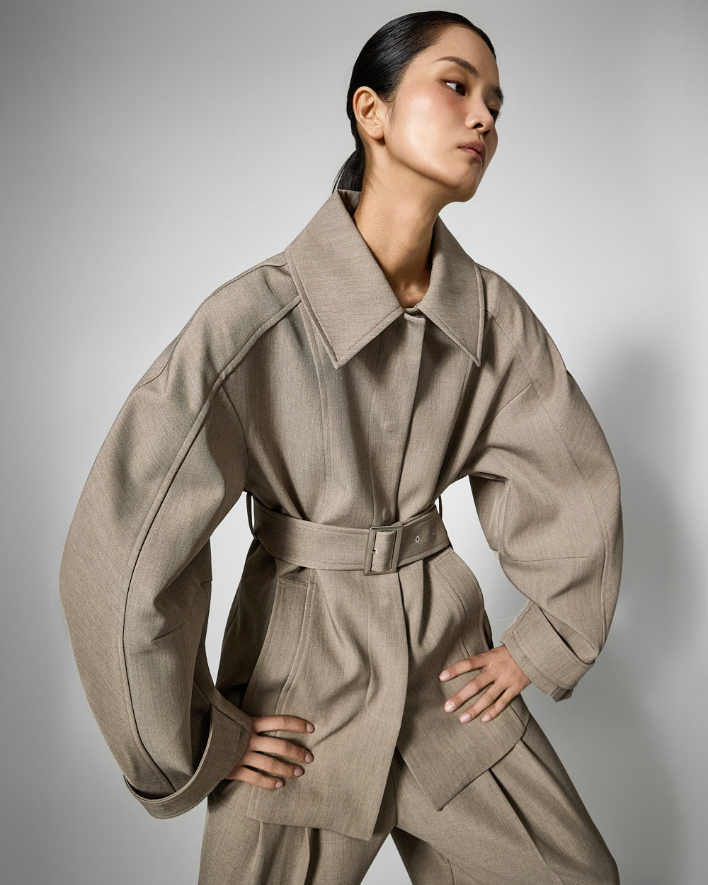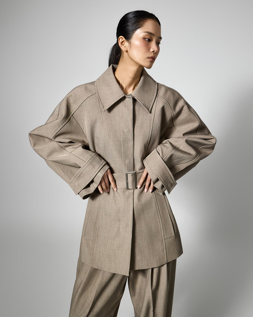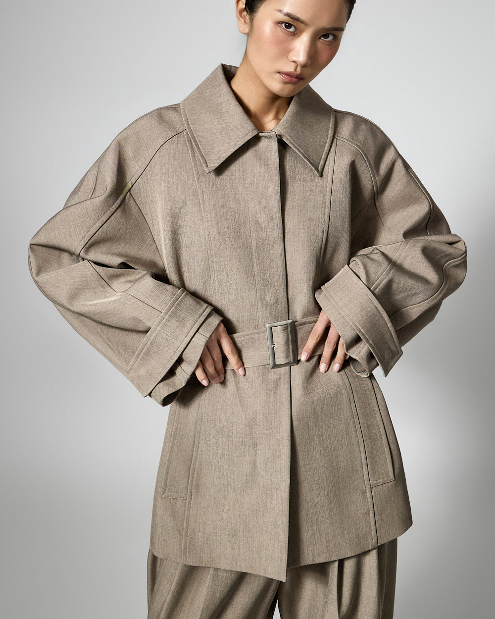 This regular raglan jacket features a modern belt set.