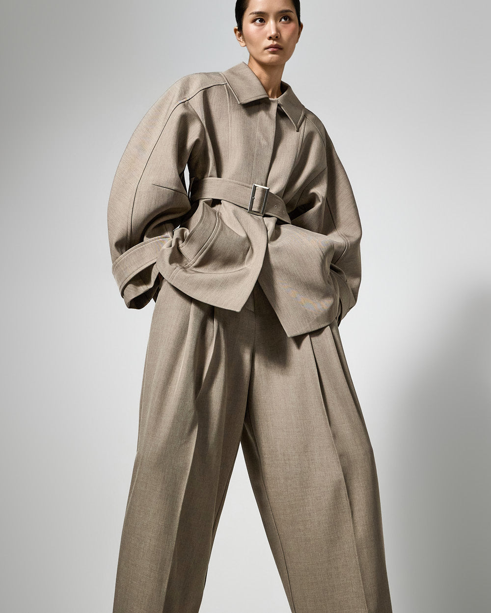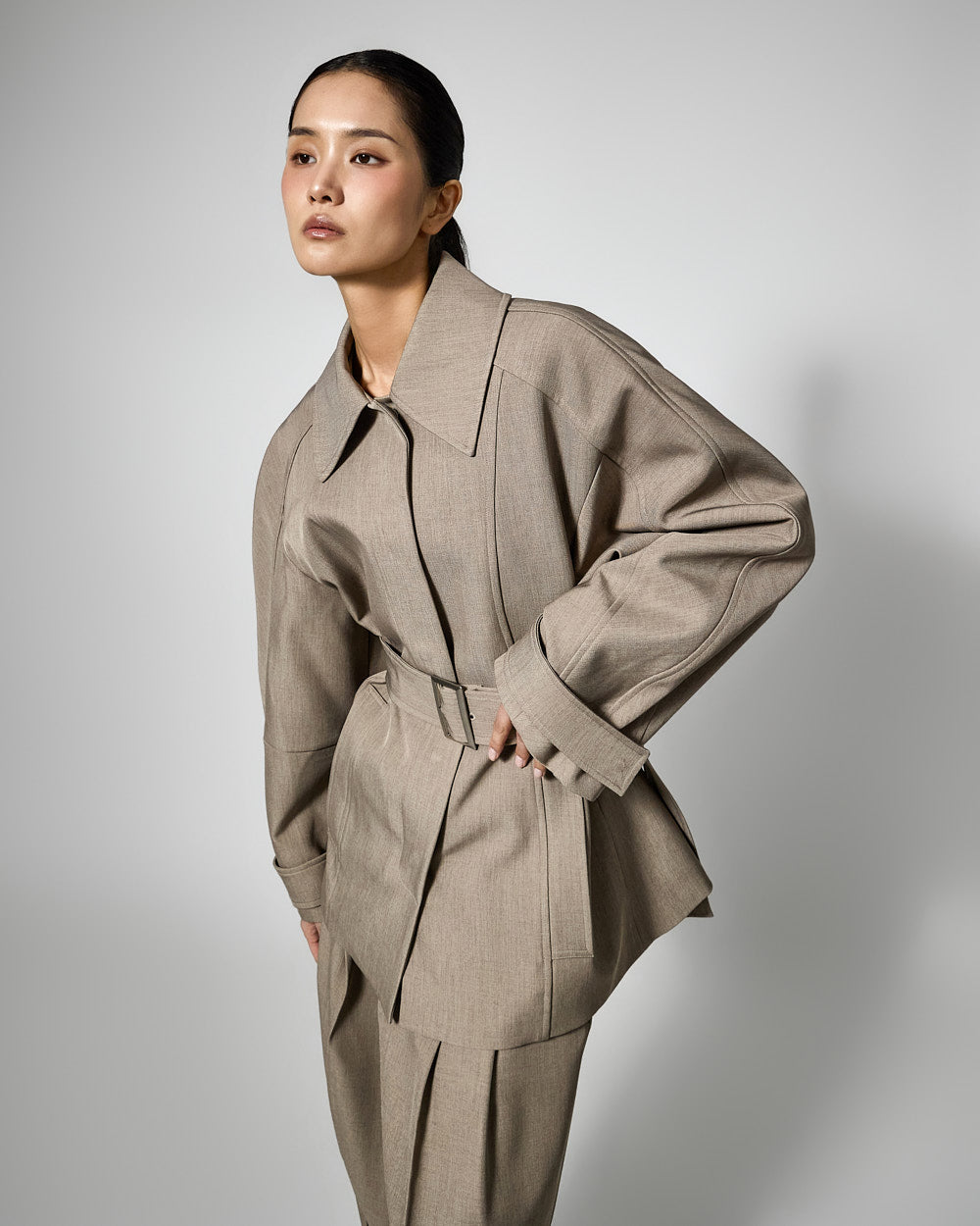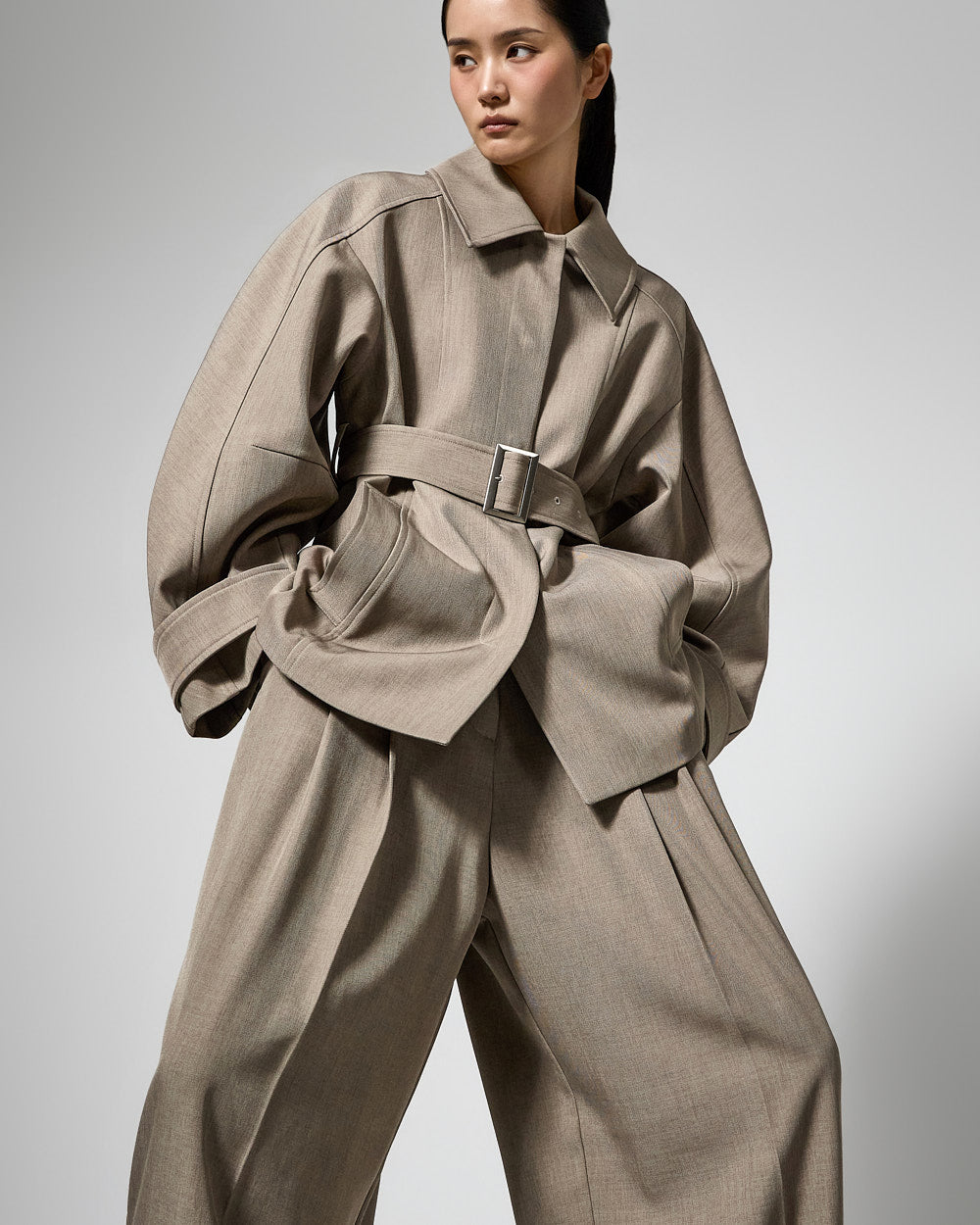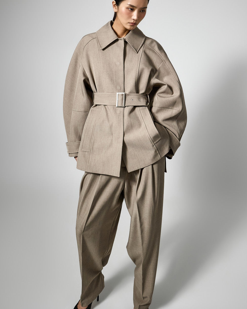 This regular raglan jacket features a modern belt set.
