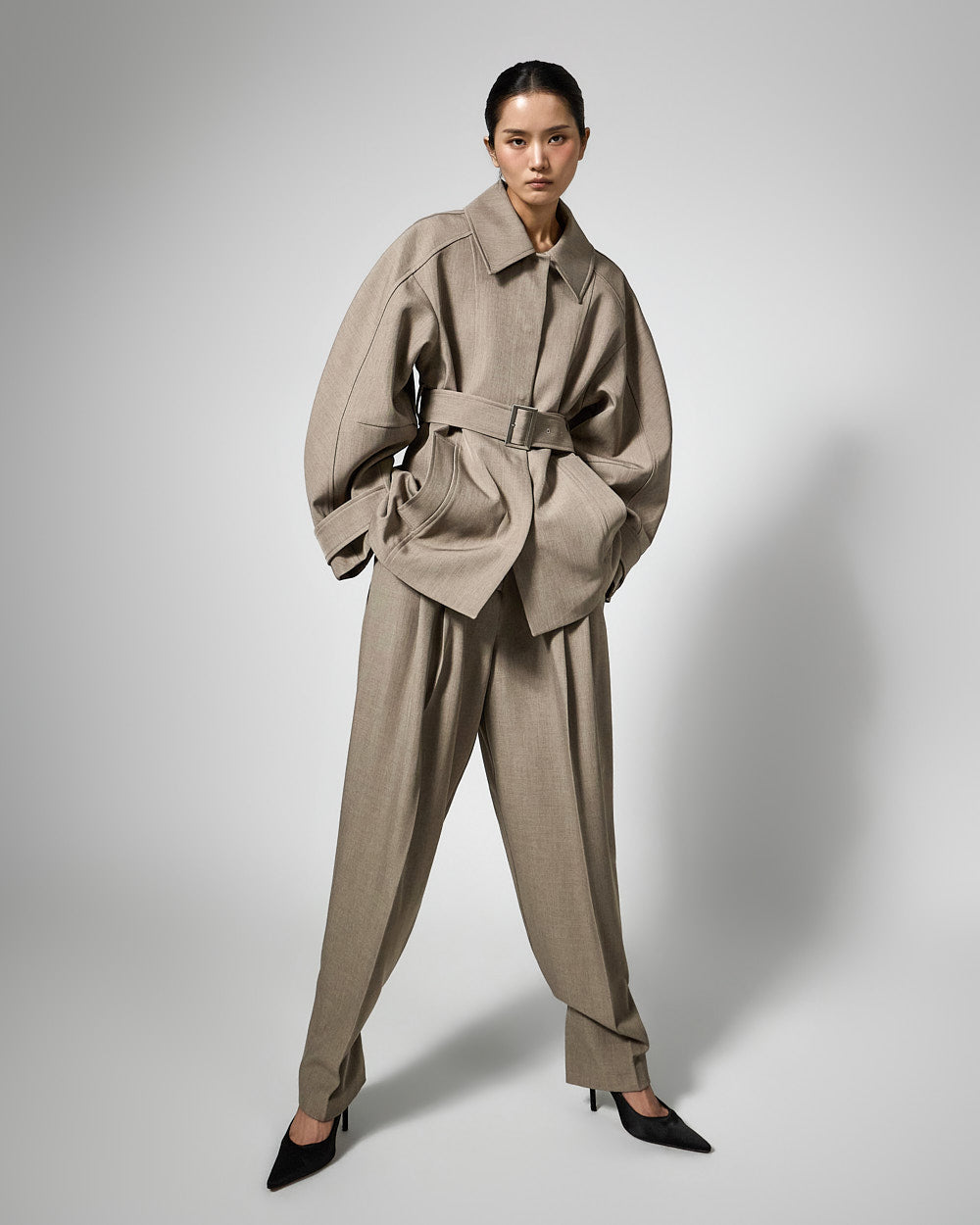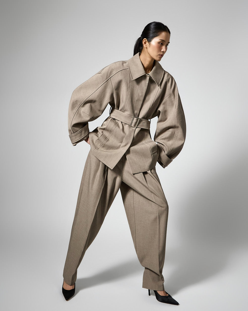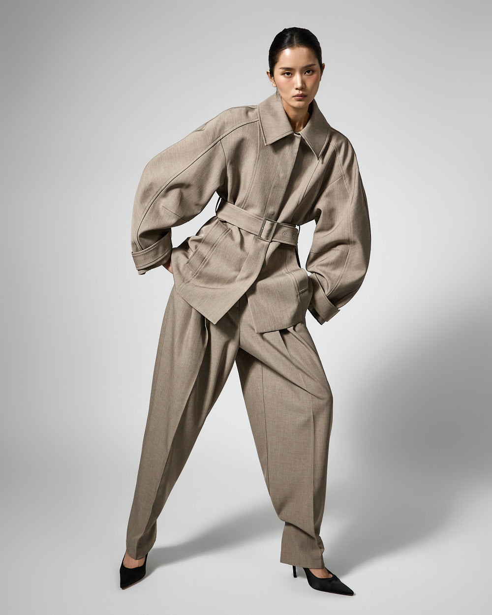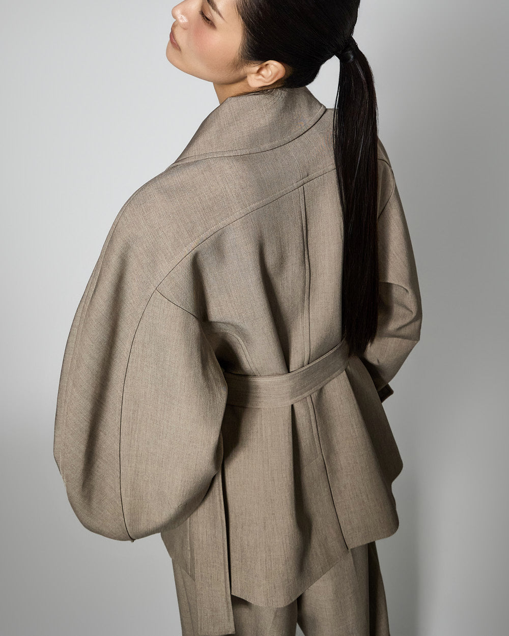 This regular raglan jacket features a modern belt set.