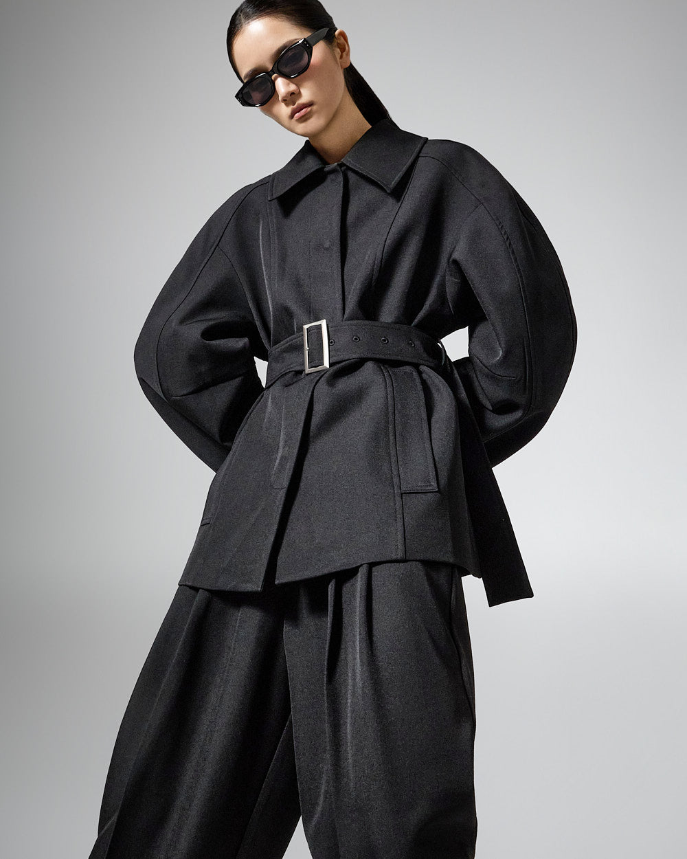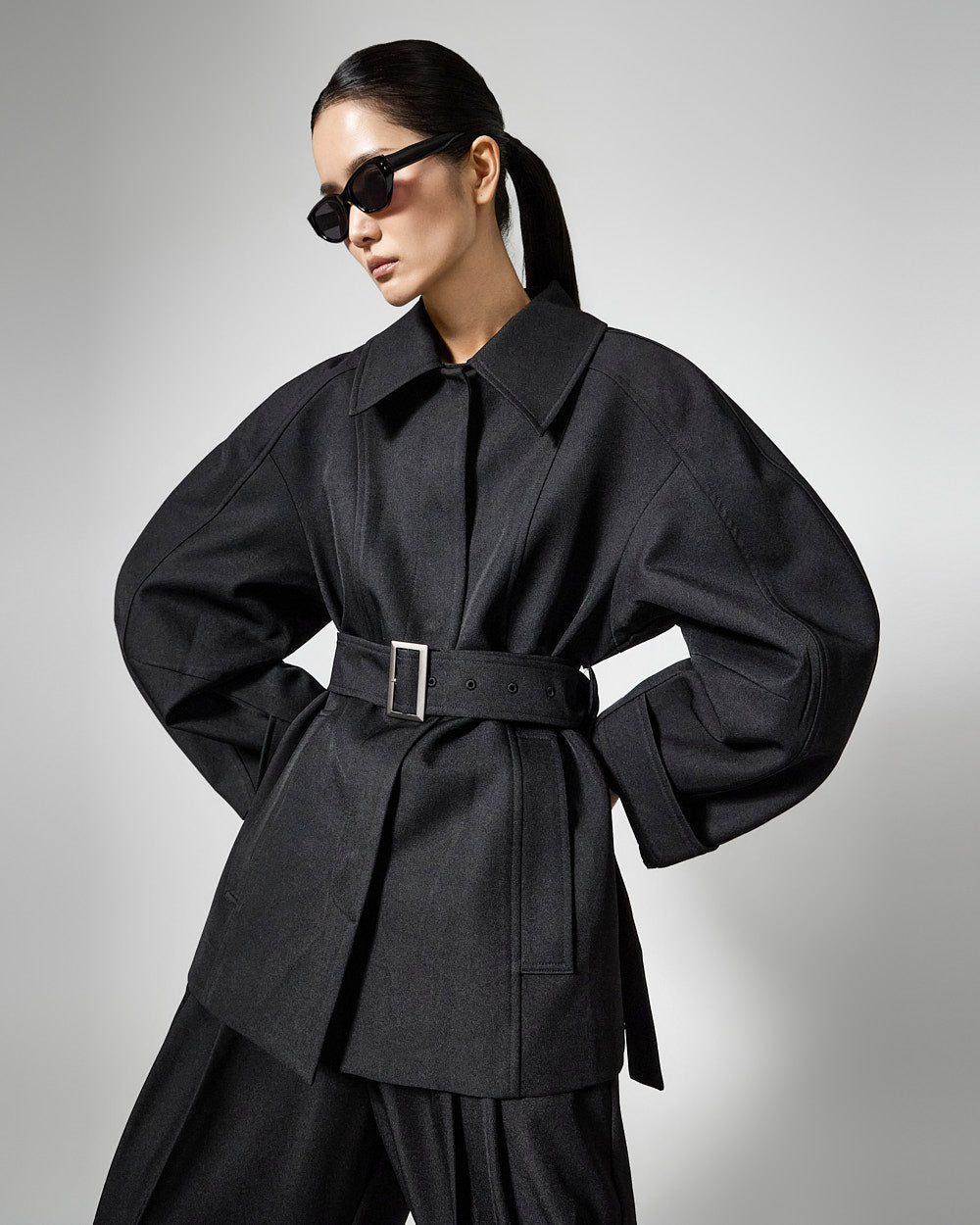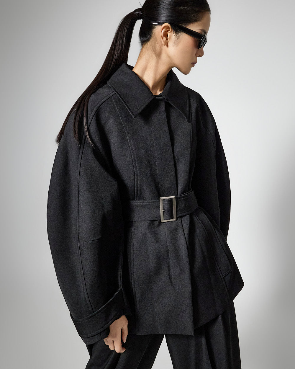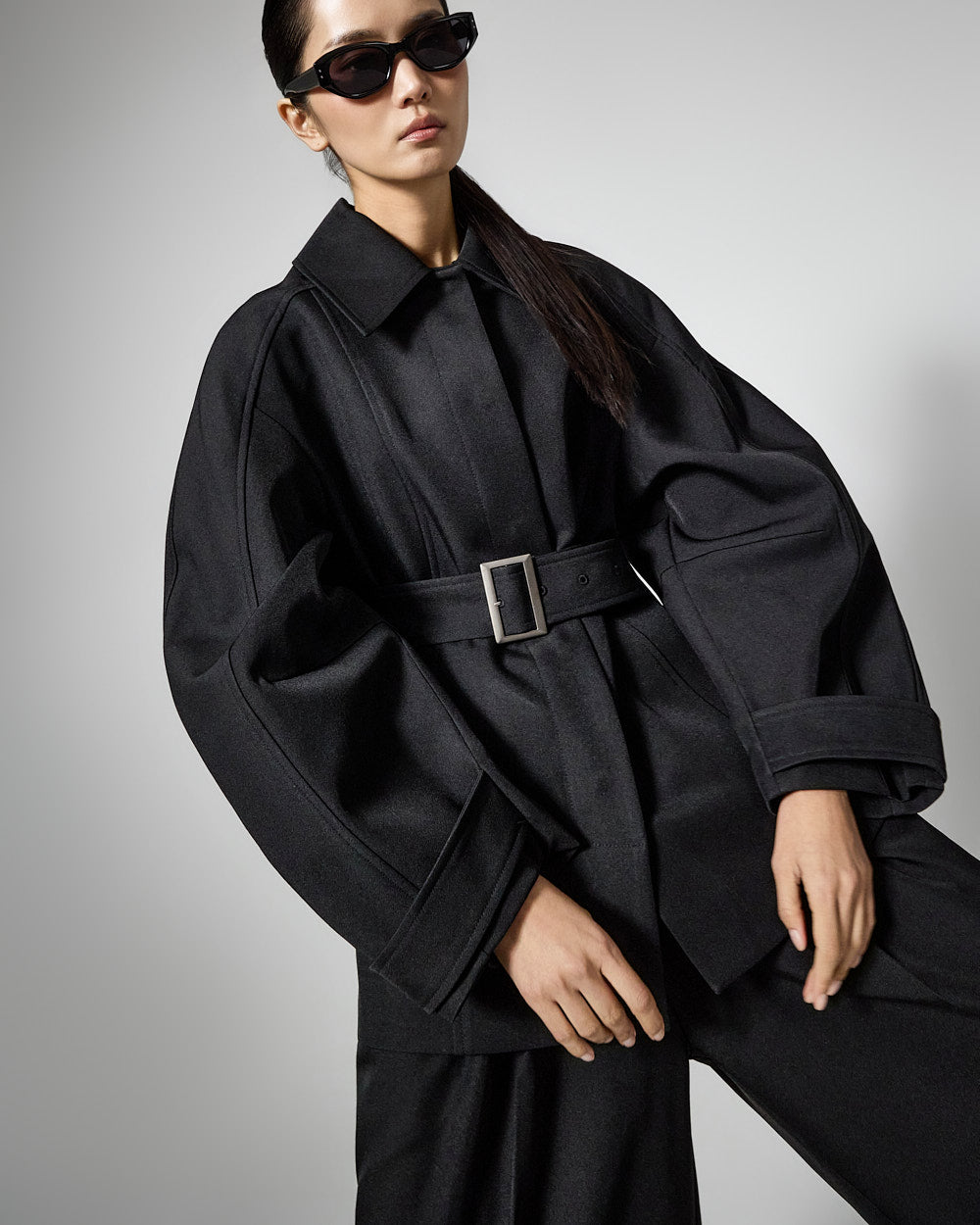 This regular raglan jacket with a belt set exudes a modern vibe.