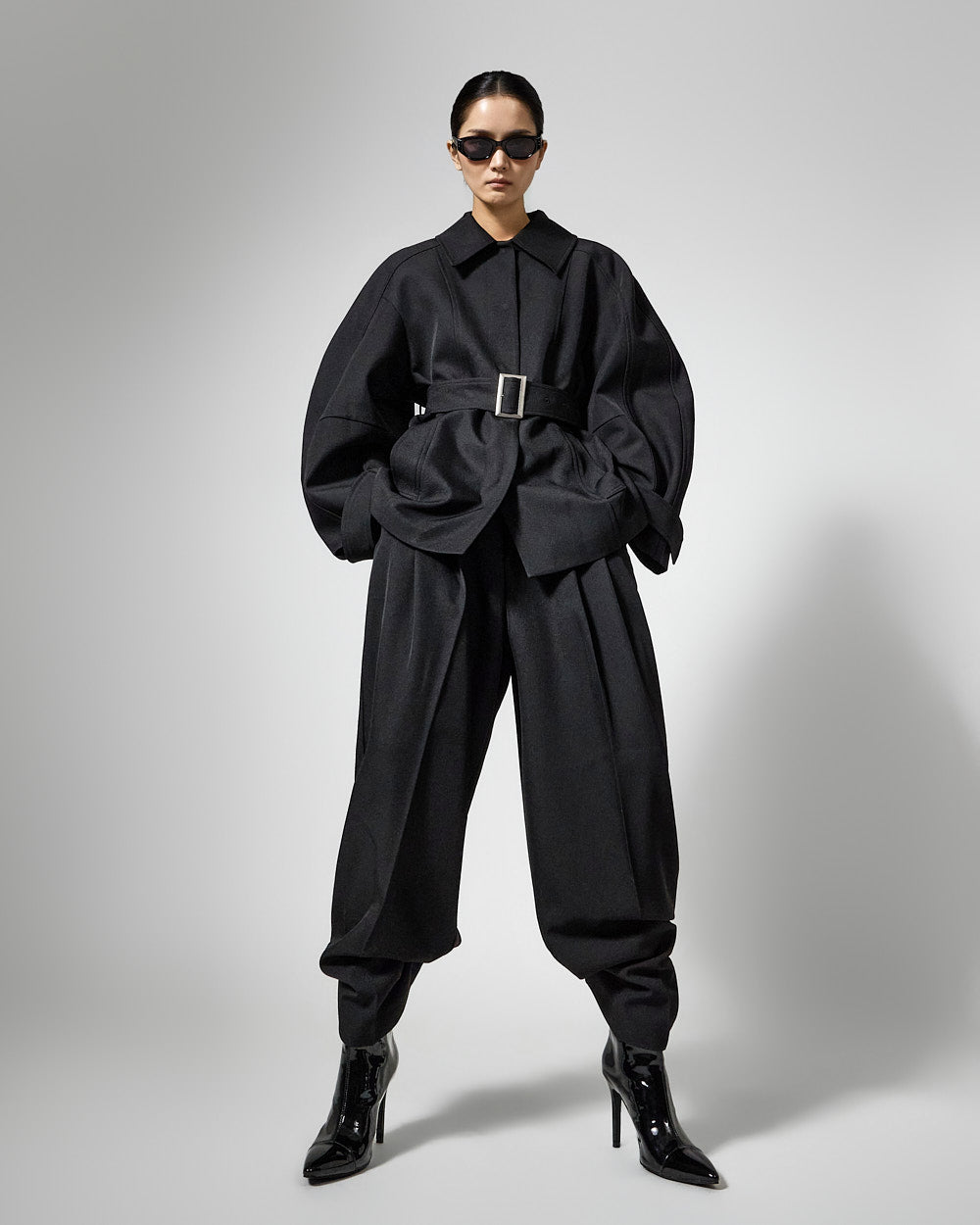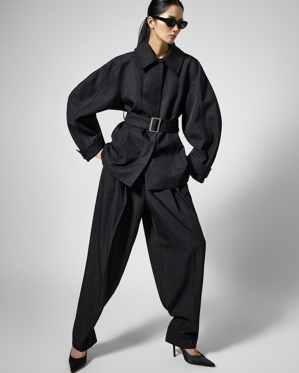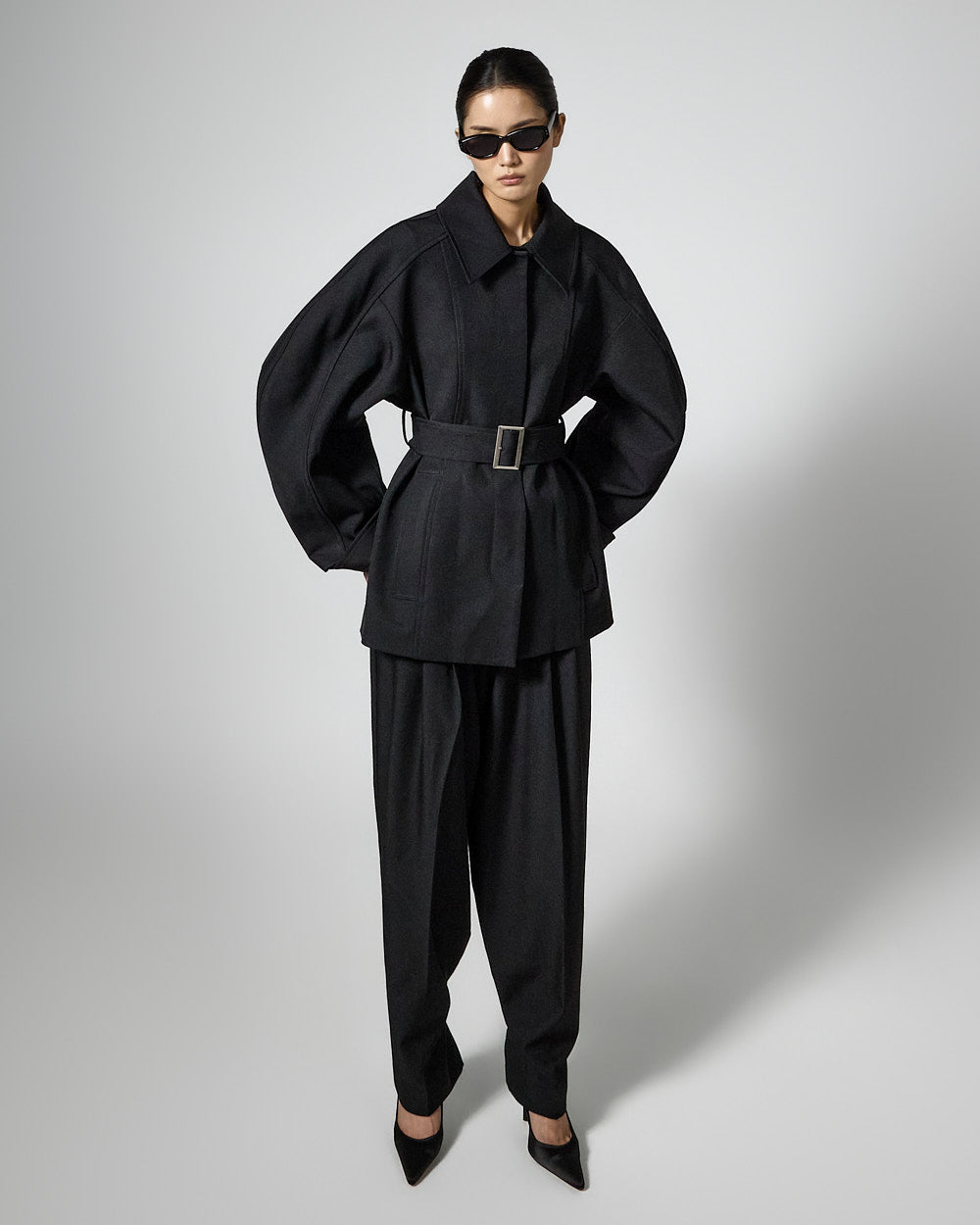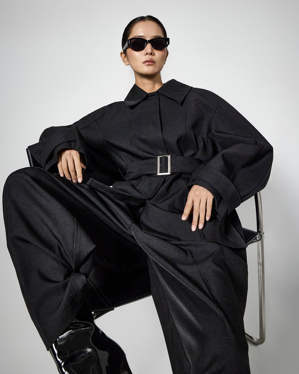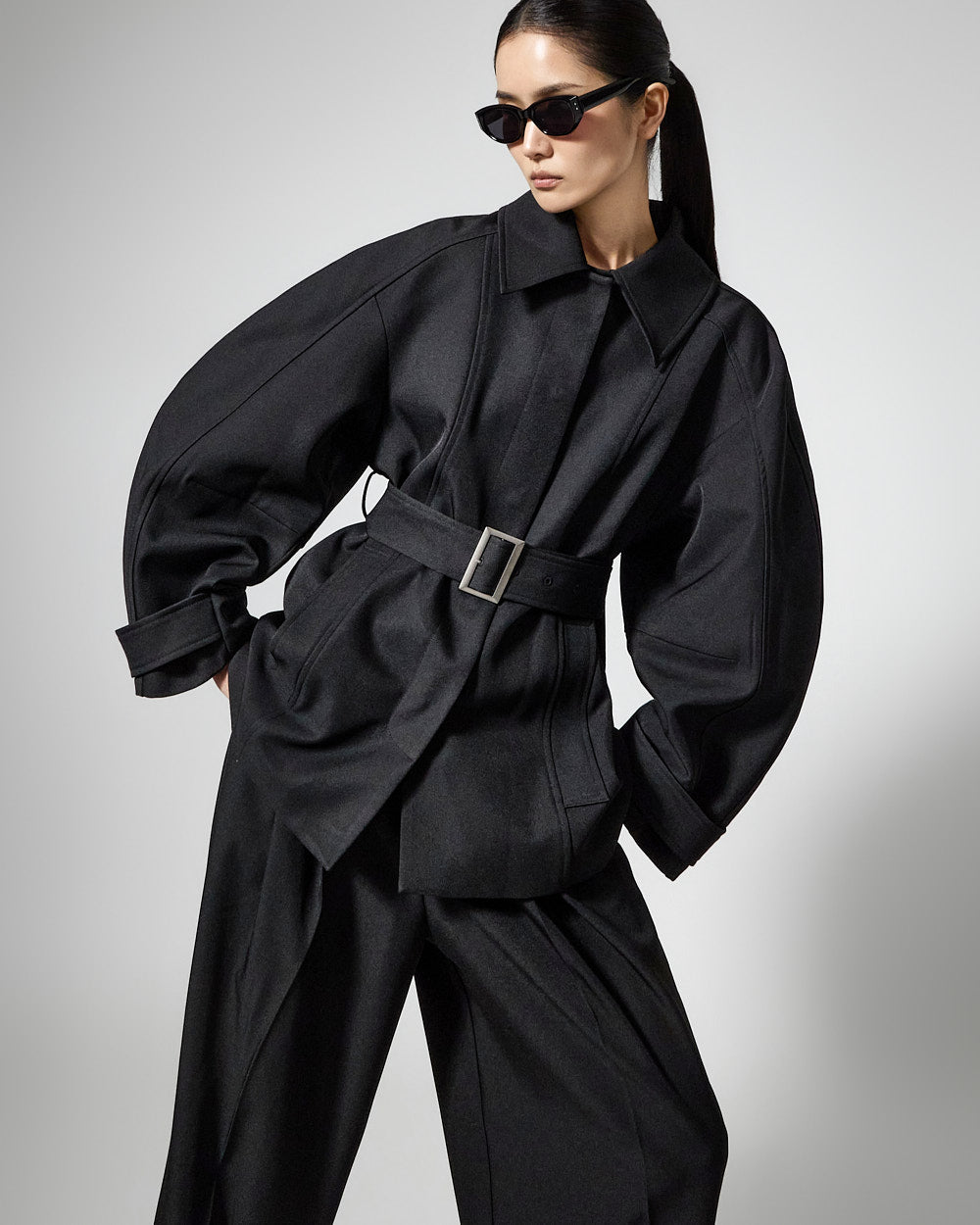 This regular raglan jacket with a belt set exudes a modern vibe.