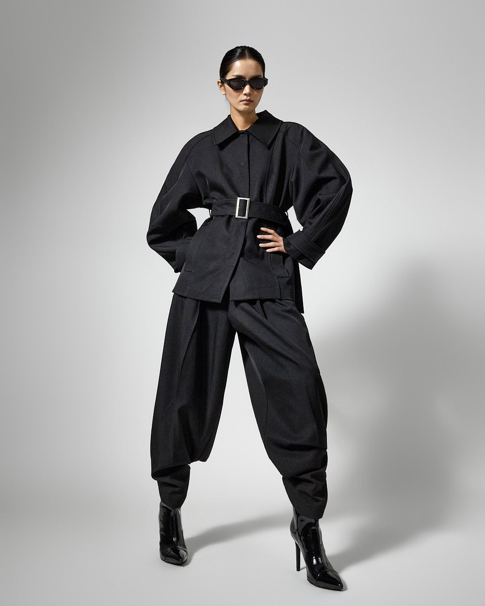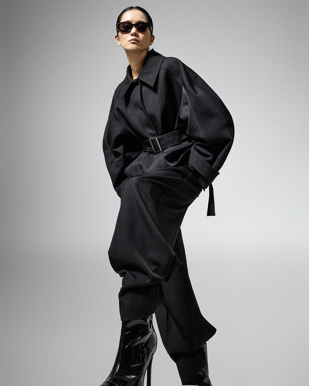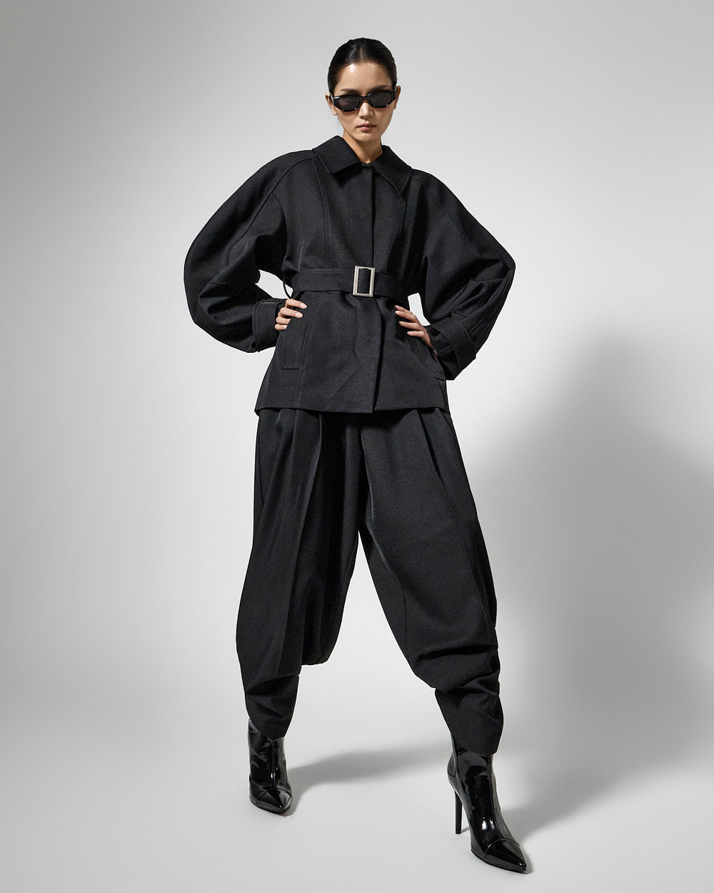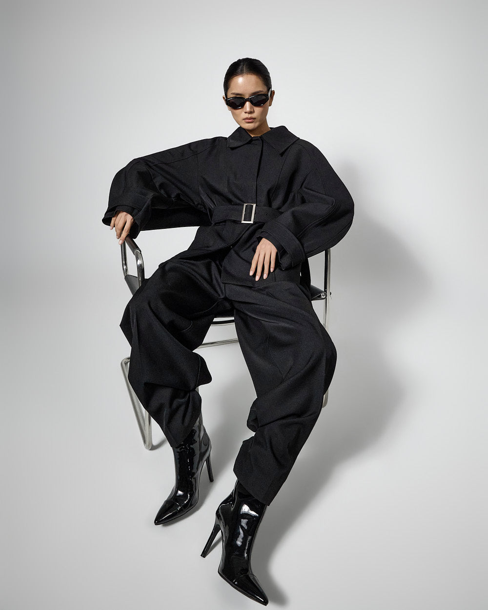 This regular raglan jacket with a belt set exudes a modern vibe.