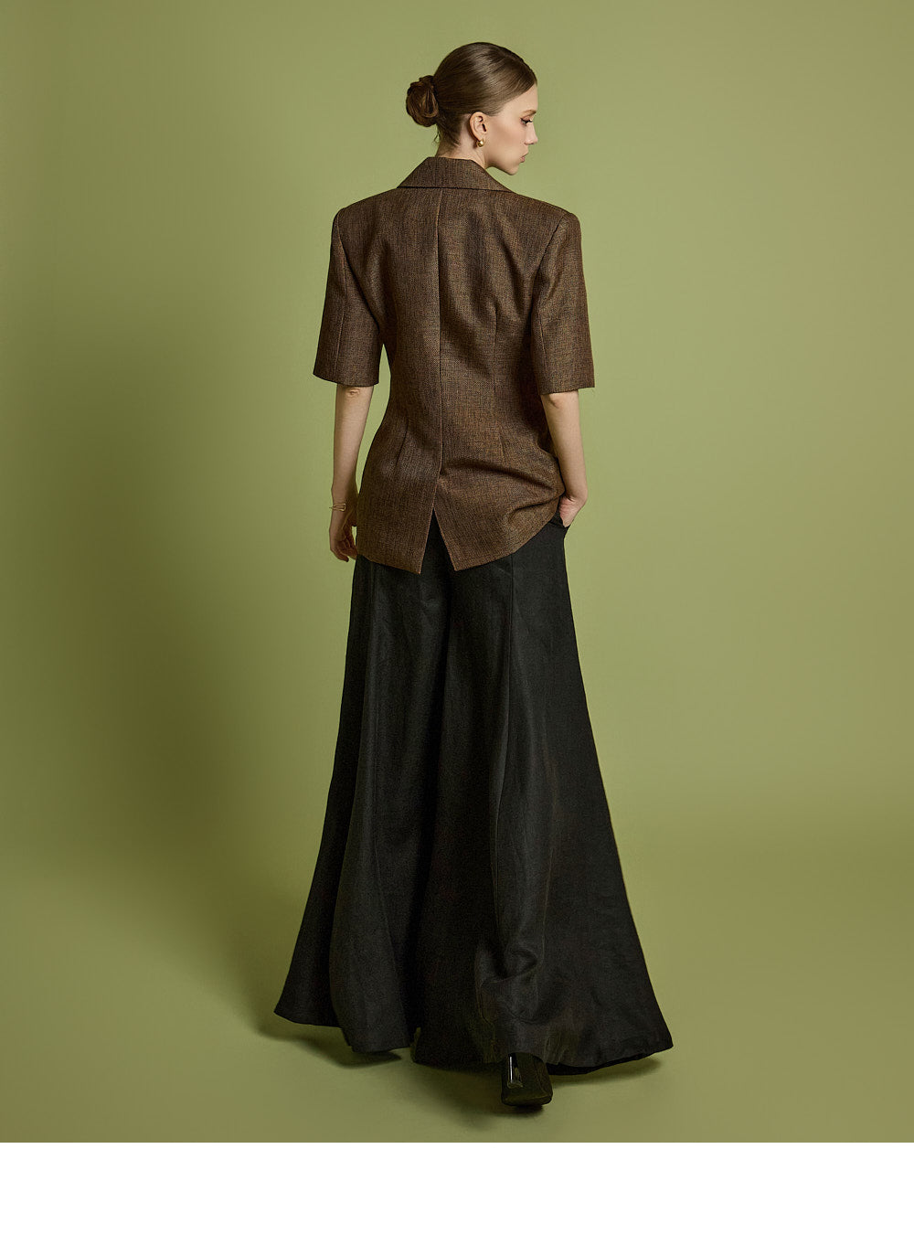 すっきりとしたシルエットに肩パッドがアクセントになった半袖デザイン。