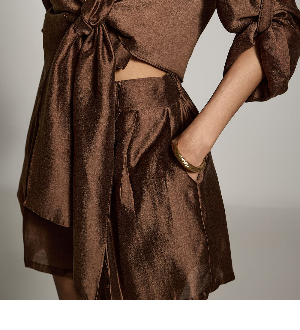 このユニークなテンセルショートパンツは、テンセルとポリエステルの混紡素材で作られています。