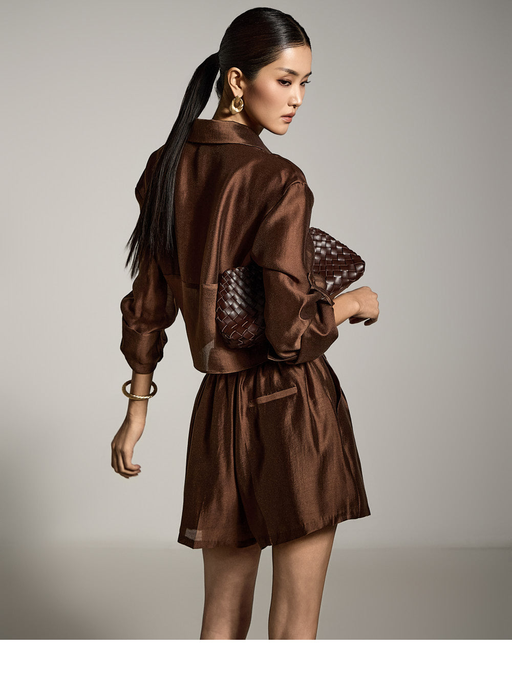 モデルの身長は173cm、ブラウンのワンサイズを着用。