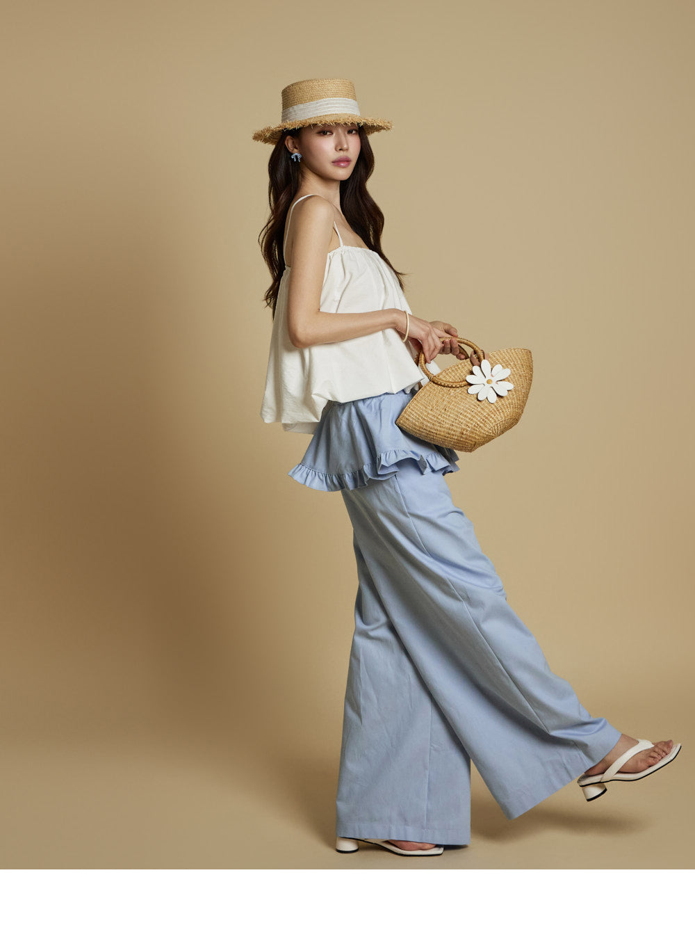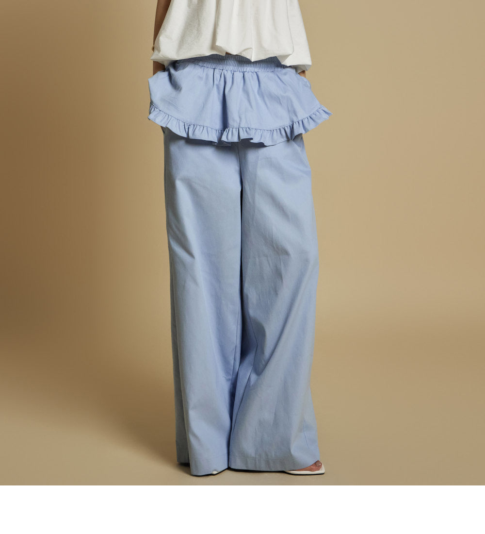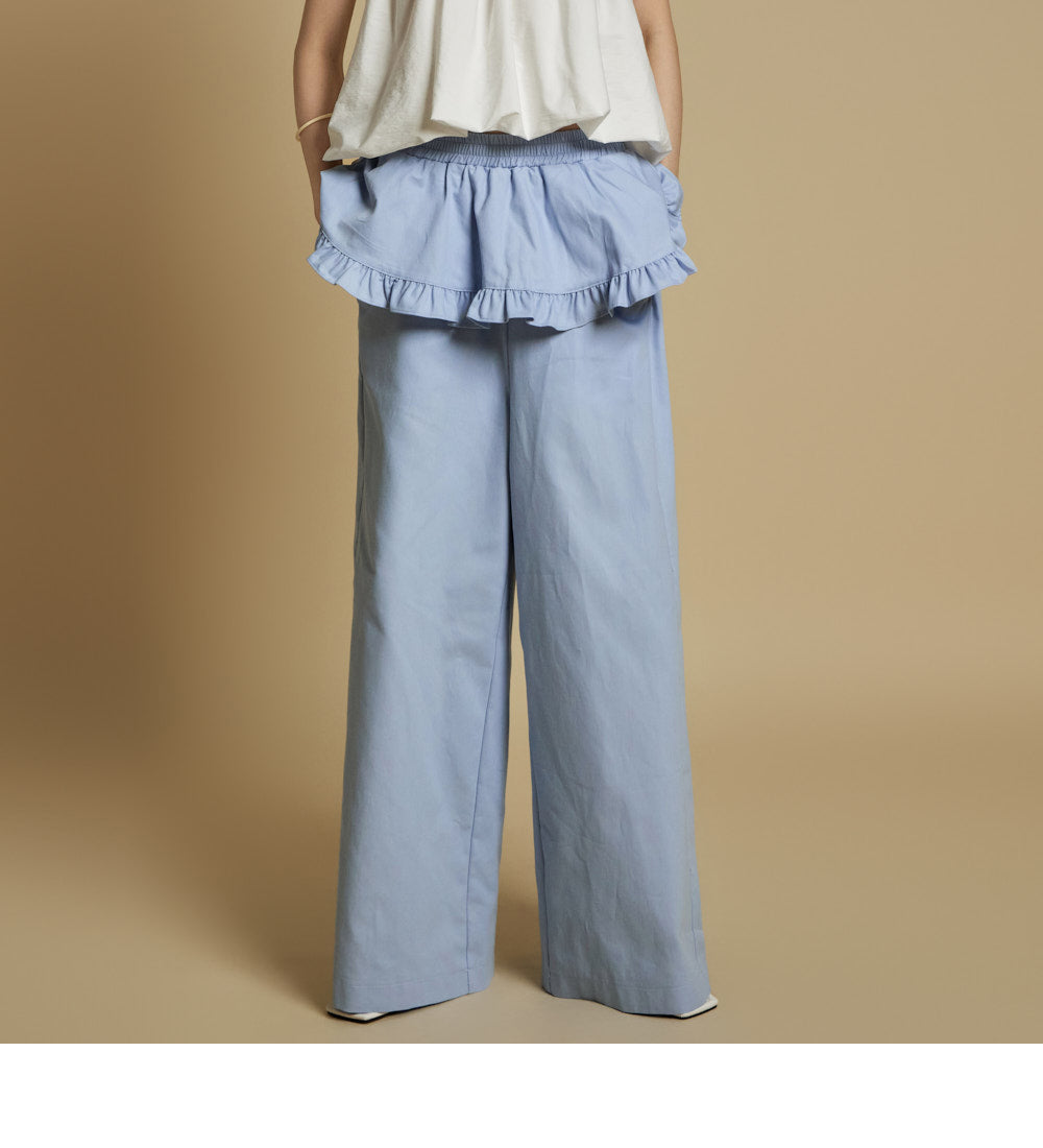 パンツのフリルレイヤードディテールが魅力的でユニークなタッチを加えます。