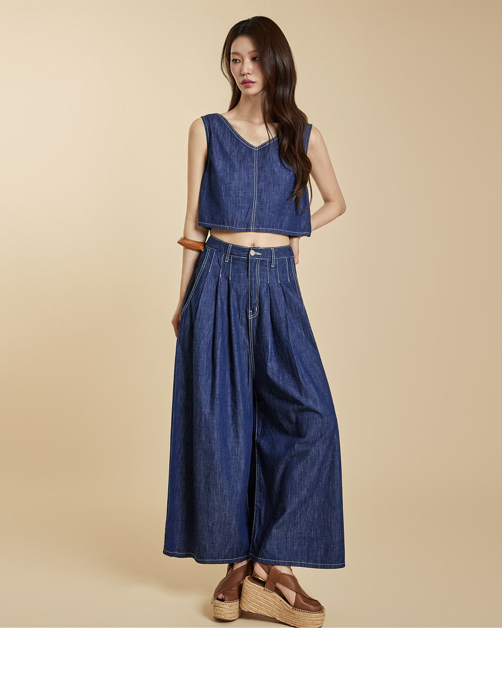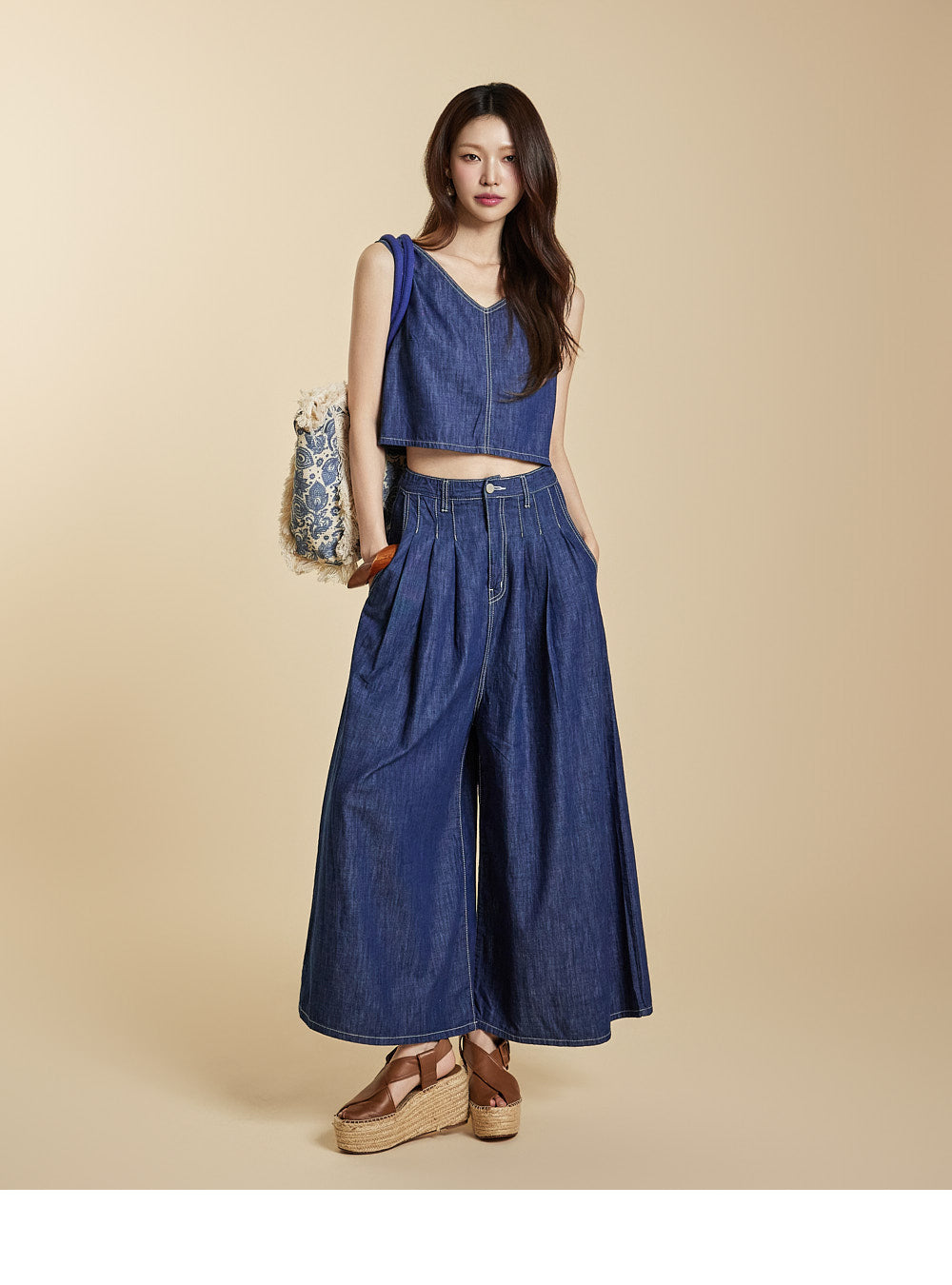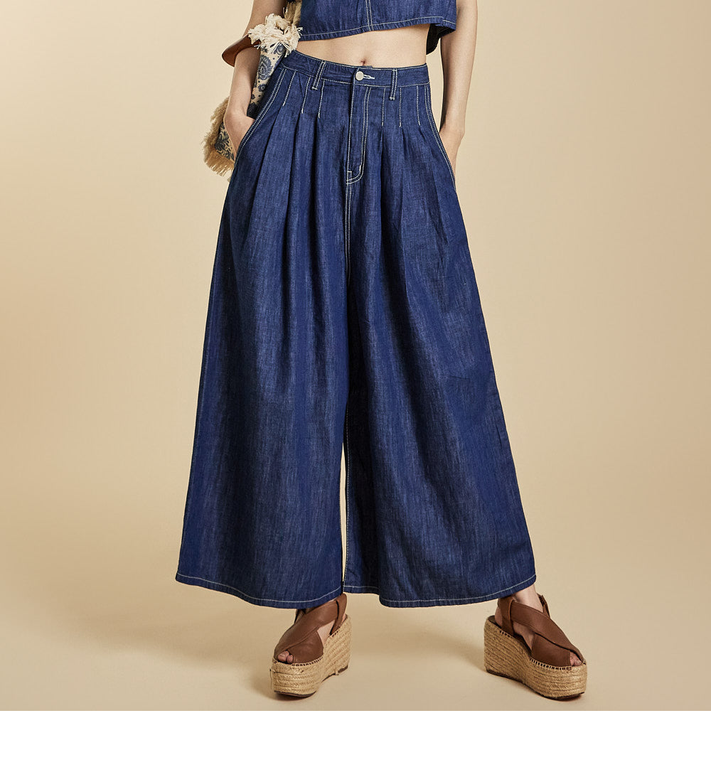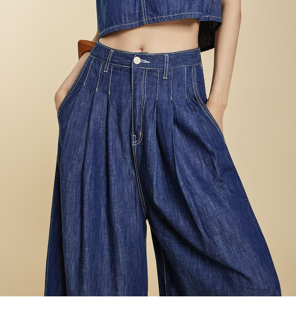 カジュアルスタイルのプリーツワイドレッグデニムパンツ