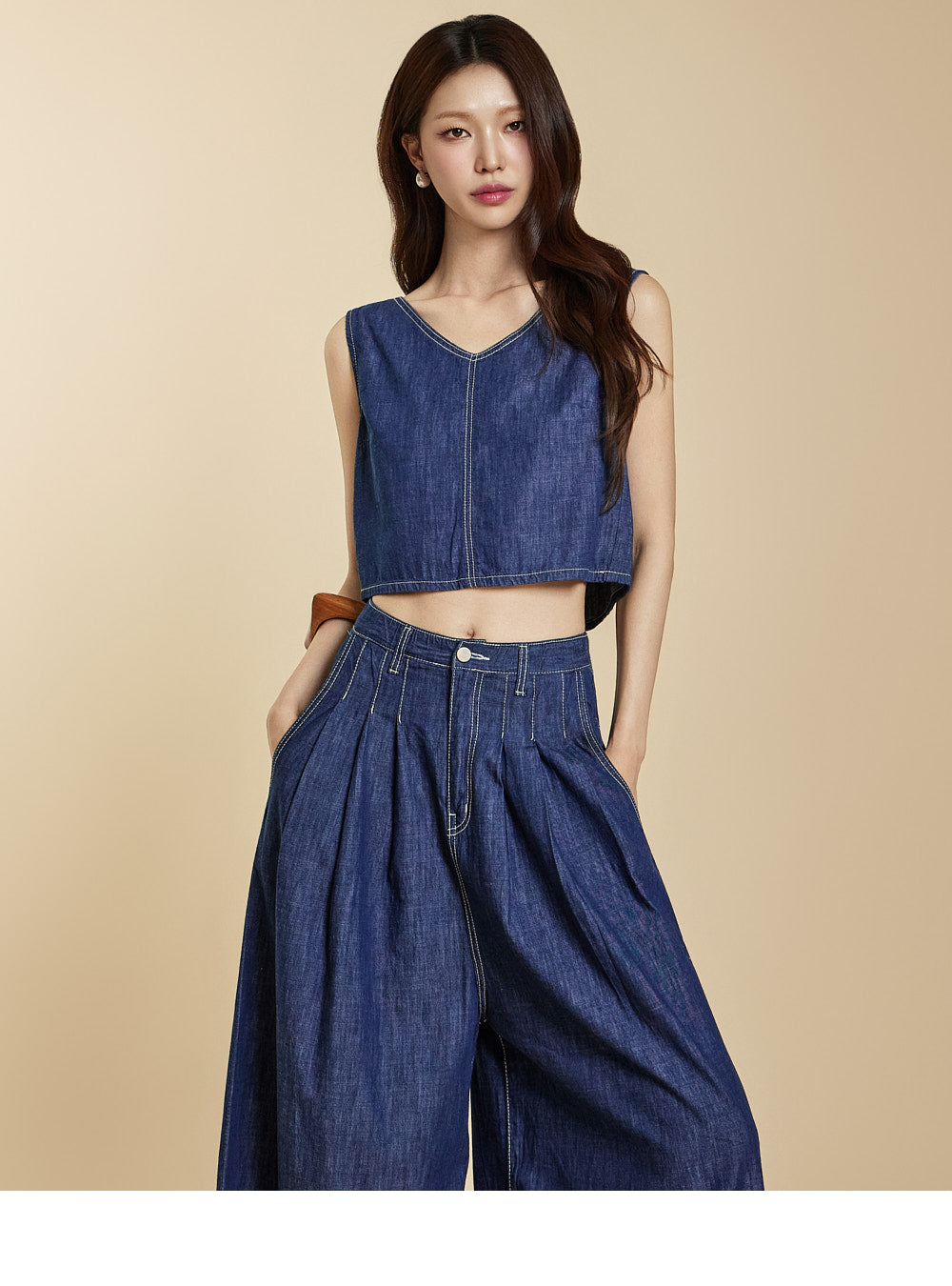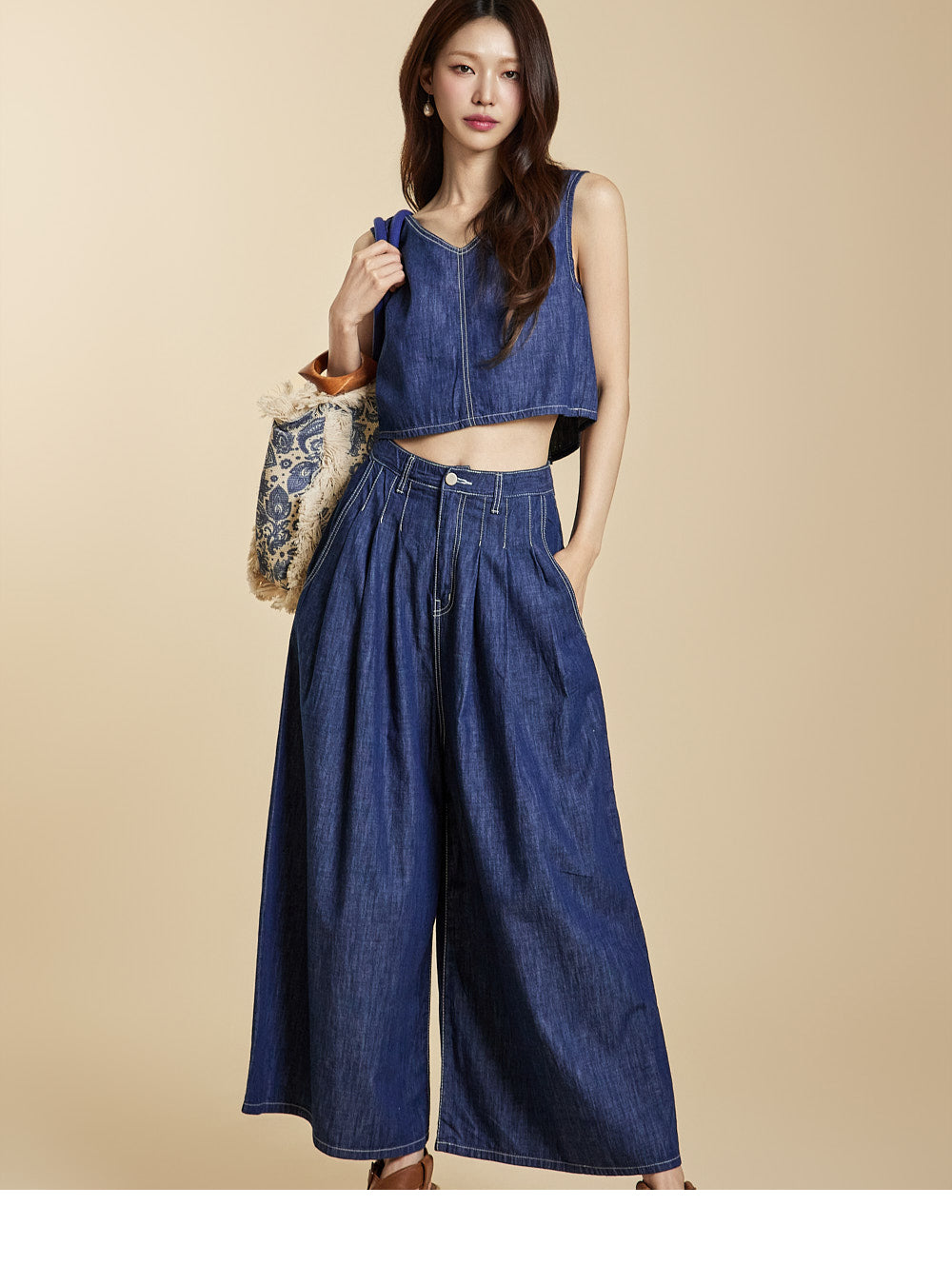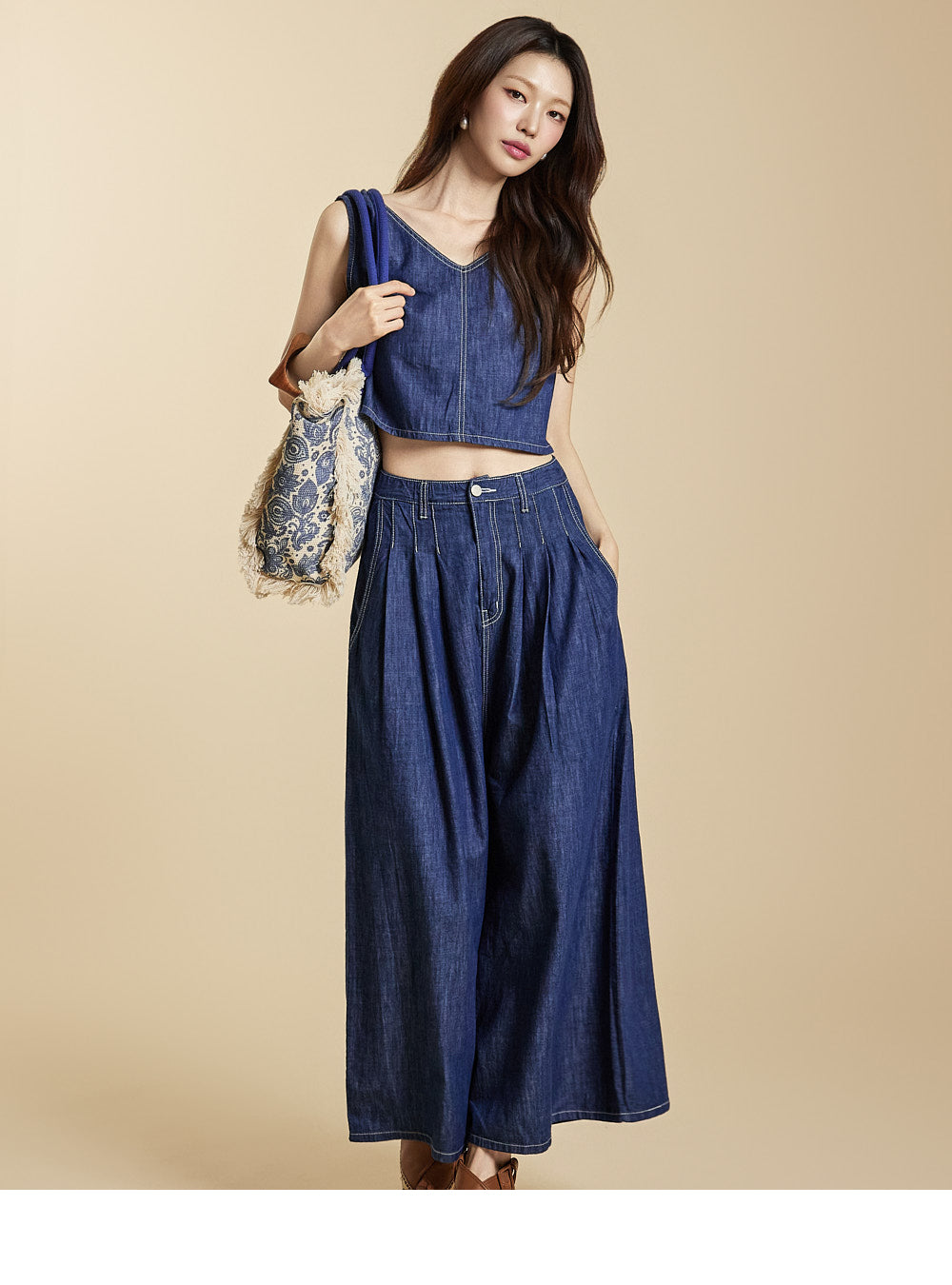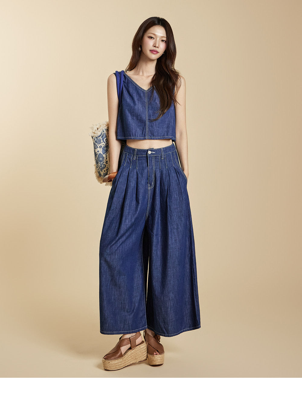 カジュアルスタイルのプリーツワイドレッグデニムパンツ