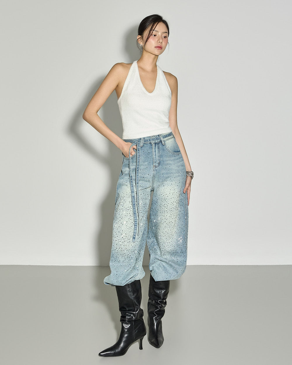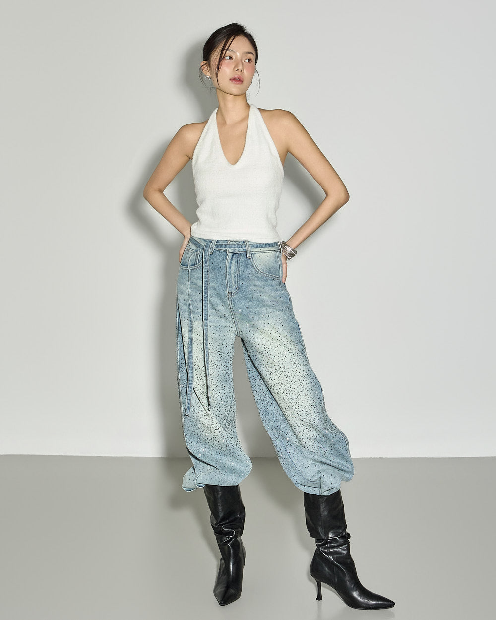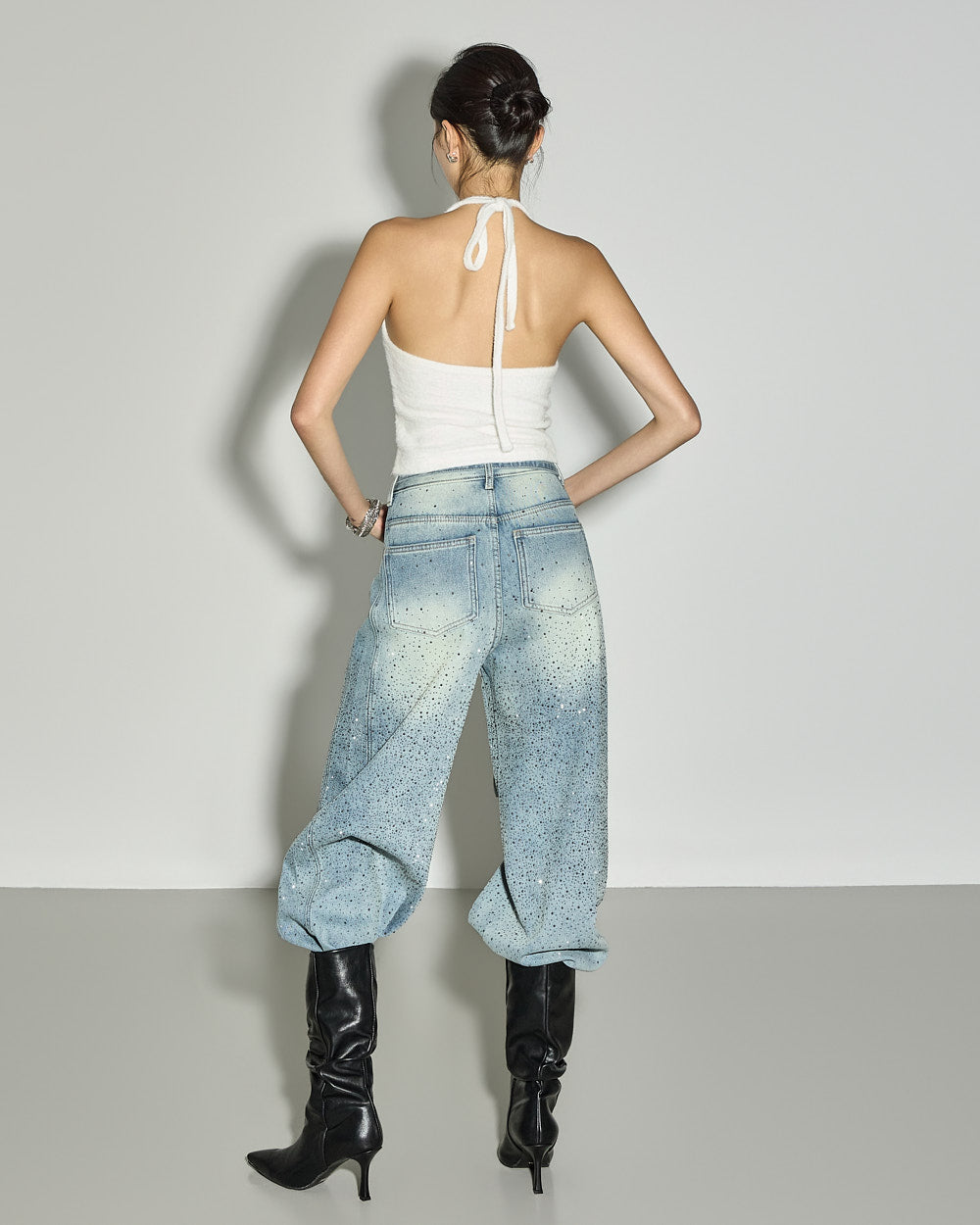 These strap set studded jeans offer a unique style.