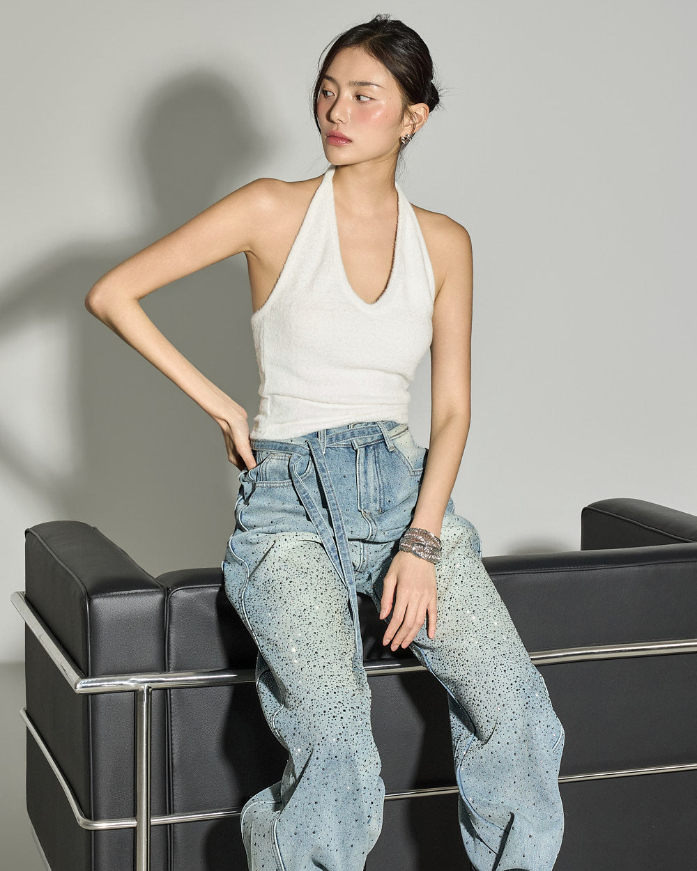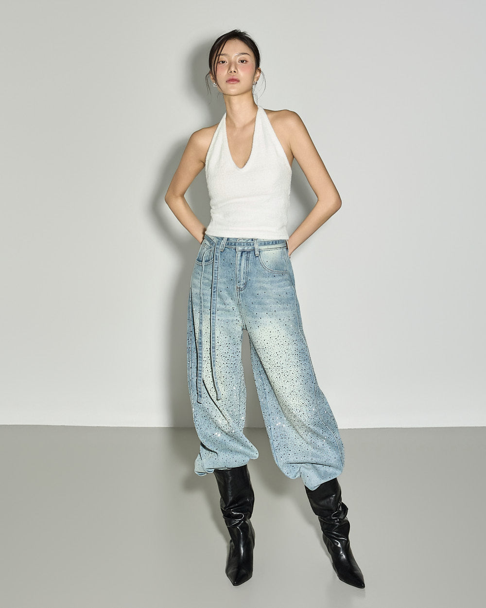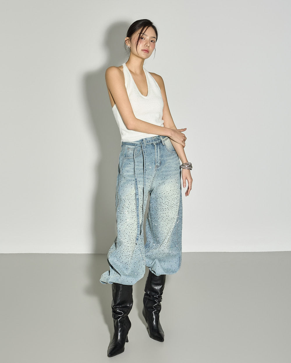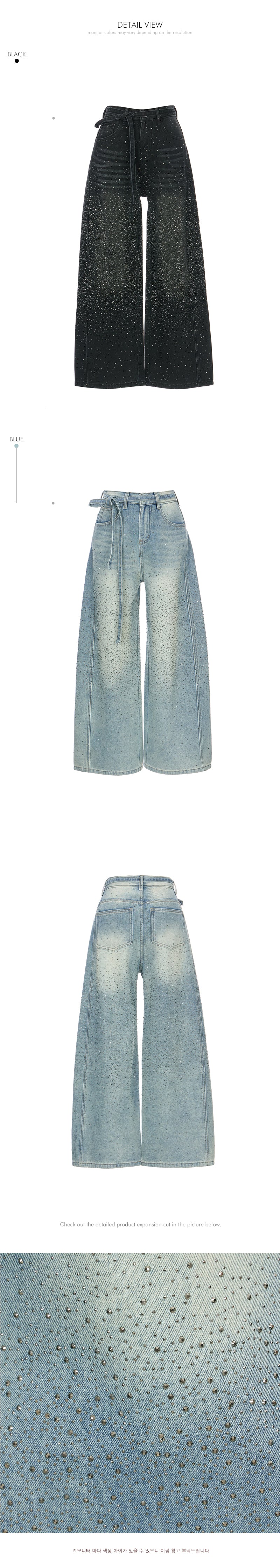 These strap set studded jeans offer a unique style.