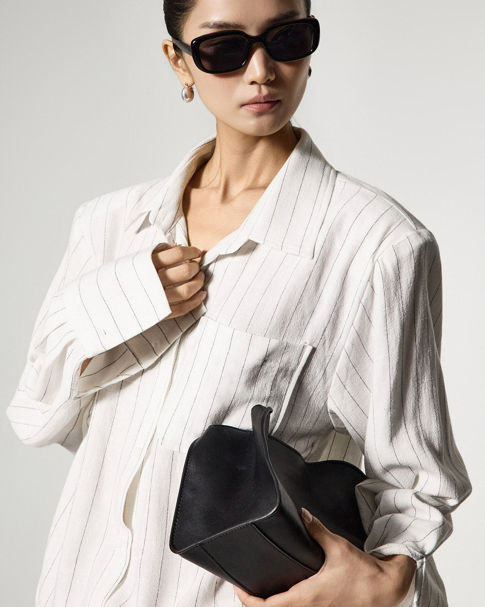 シャツカラーと胸ポケットのディテールがクラシックなムードを加え、
