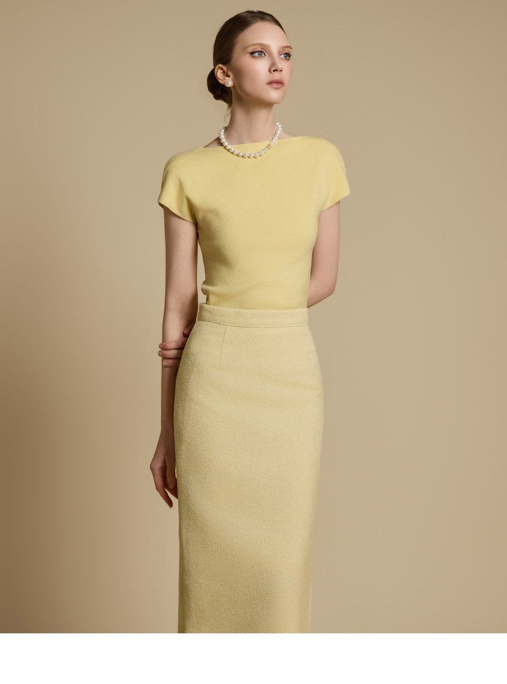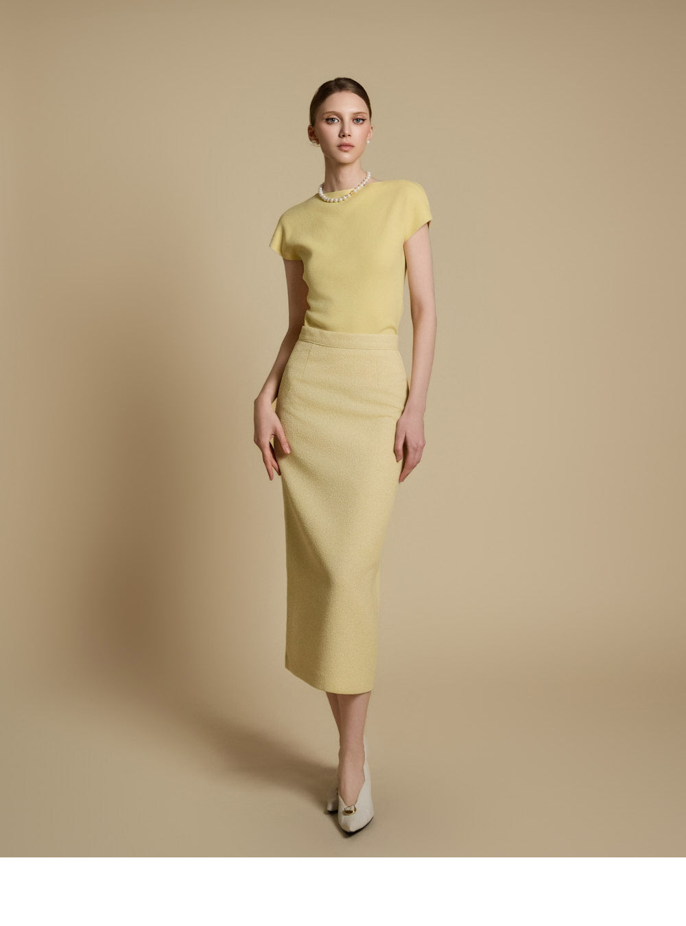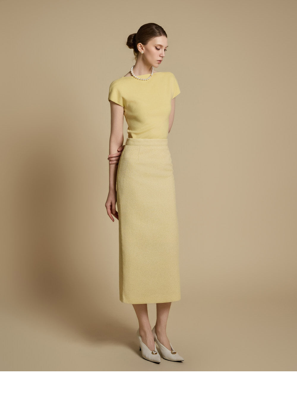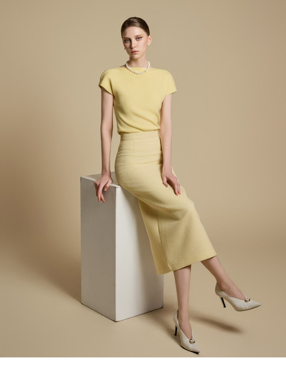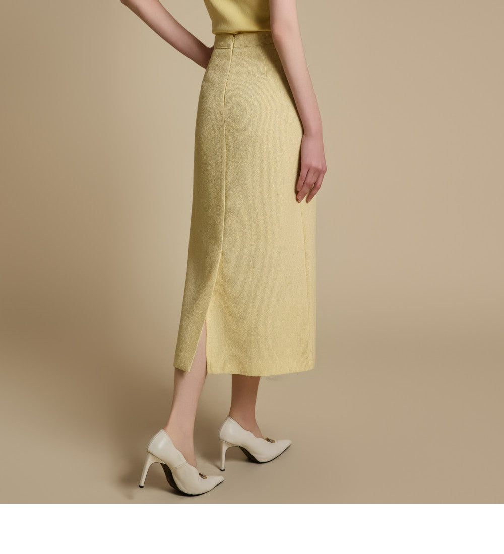 ミディ丈はウエストラインに沿ってすっきりと落ち、